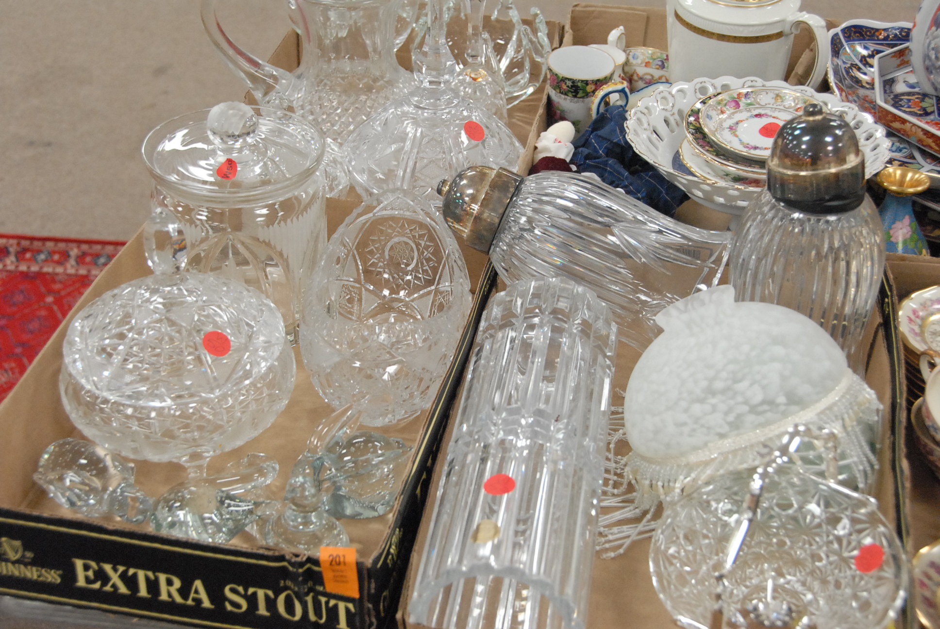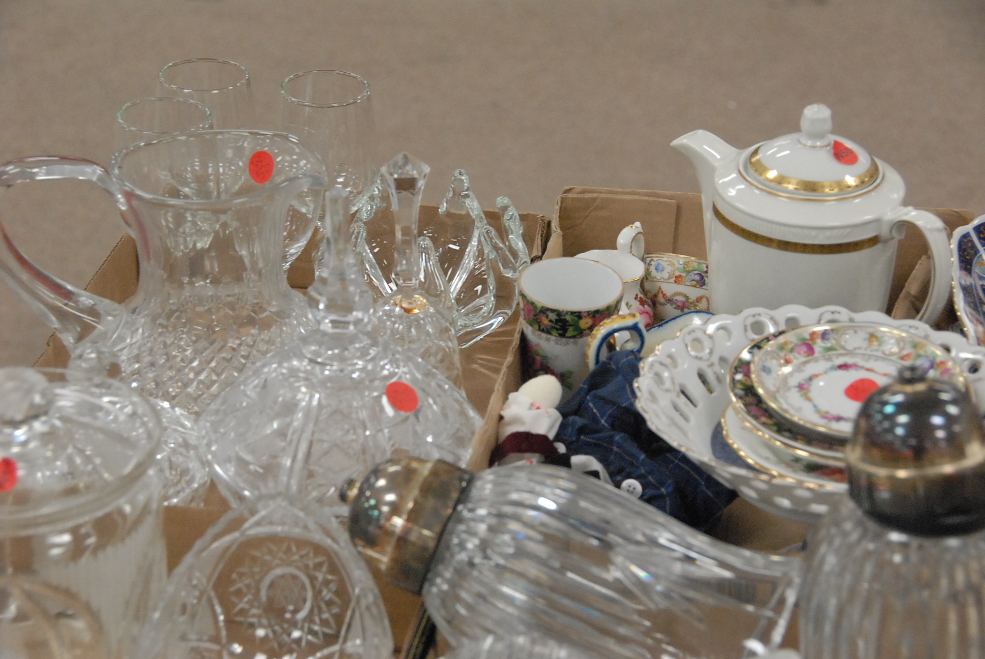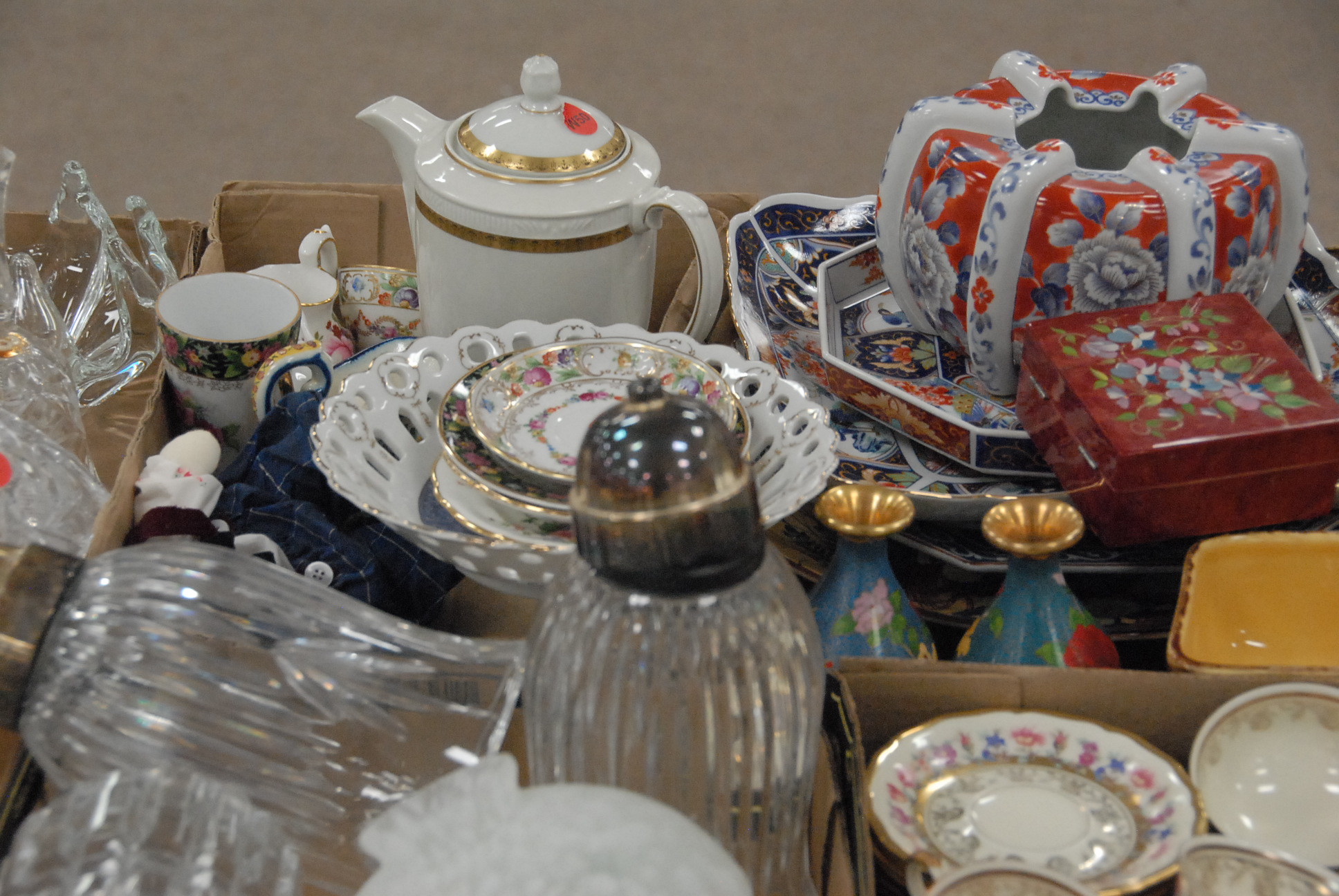 Six box lots including a small tea set, some reproduction Imari style plates, crystal bowls, vases, porcelain, and miscellaneous.