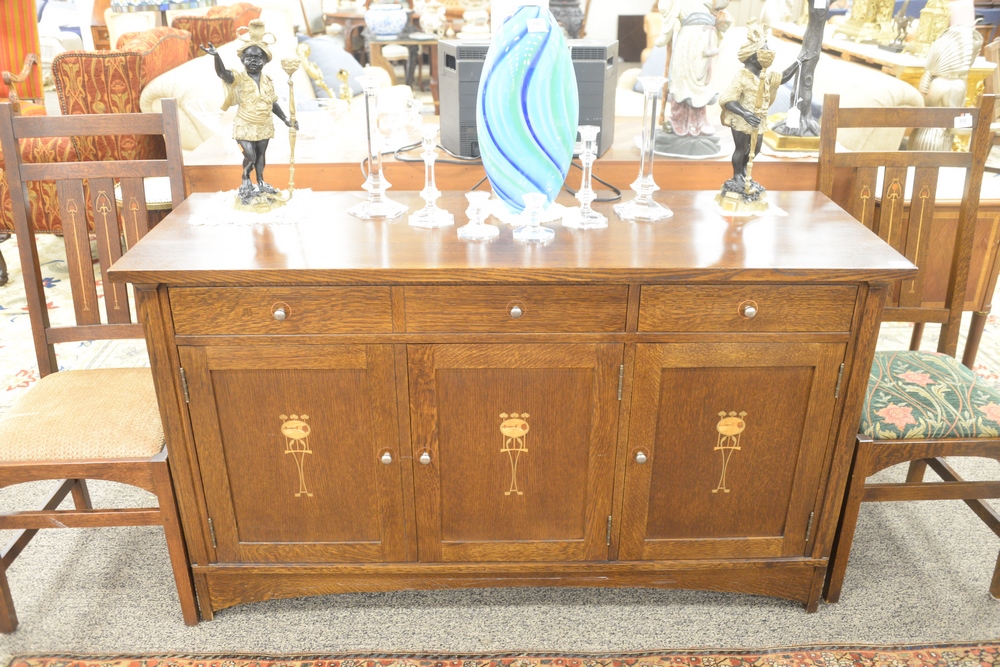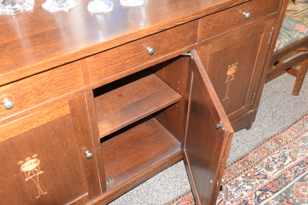 Stickley After Harvey Ellis Oak Inlaid Server, having three drawers over three doors, with stylized flower and landscape scene inlaid on each door, height 34 inches, top 20 1/4″ x 58 1/2″.