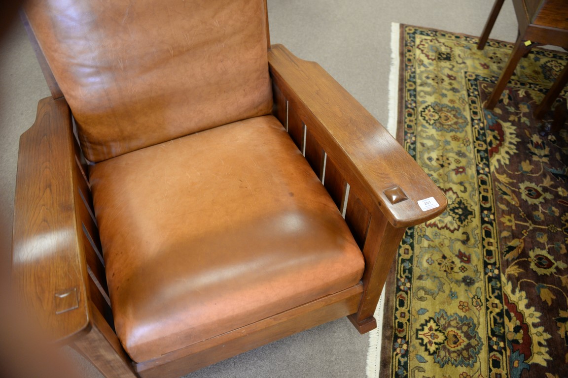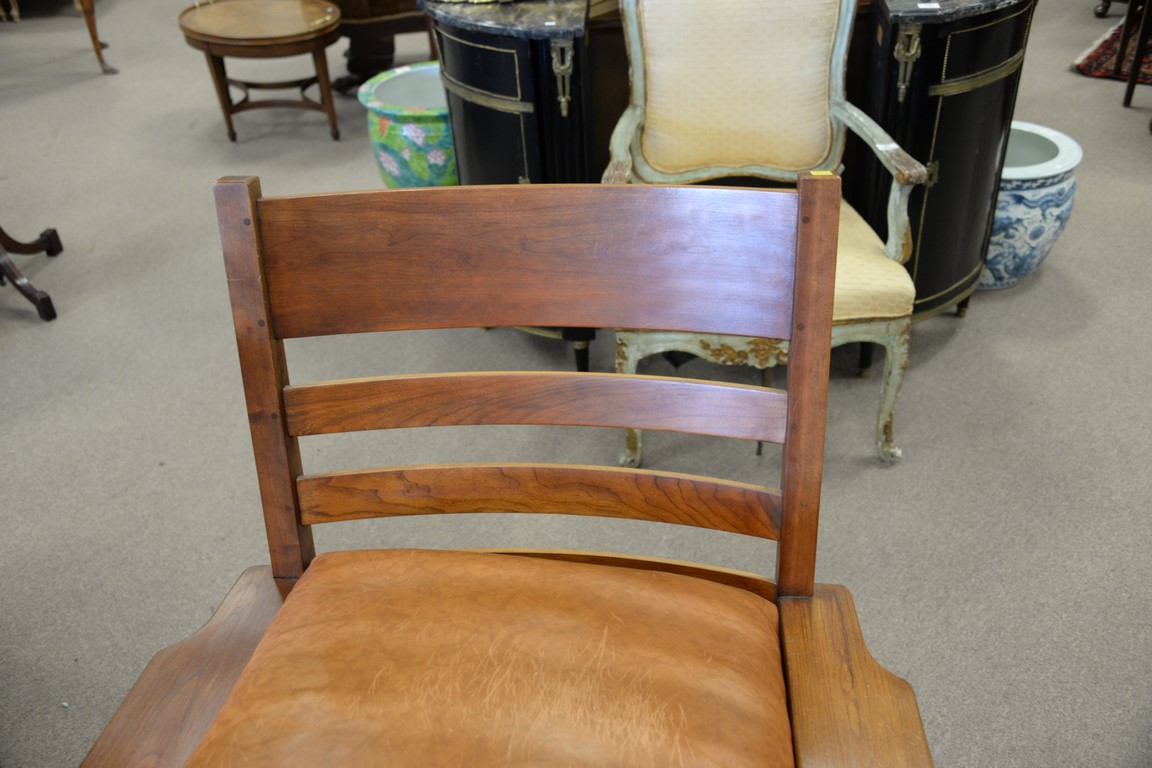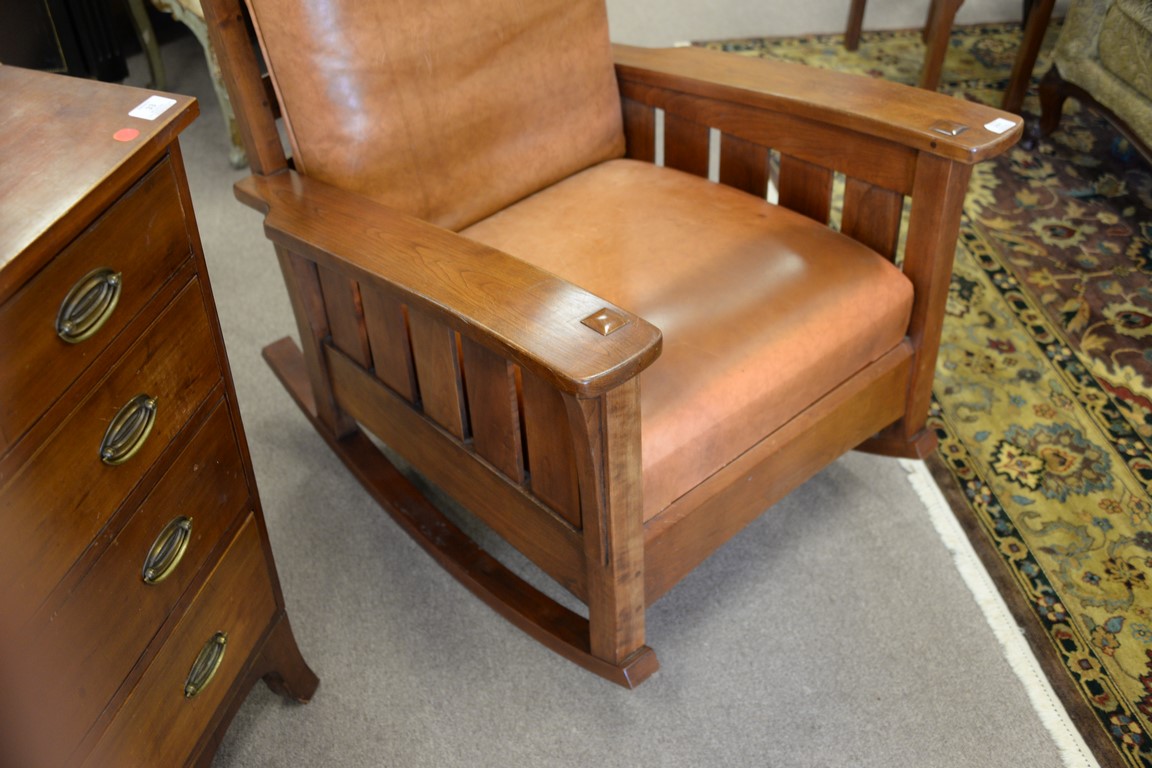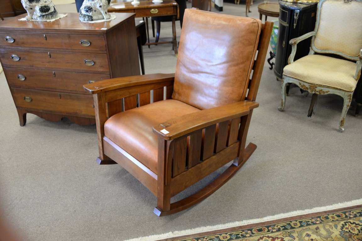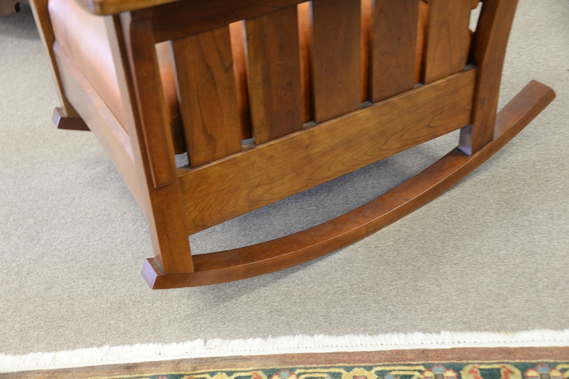 Stickley cherry mission style rocking chair with leather cushions.