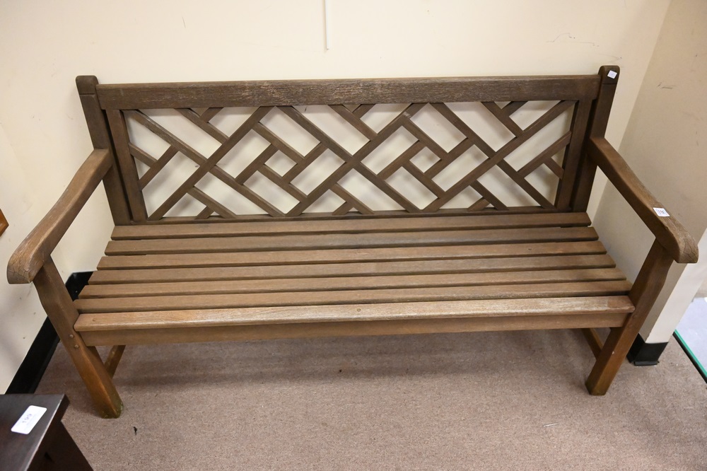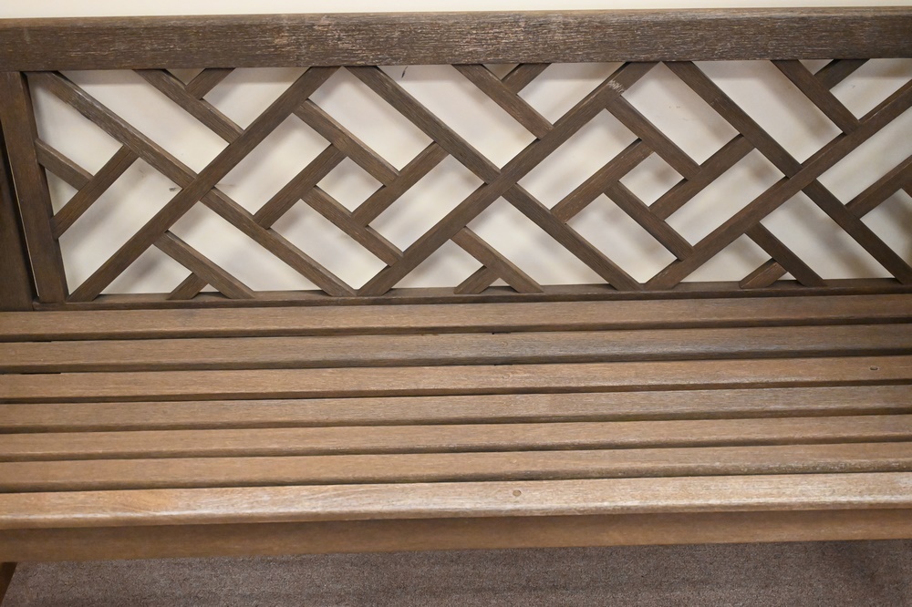 Lot 201: Teak Bench, having geometric openwork back, height 33 inches, length 60 inches. Provenance: Waterfront Estate, Stamford, CT.