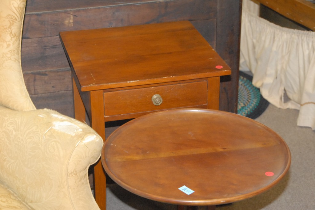 Three piece lot candlestand, one drawer stand, and Chippendale style upholstered wing chair.