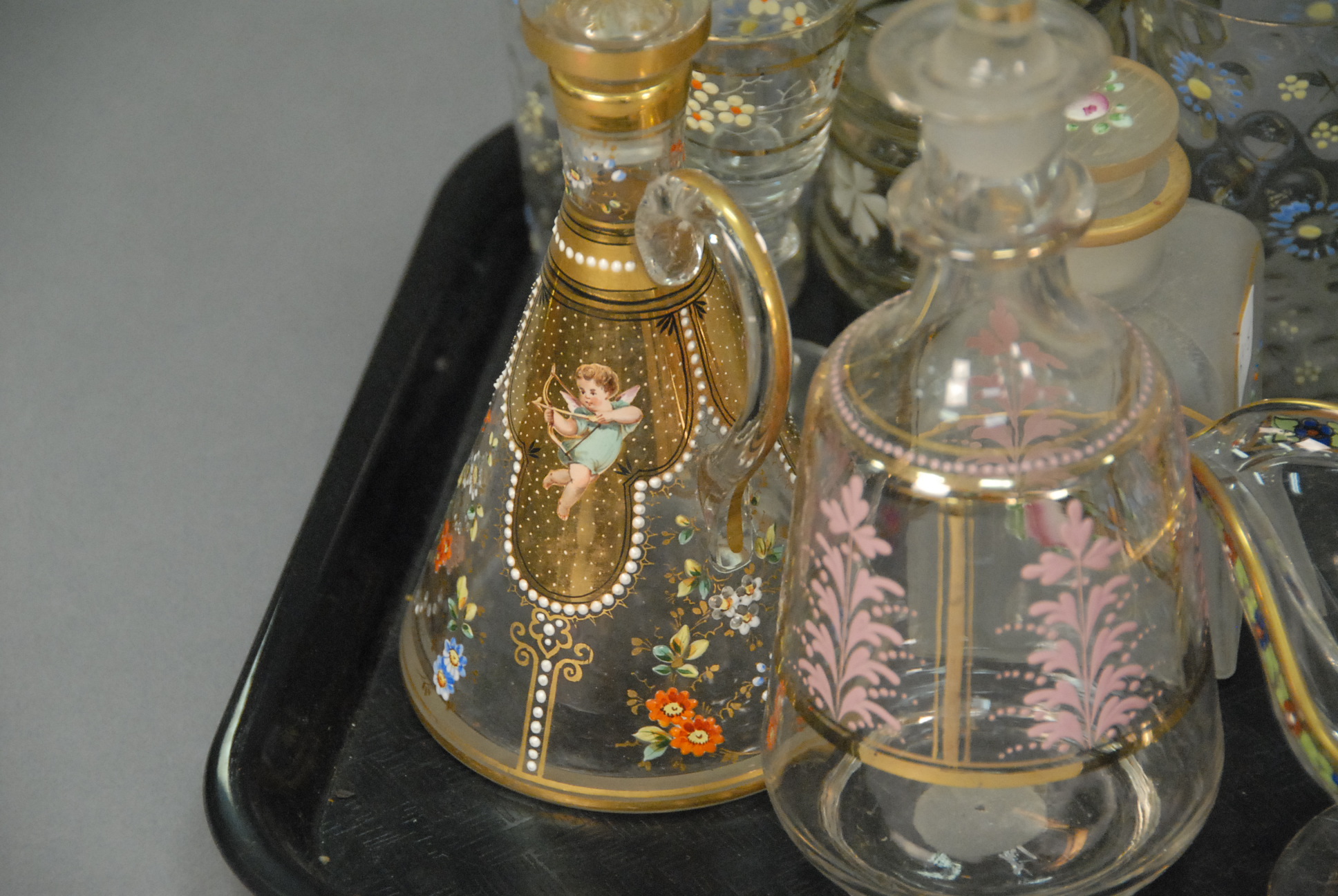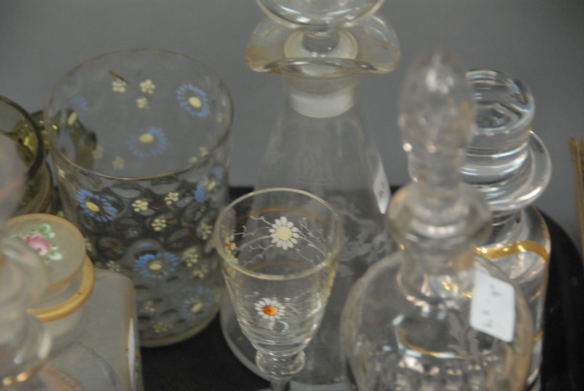Two boxes of crystal to include four decanters, enameled glass, and set of nine etched glasses with saucers.