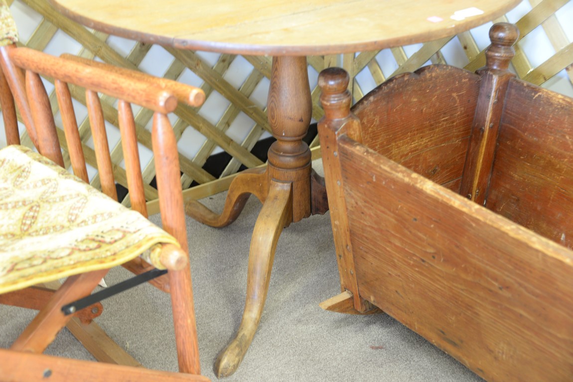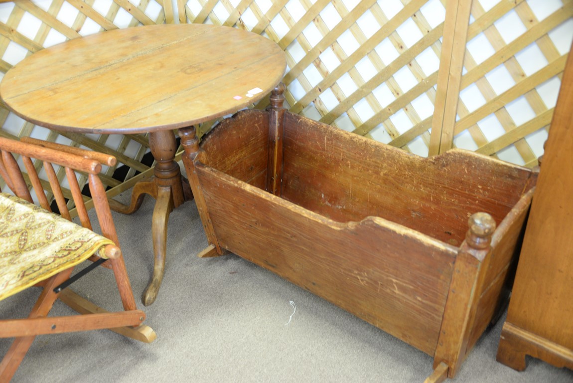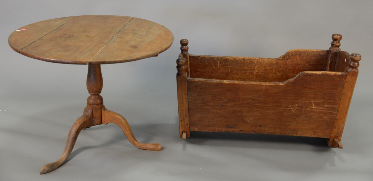 Two piece lot including Federal tip table and primitive cradle. table: ht. 27 1/2 in. dia. 35 in., cradle: lg. 40 in.