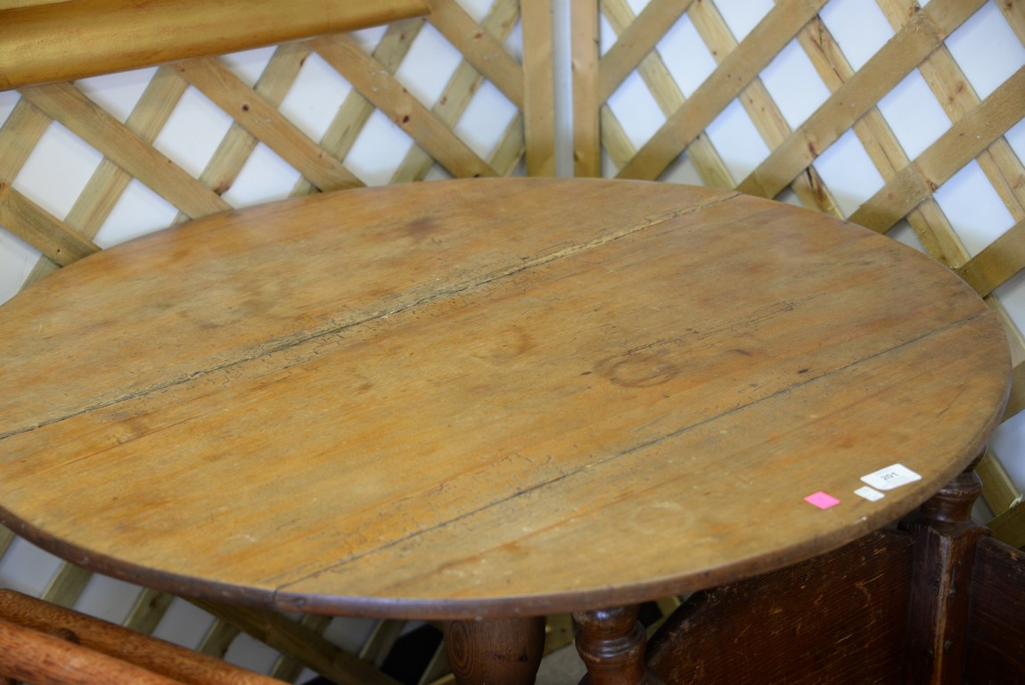 Lot 201: Two piece lot including Federal tip table and primitive cradle. table: ht. 27 1/2 in. dia. 35 in., cradle: lg. 40 in.