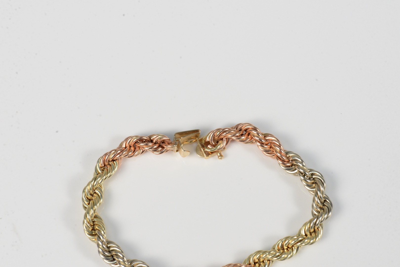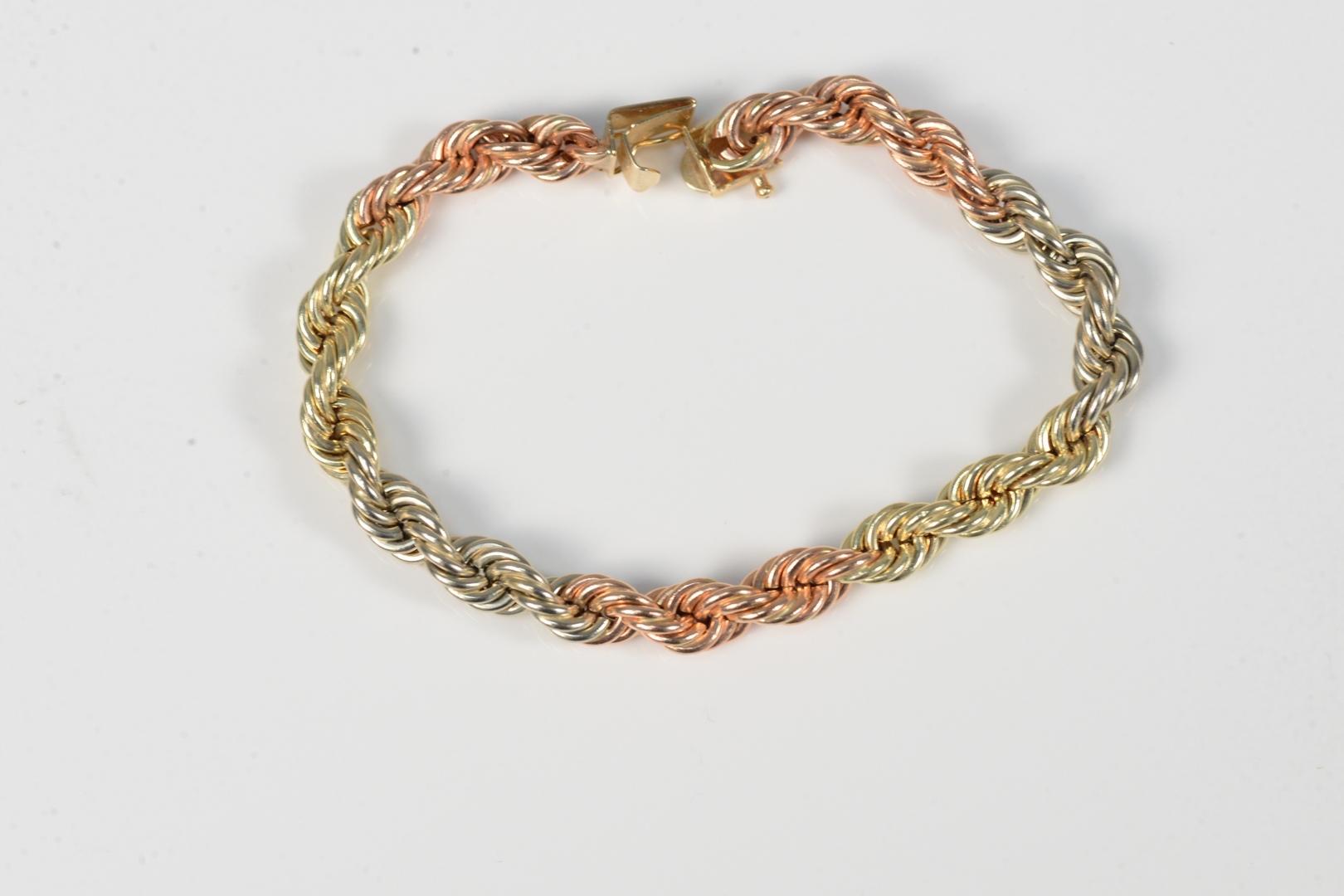 Lot 202: 14 Karat Gold Twist Bracelet tri-color gold length 7 1/4 inches 10.6 grams