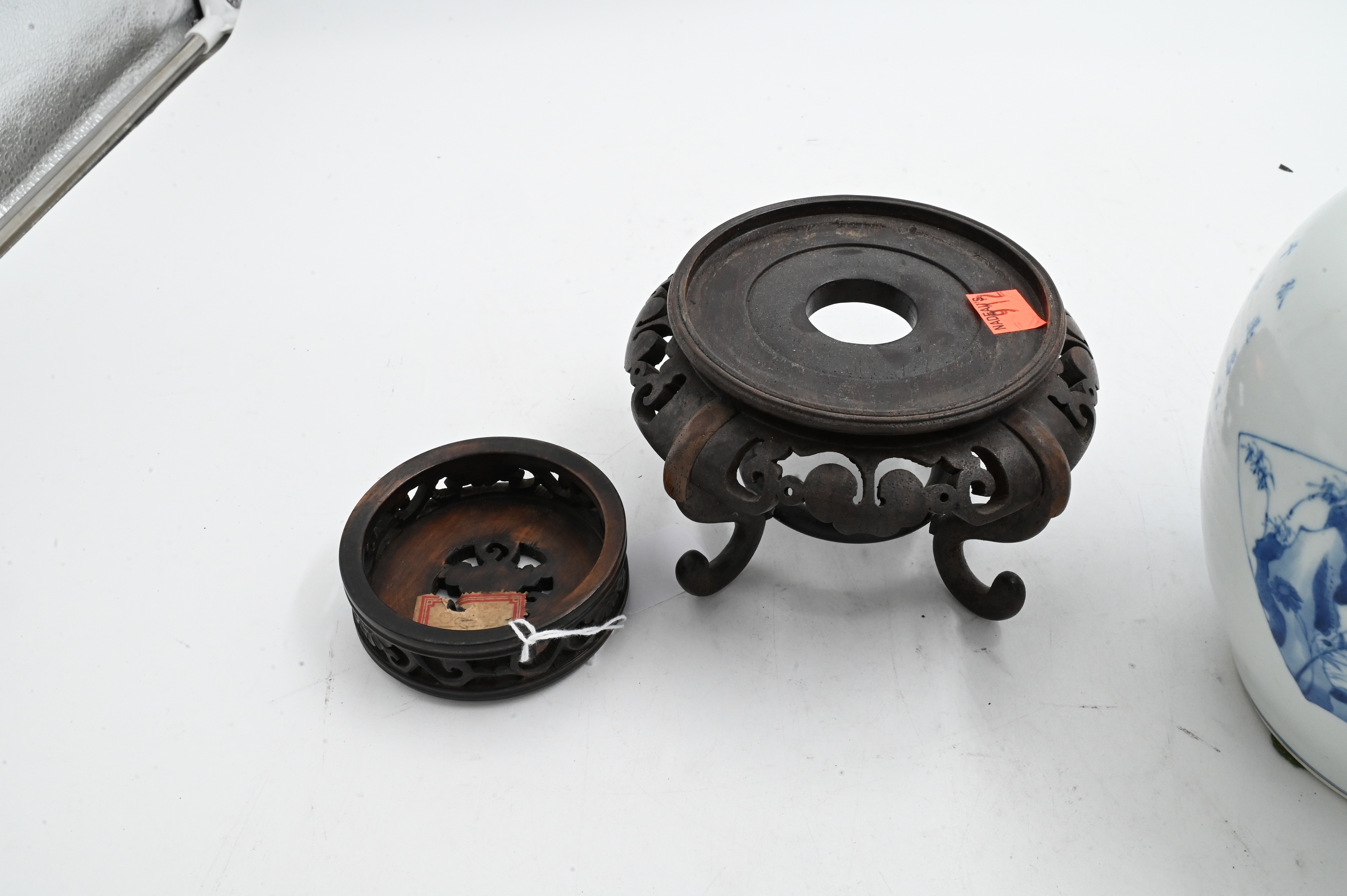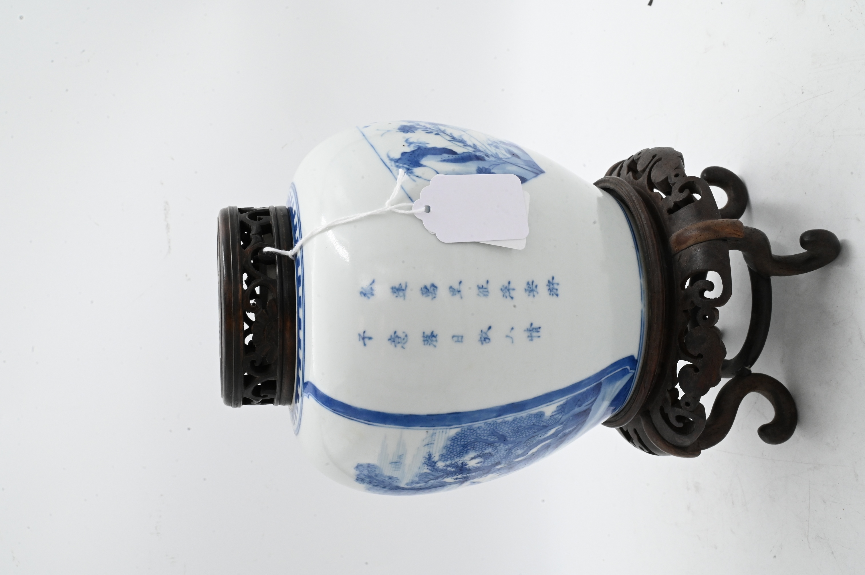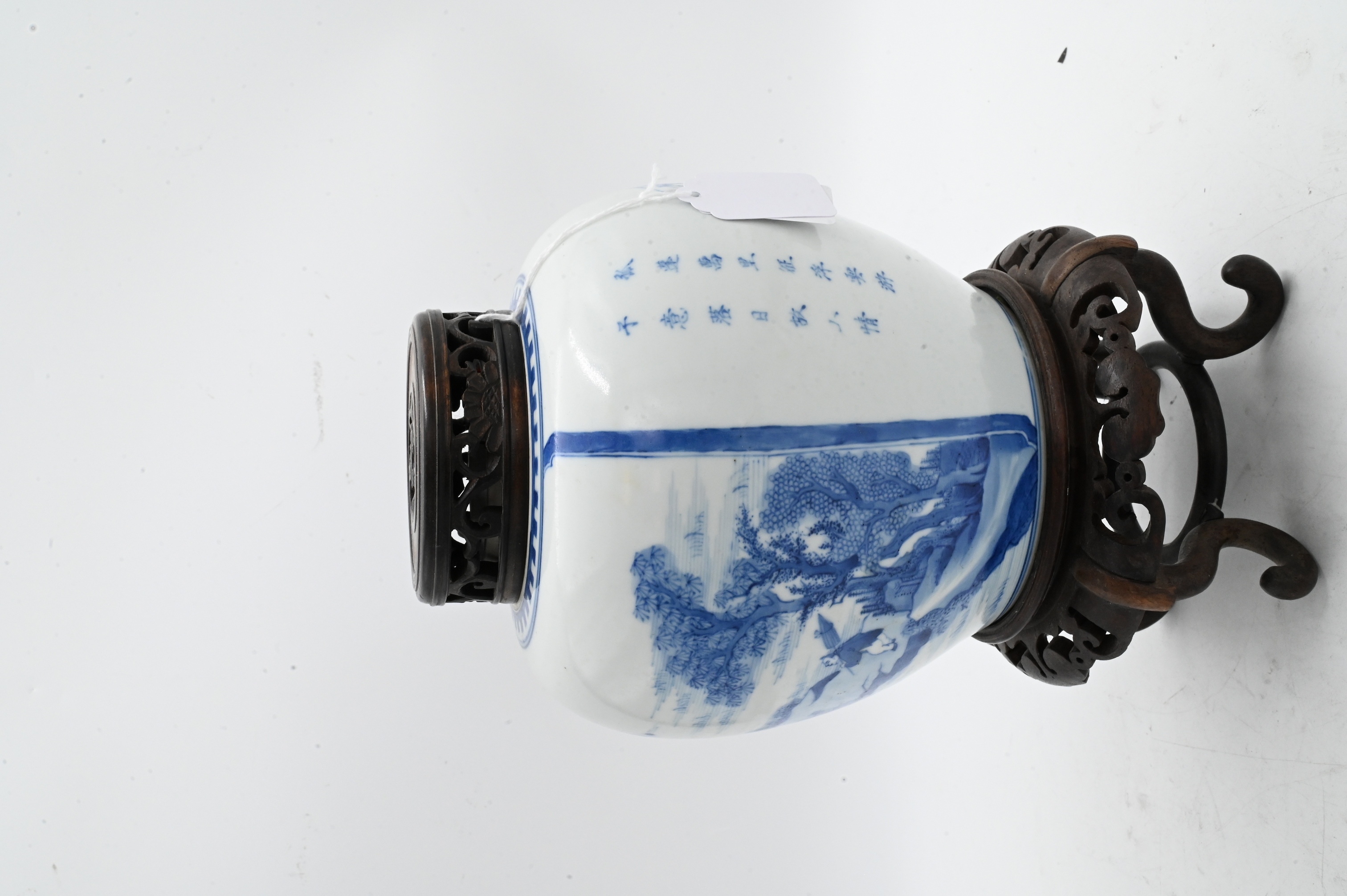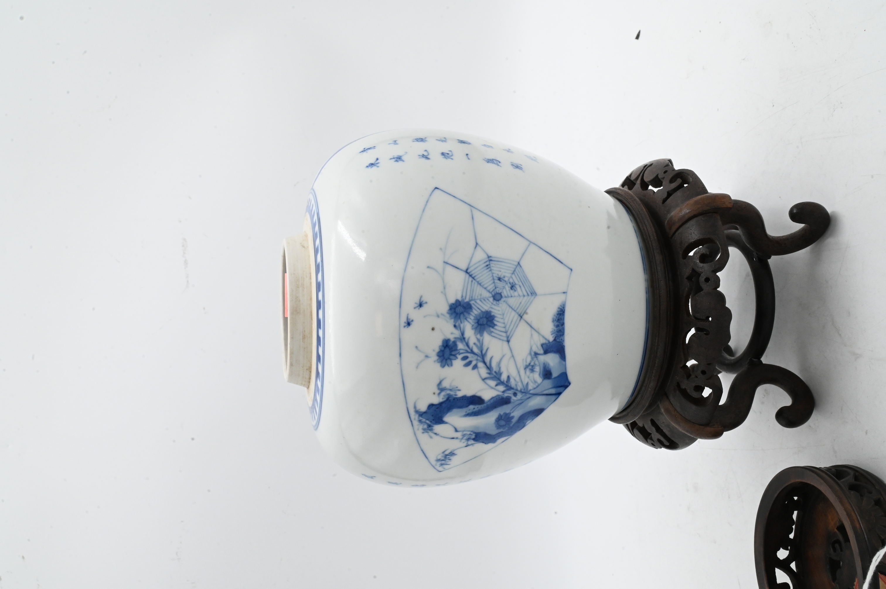 of tapering globular form having landscape motif with fishermen, river, and trees, the other side with fan shaped cartouche with spider web and flowers, carved and reticulated lid and wooden stand, 18th century