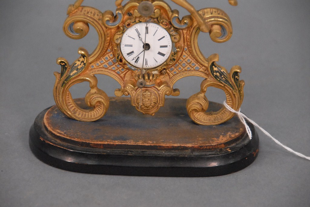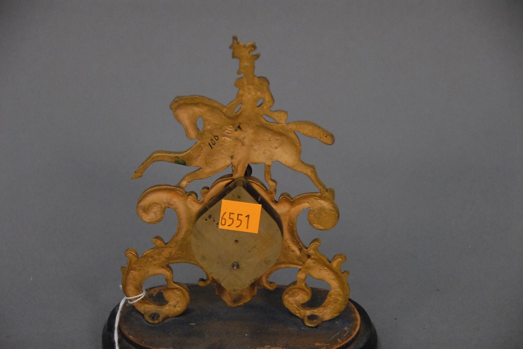 Lot 202: Continental gilt metal clock with horseman on top and porcelain dial and front pendulum, ht. 7 1/2.