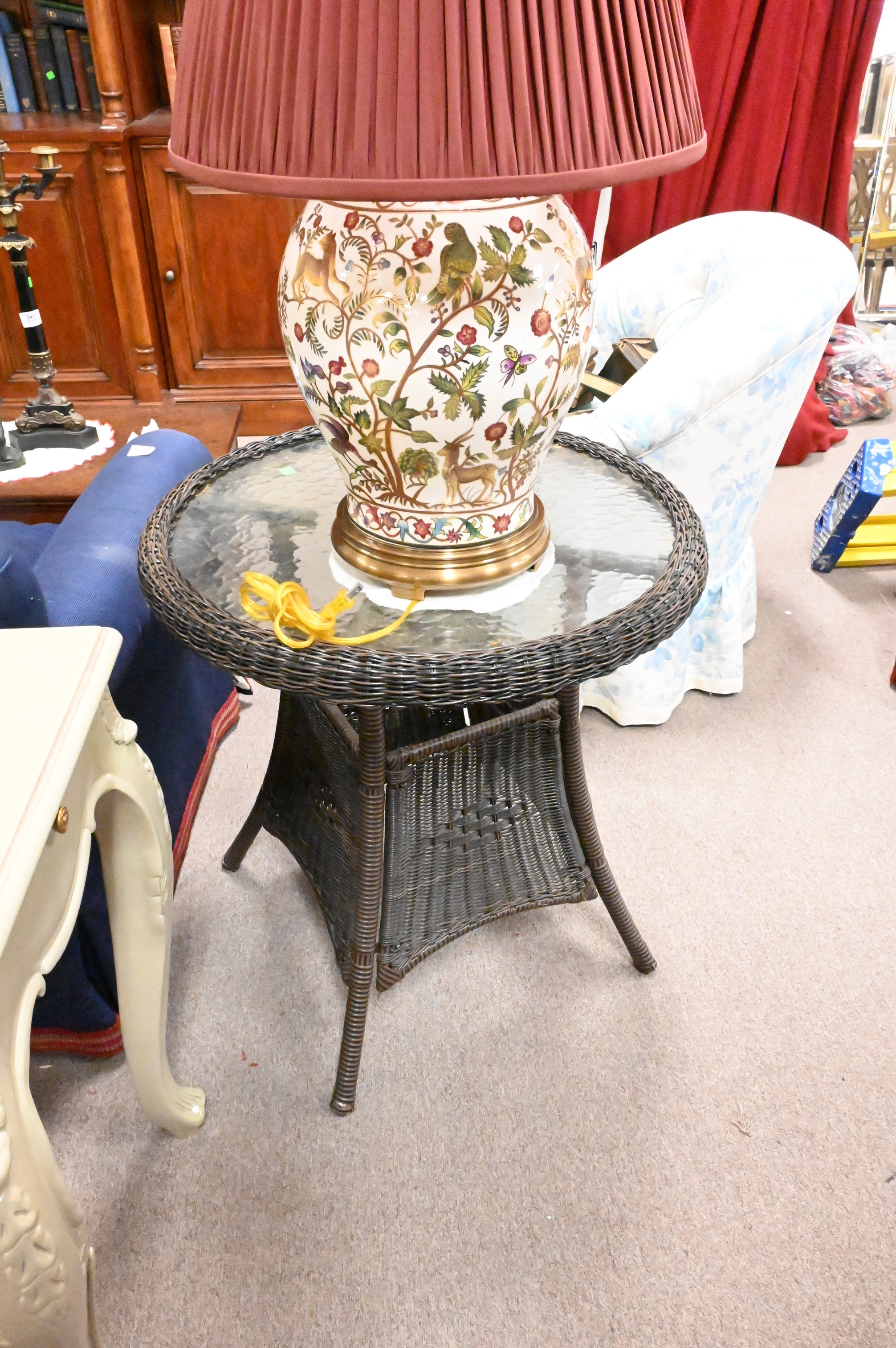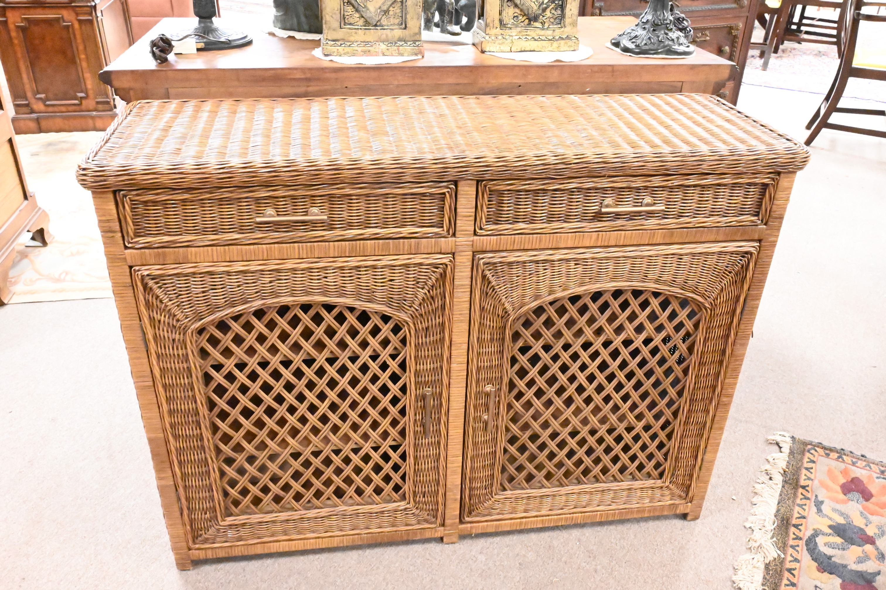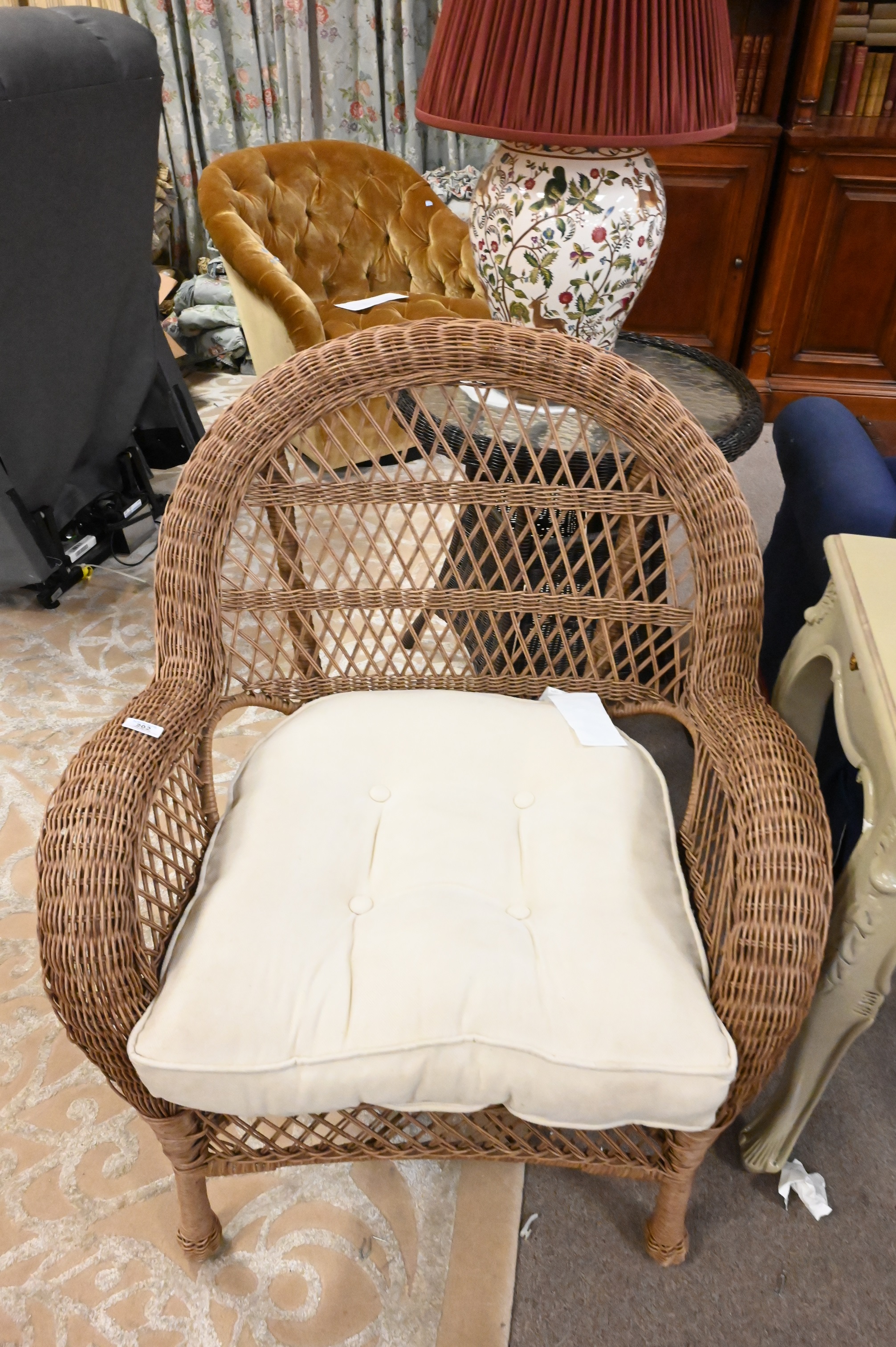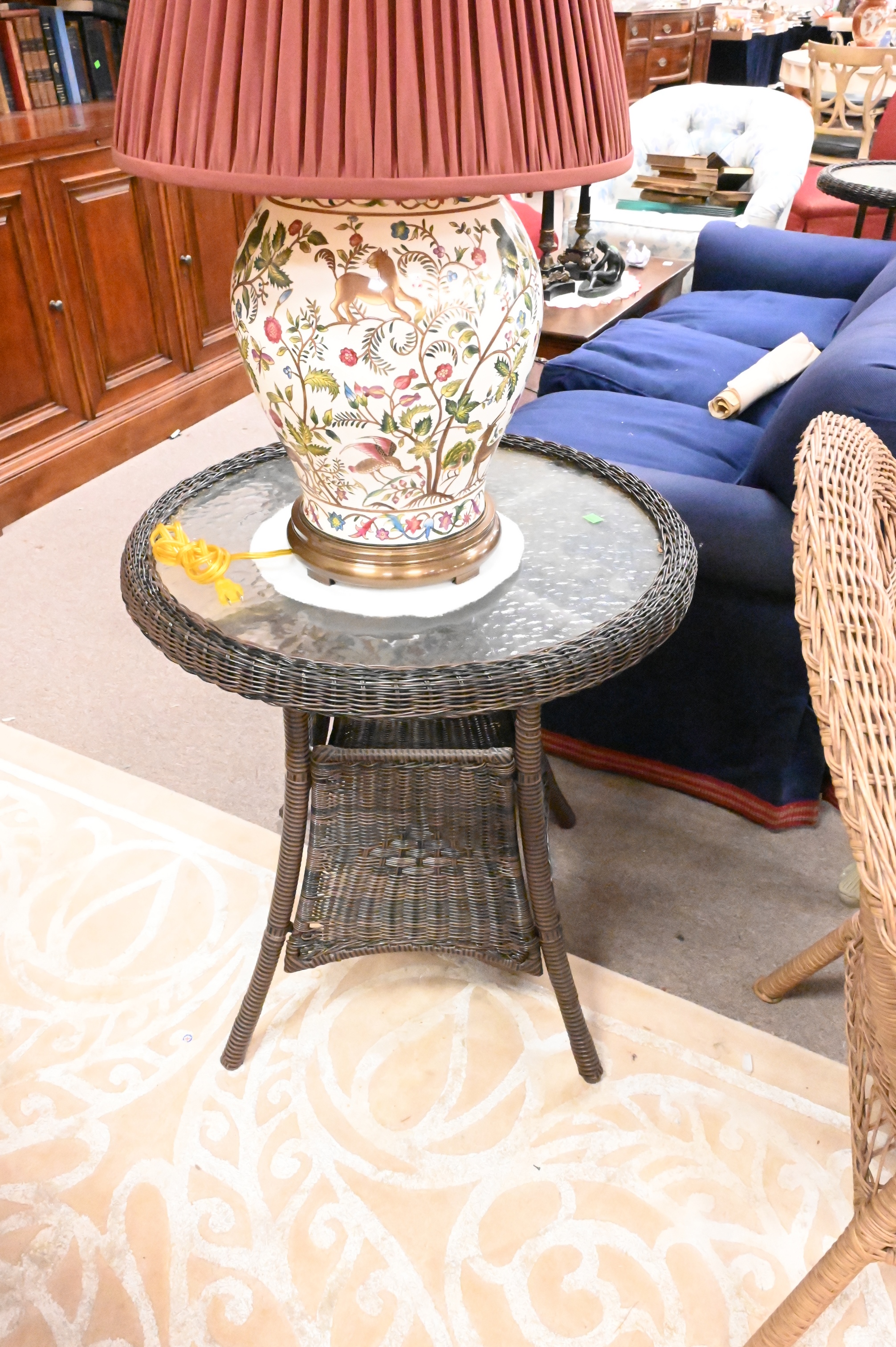 Four Piece Wicker Group, to include arm chair (height 36 inches), pair of round stands with glass tops and a server (height 34 inches, top 15″ x 45″)