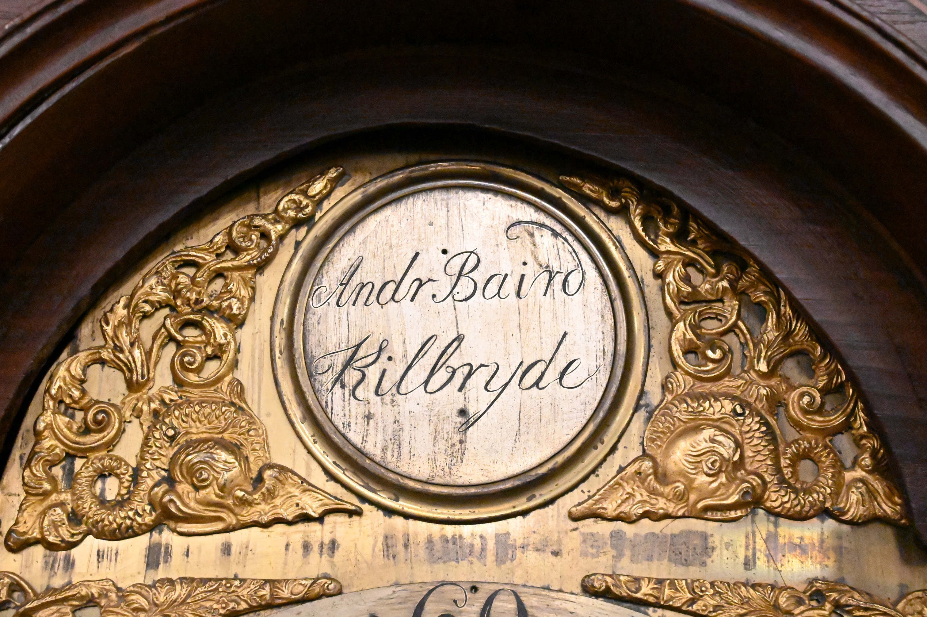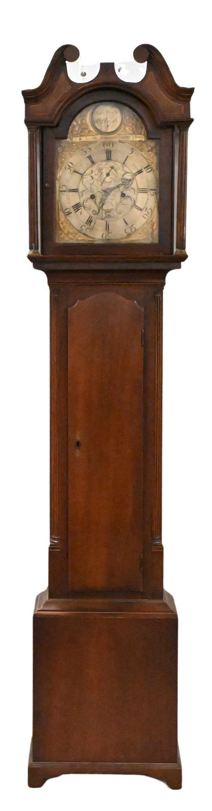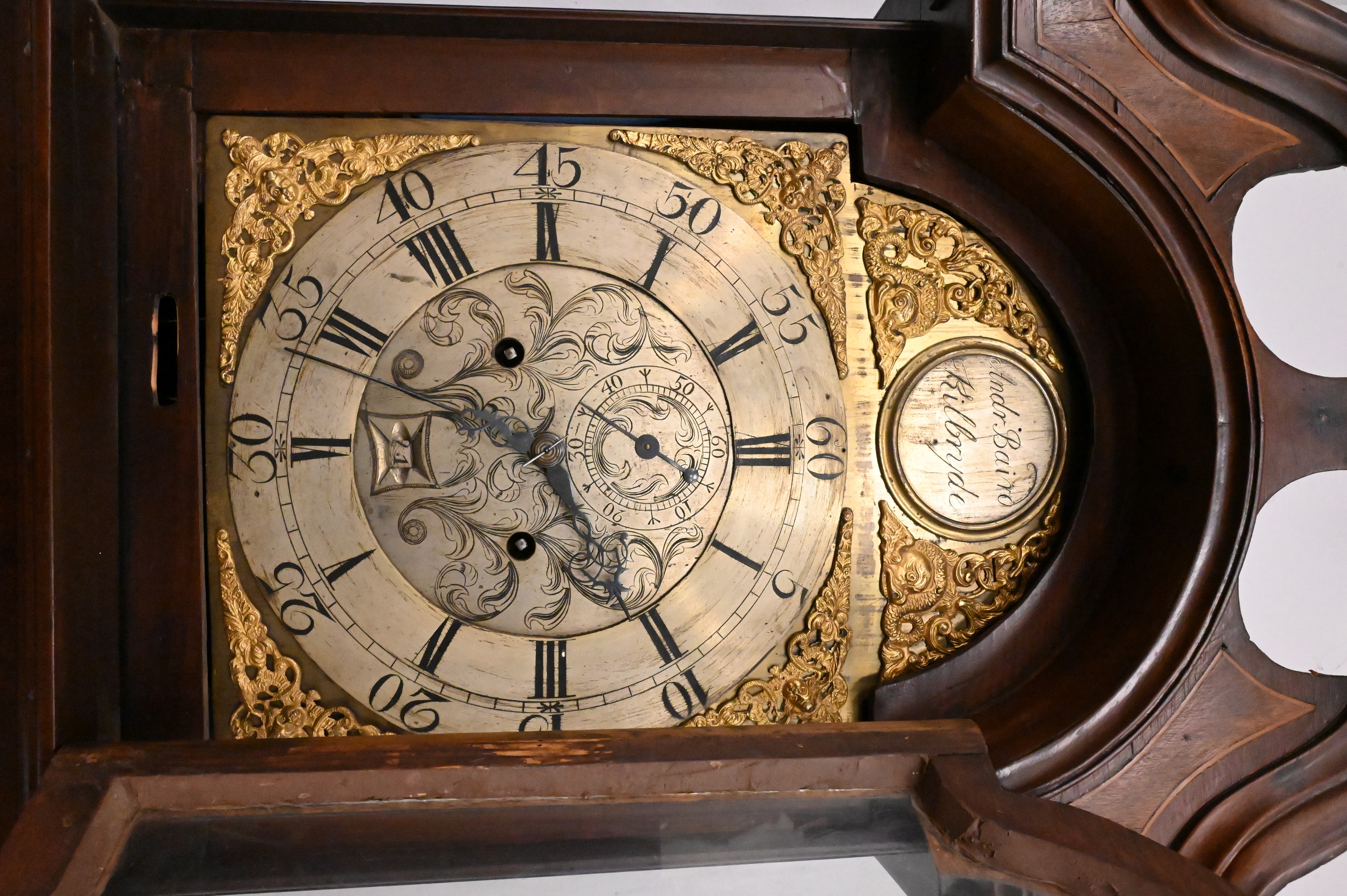 with swans neck pediment over tombstone dial flanked by fluted columns over door with fluted columns, brass dial with calendar and second hand with putti spandrels, signed Andr Baird Kilbryde
