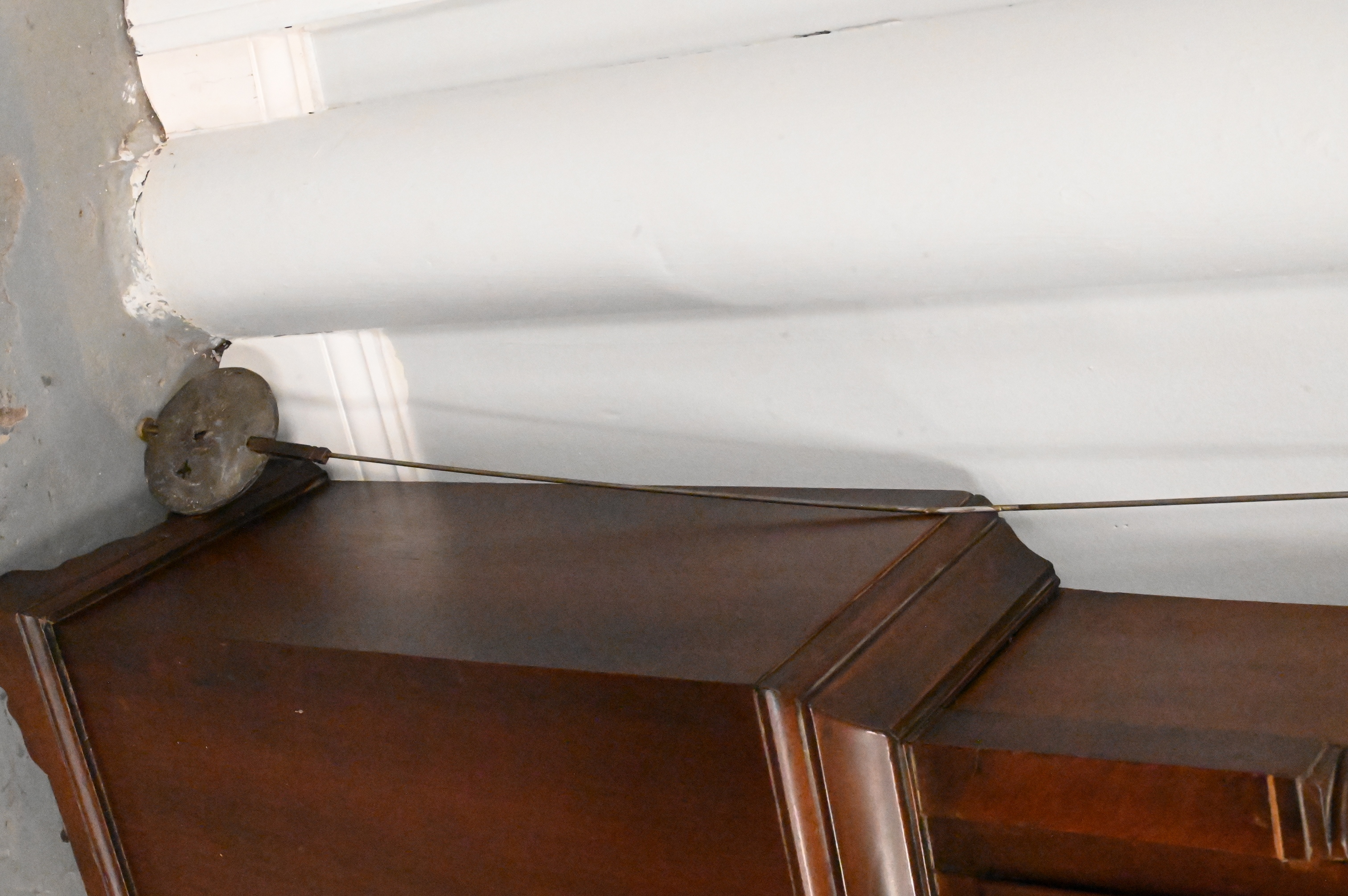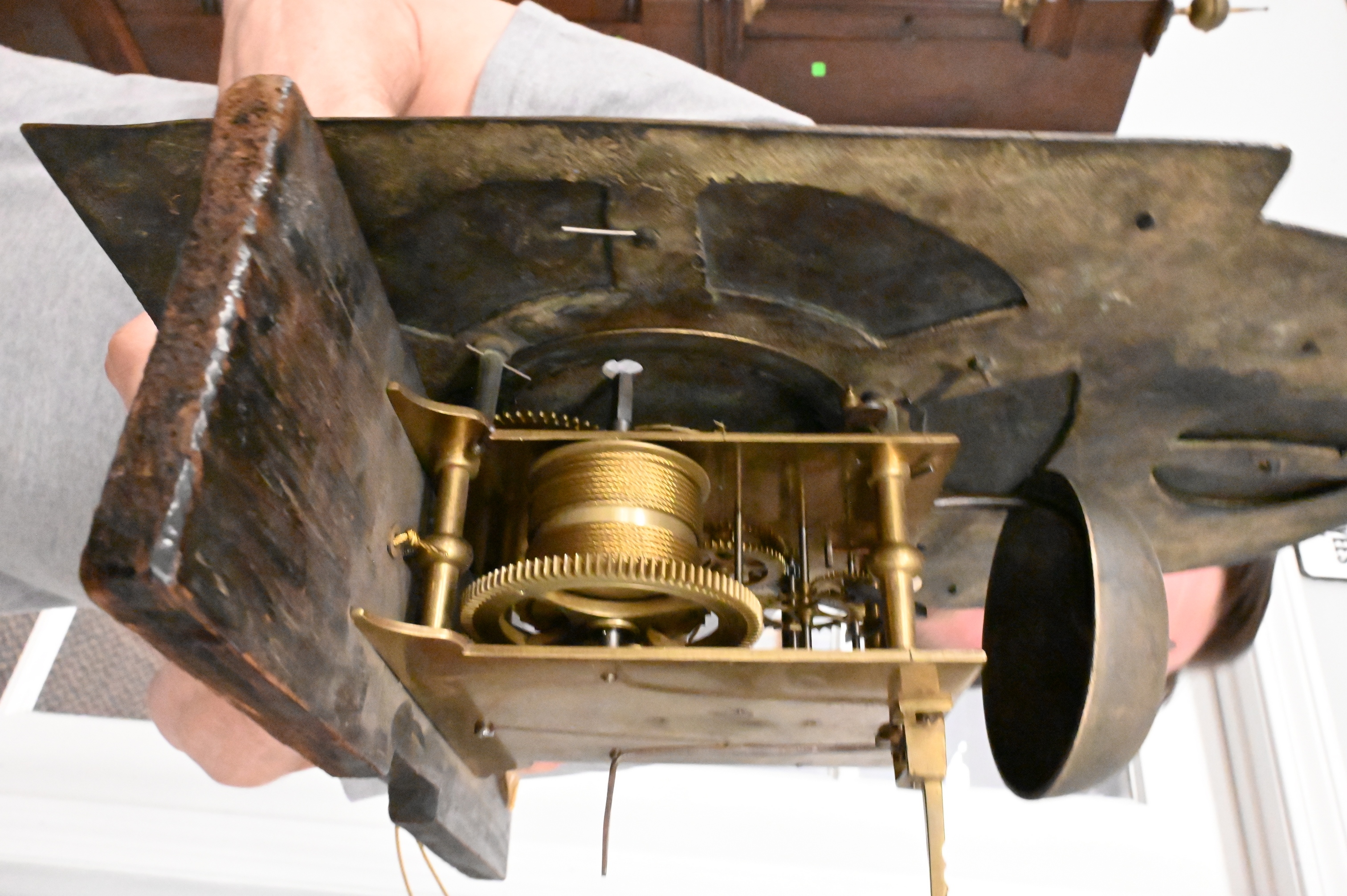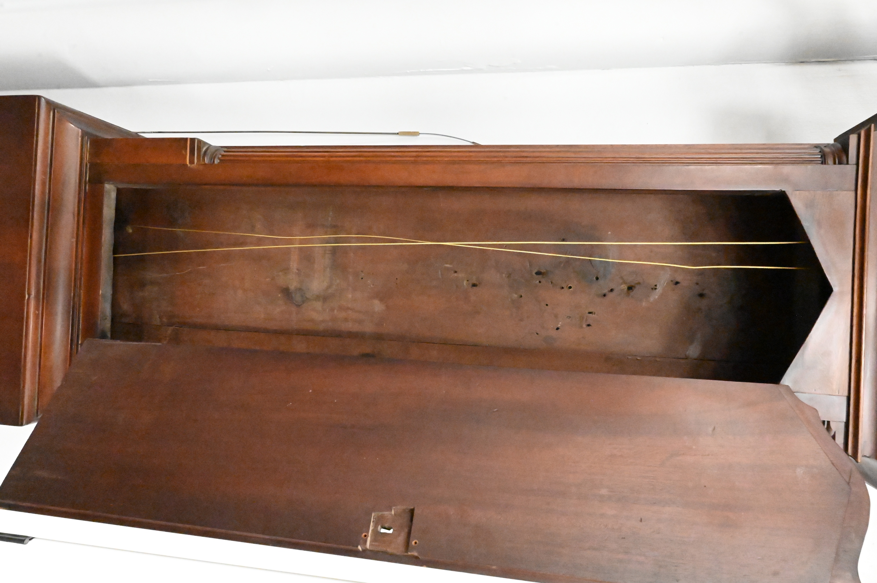 with swans neck pediment over tombstone dial flanked by fluted columns over door with fluted columns, brass dial with calendar and second hand with putti spandrels, signed Andr Baird Kilbryde