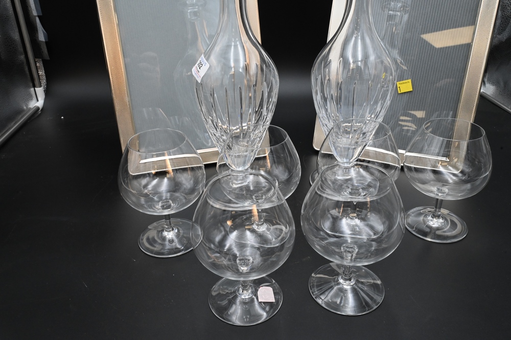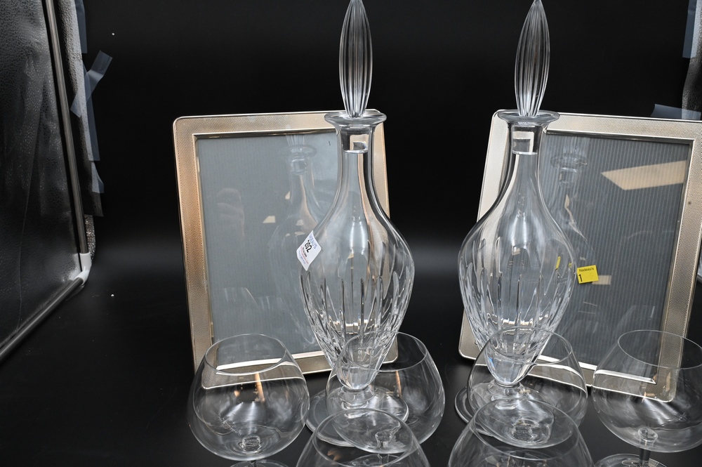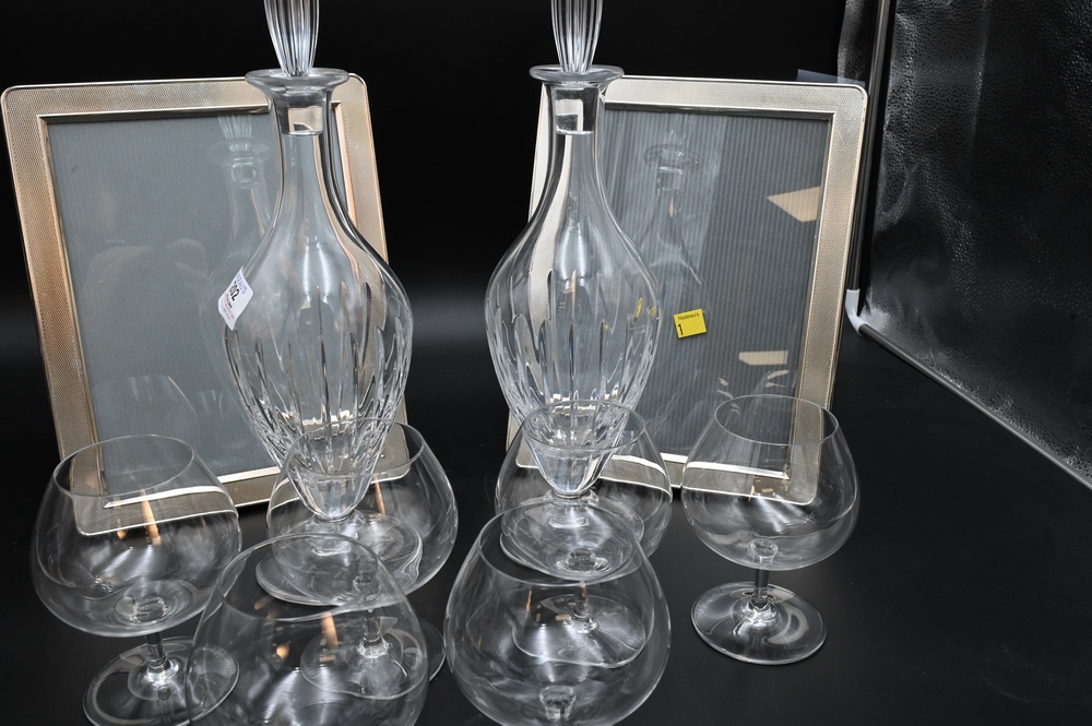 Lot 202: Group of Crystal, to include pair of Christofle bottles with a set of 6 Baccarat brady sniffers, along with two Christofle silverplate frames, bottle height 5 inches, sniffer height 15 inches.