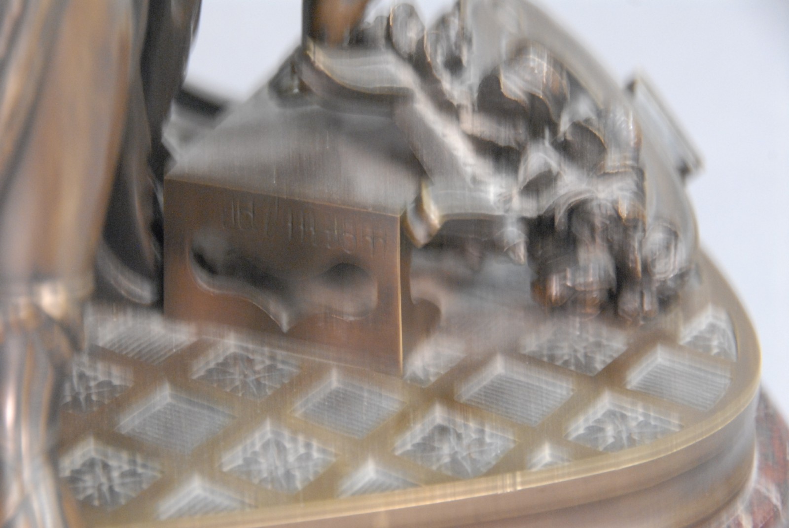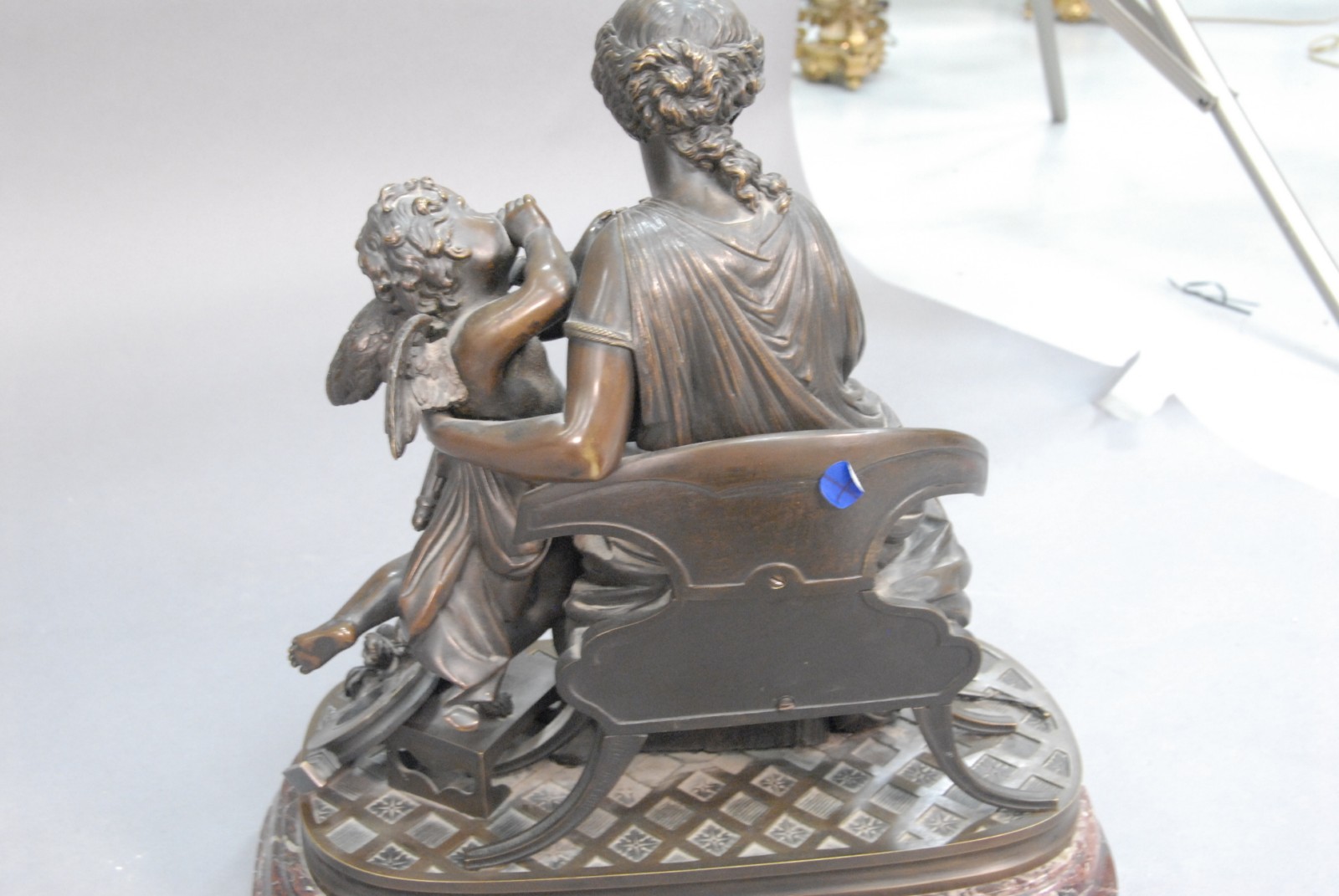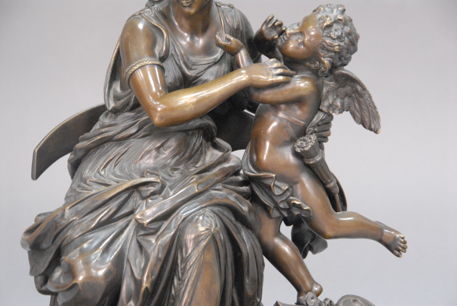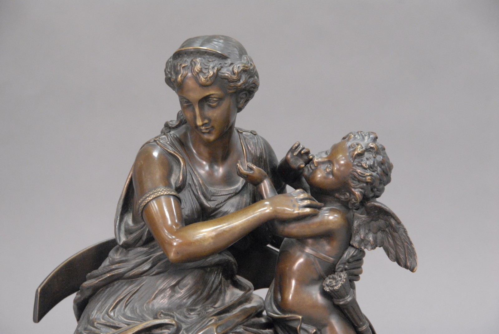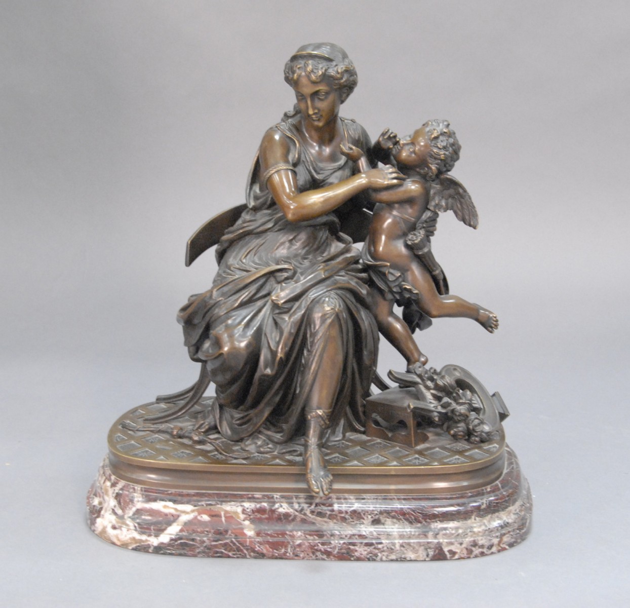 Jean Jules Salmson French 1823 – 1902 FIGURE OF A SEATED WOMAN WITH CUPID JUMPING INTO HER ARMS bronze on marble base signed on base Salmson.