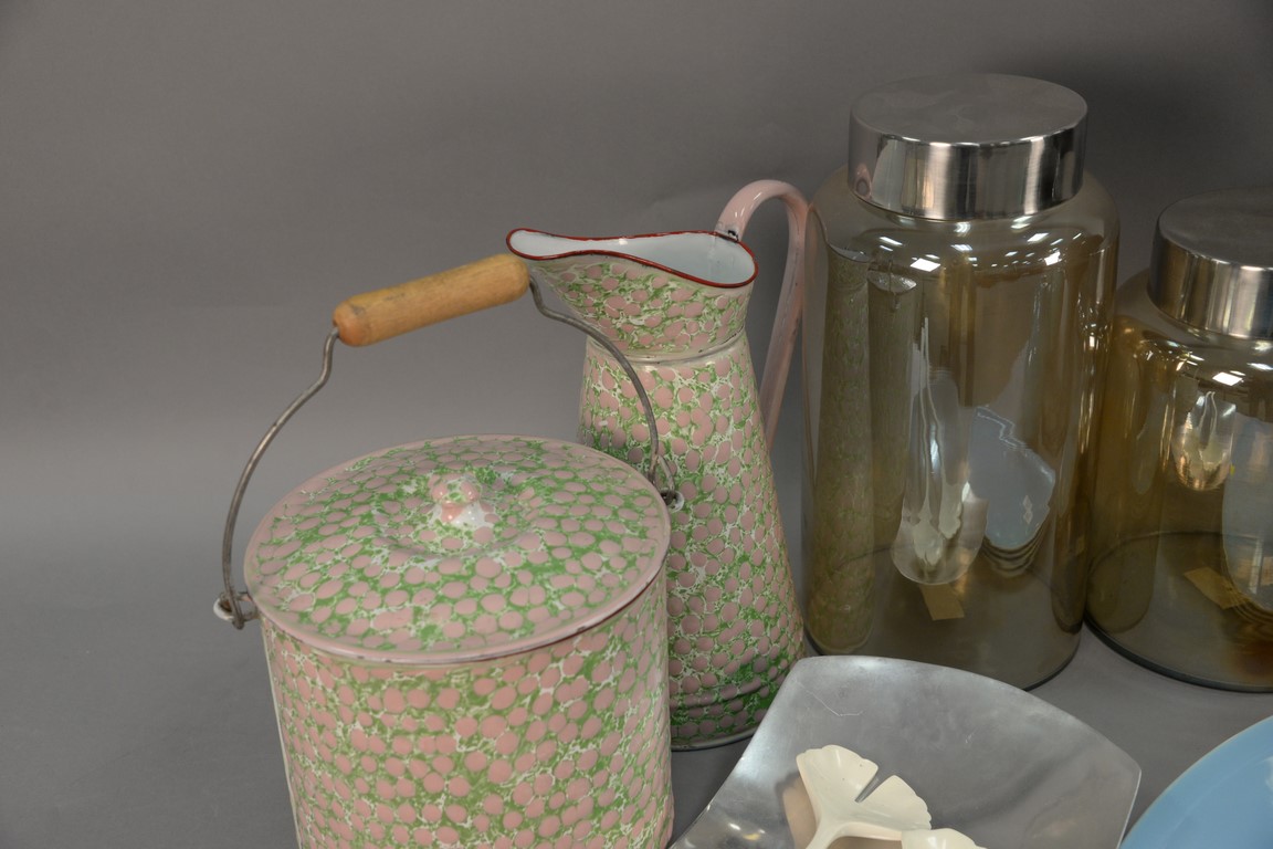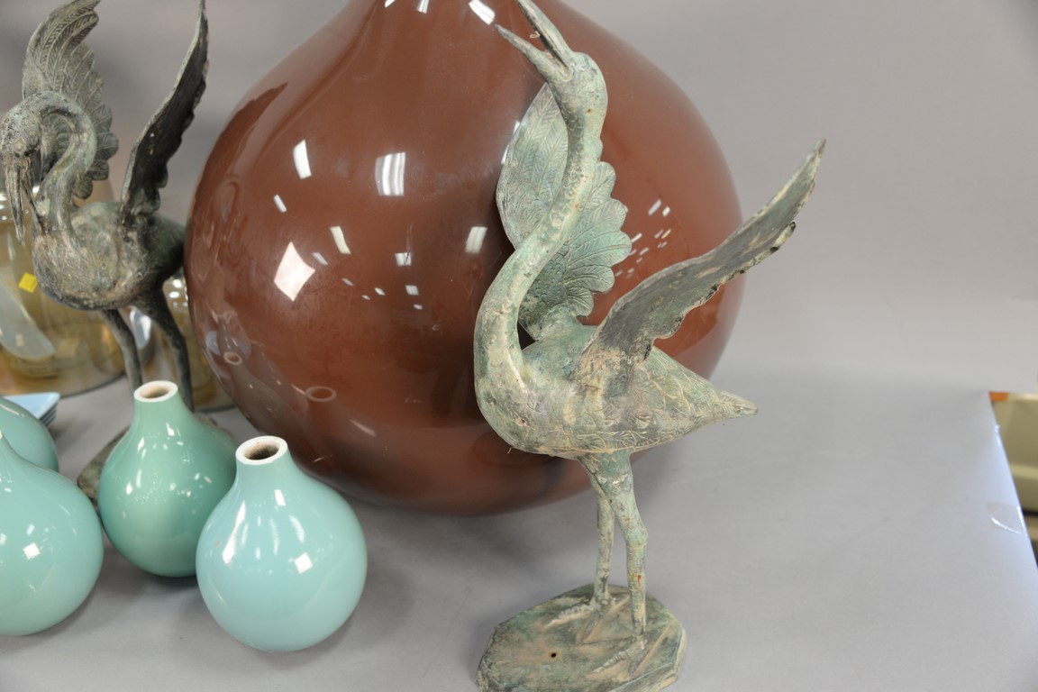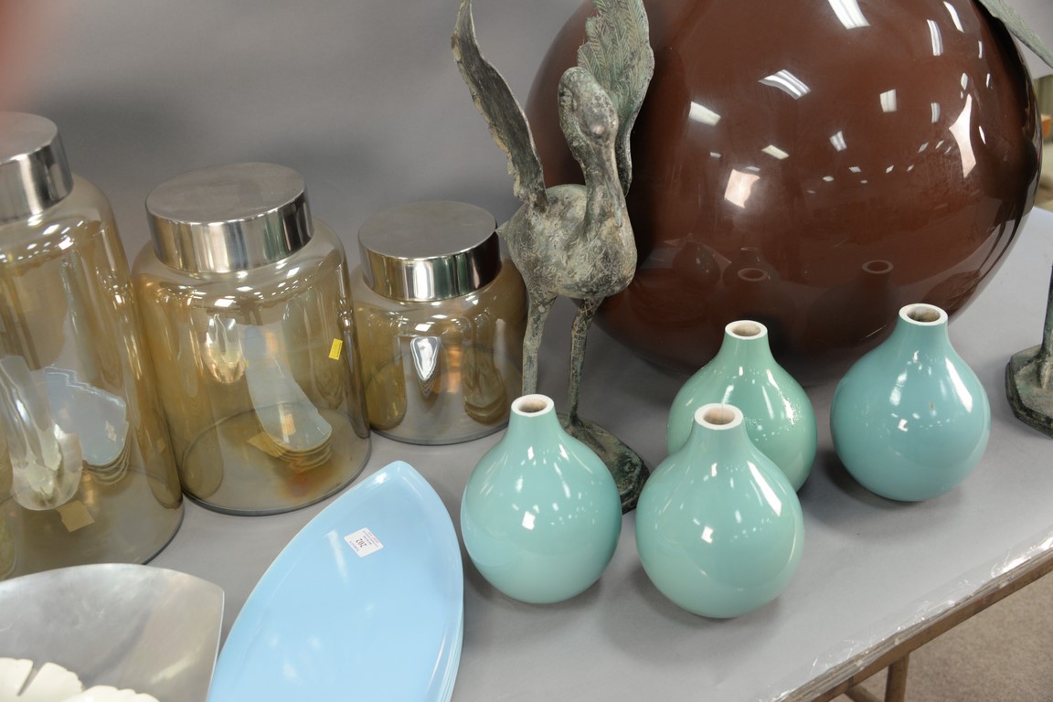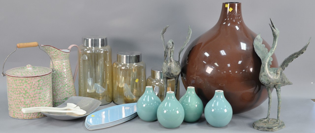 Large group of items to include three covered glass containers by Lazy Susan, set of four vases, four Crate & Barrel dishes, enameled pitcher and covered pot, number 623 pewter bowl, two outdoor bird figures, and brown boulbous vase. ht. 9in. to 27in.
