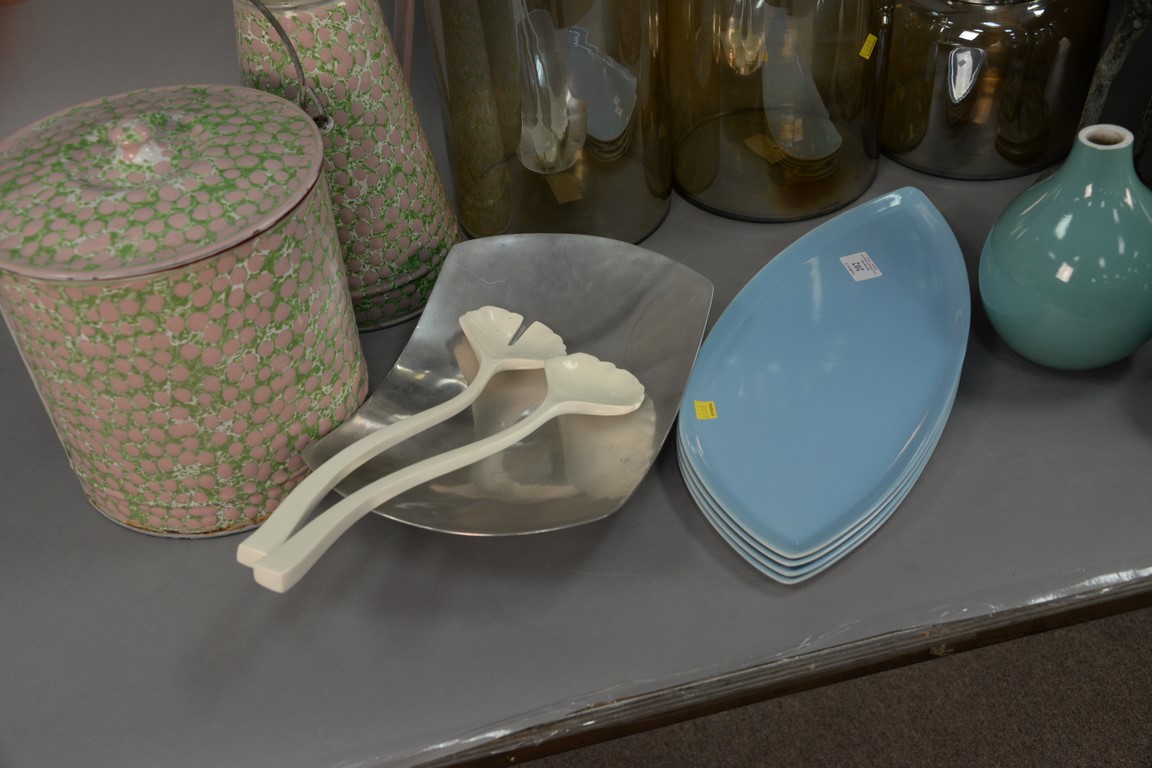 Lot 202: Large group of items to include three covered glass containers by Lazy Susan, set of four vases, four Crate & Barrel dishes, enamele…