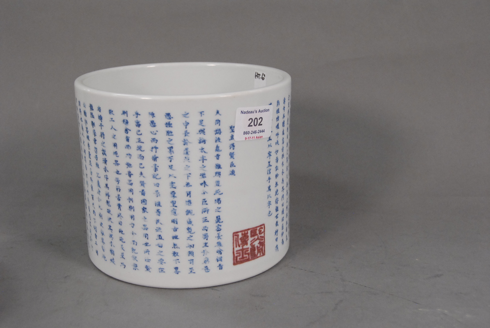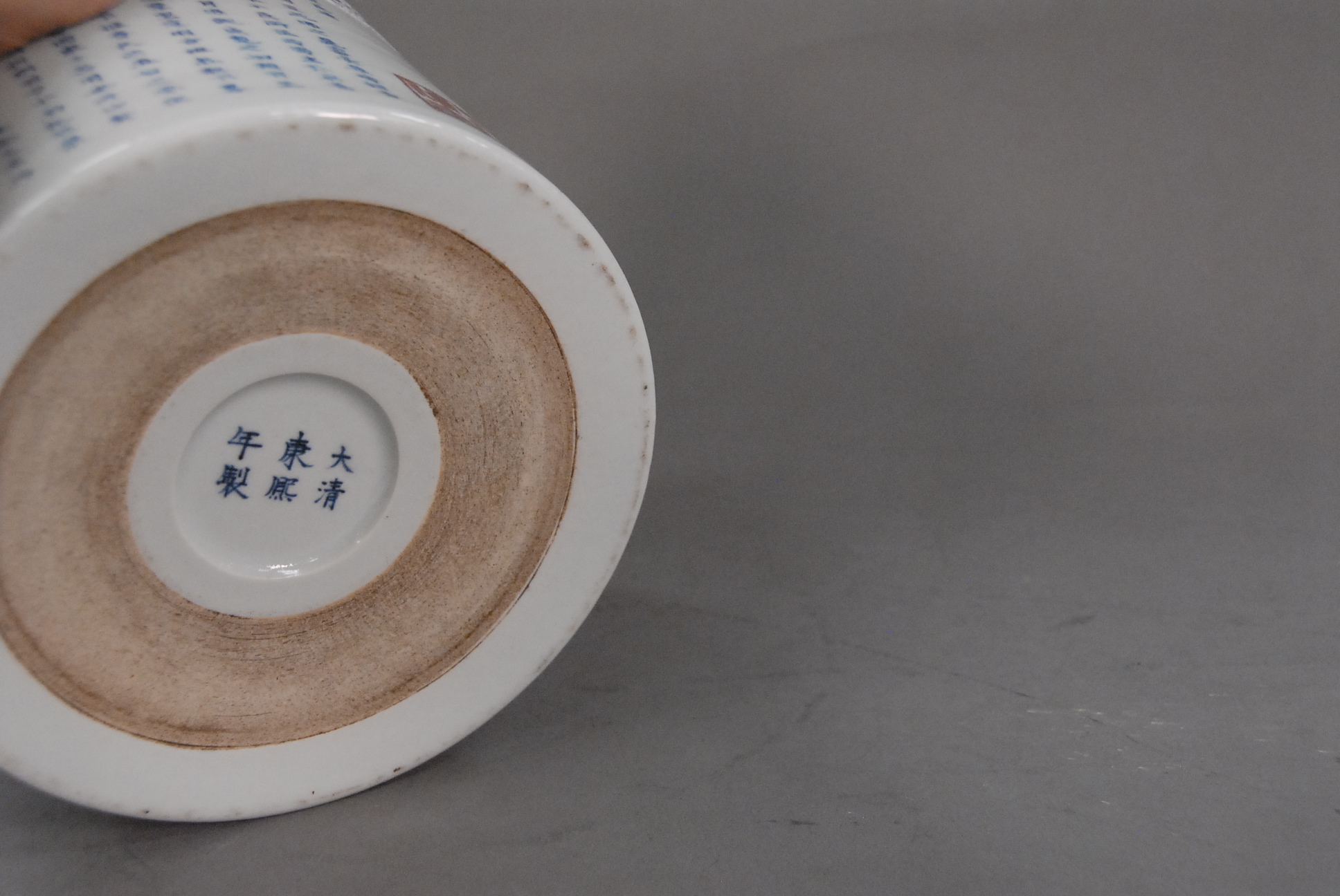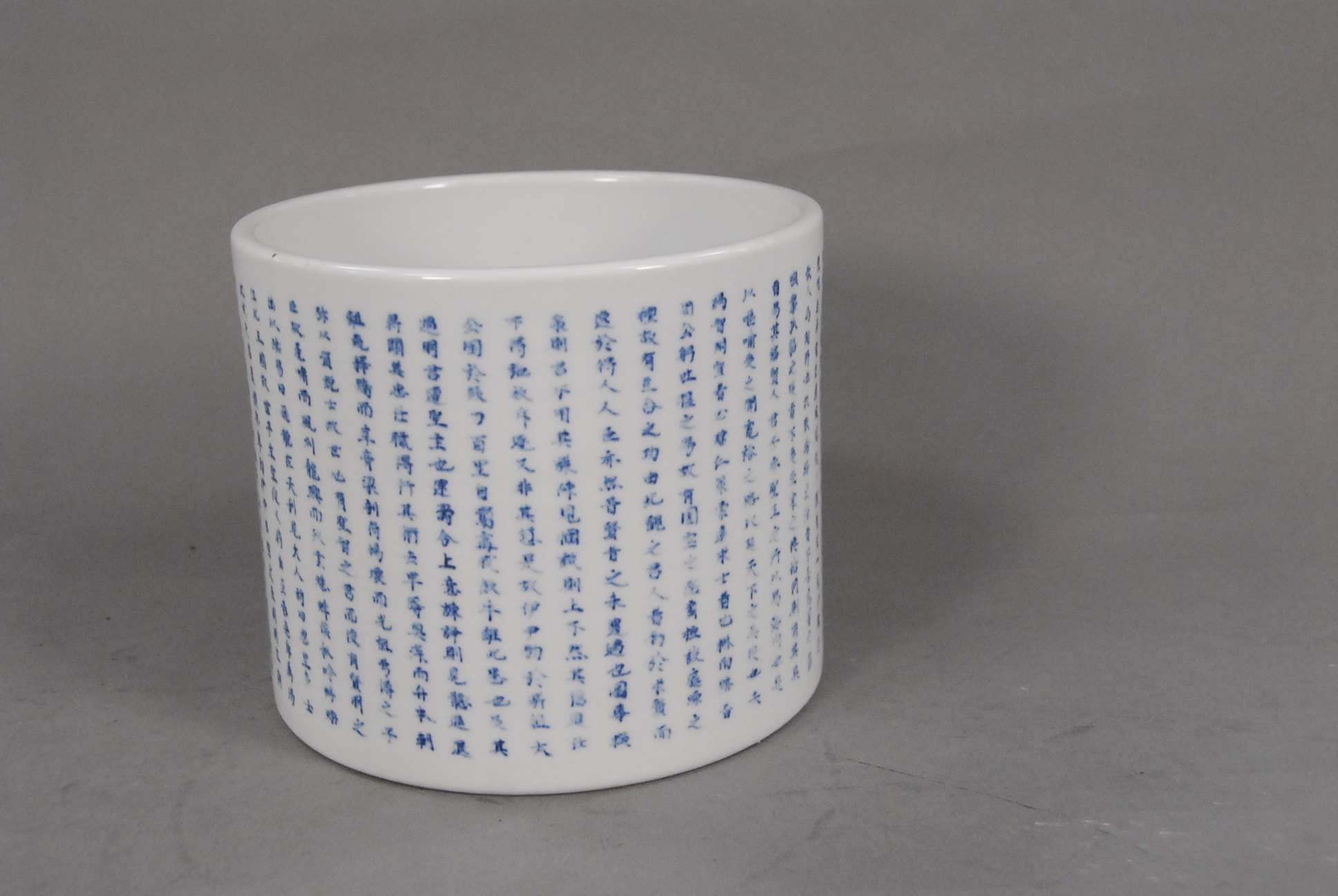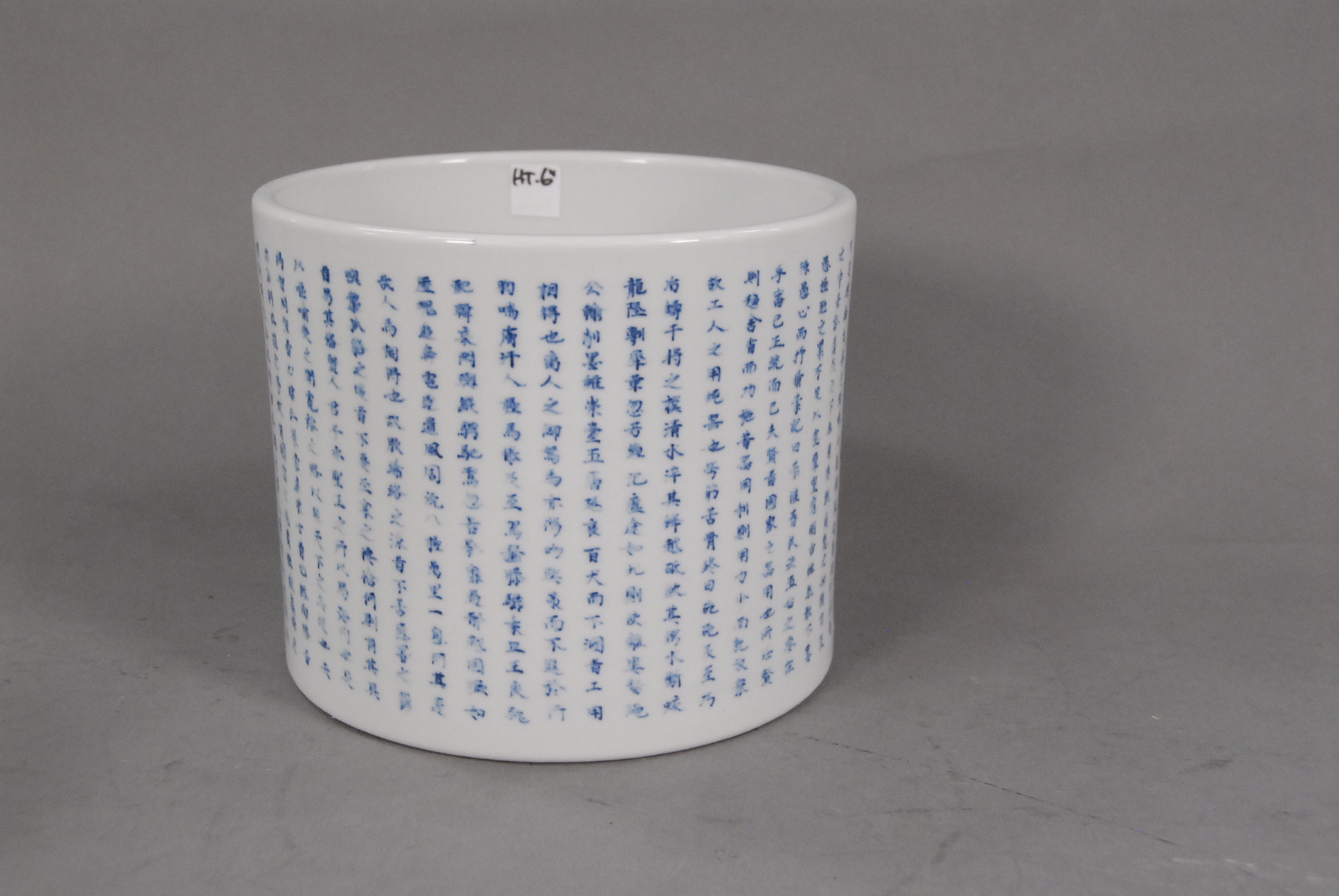 Large porcelain brush pot with characters around sides and seal mark, also having six character marks on bottom.