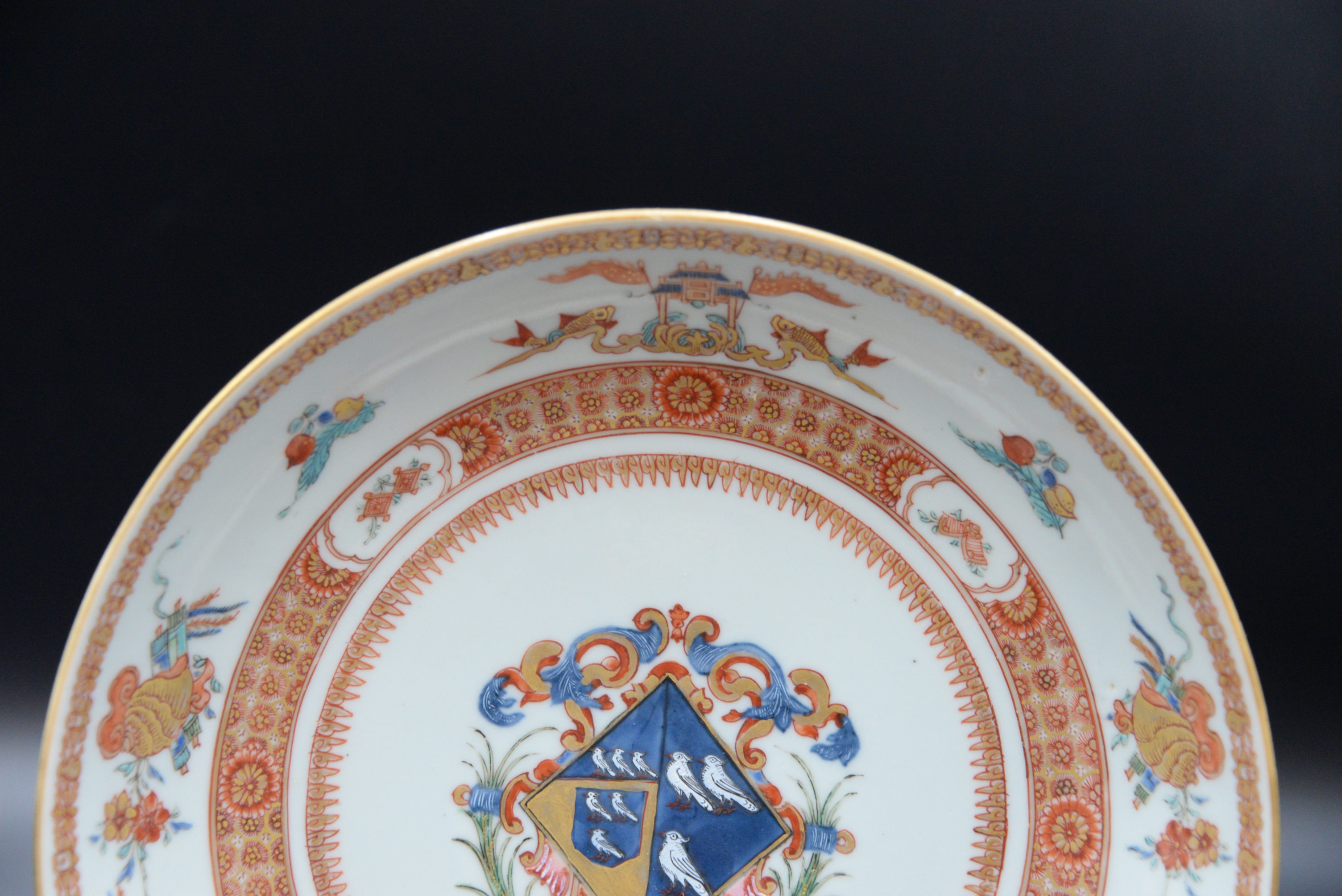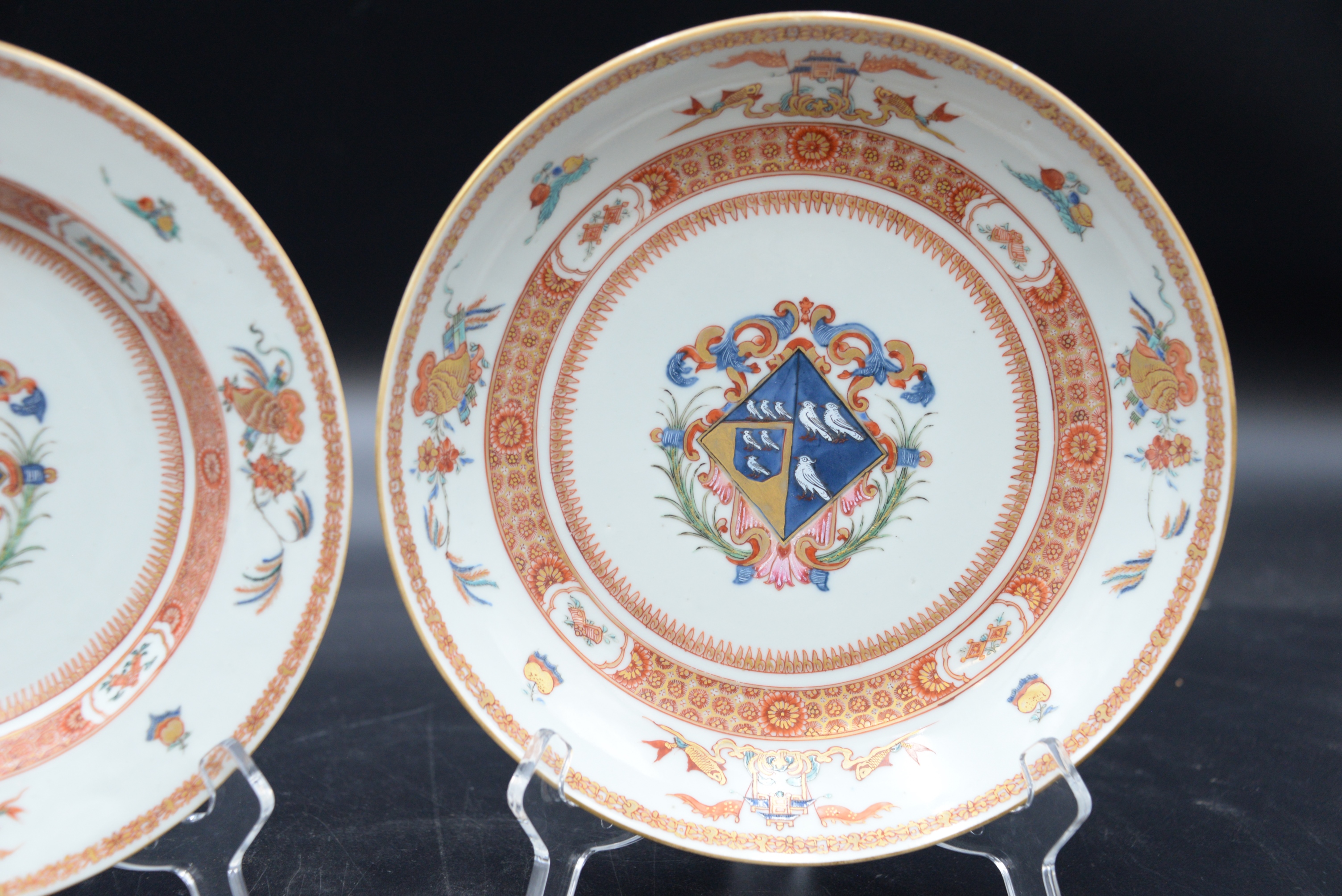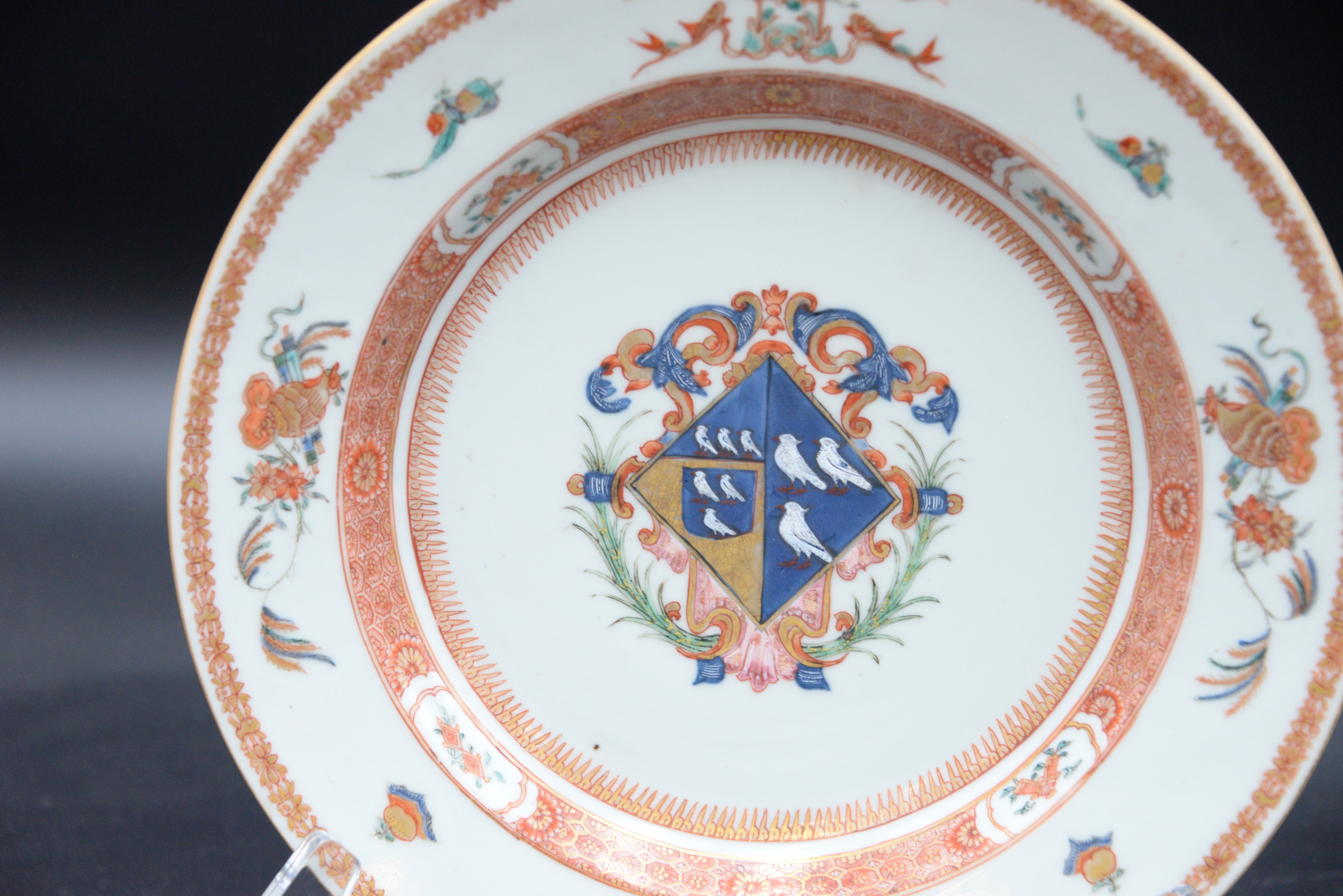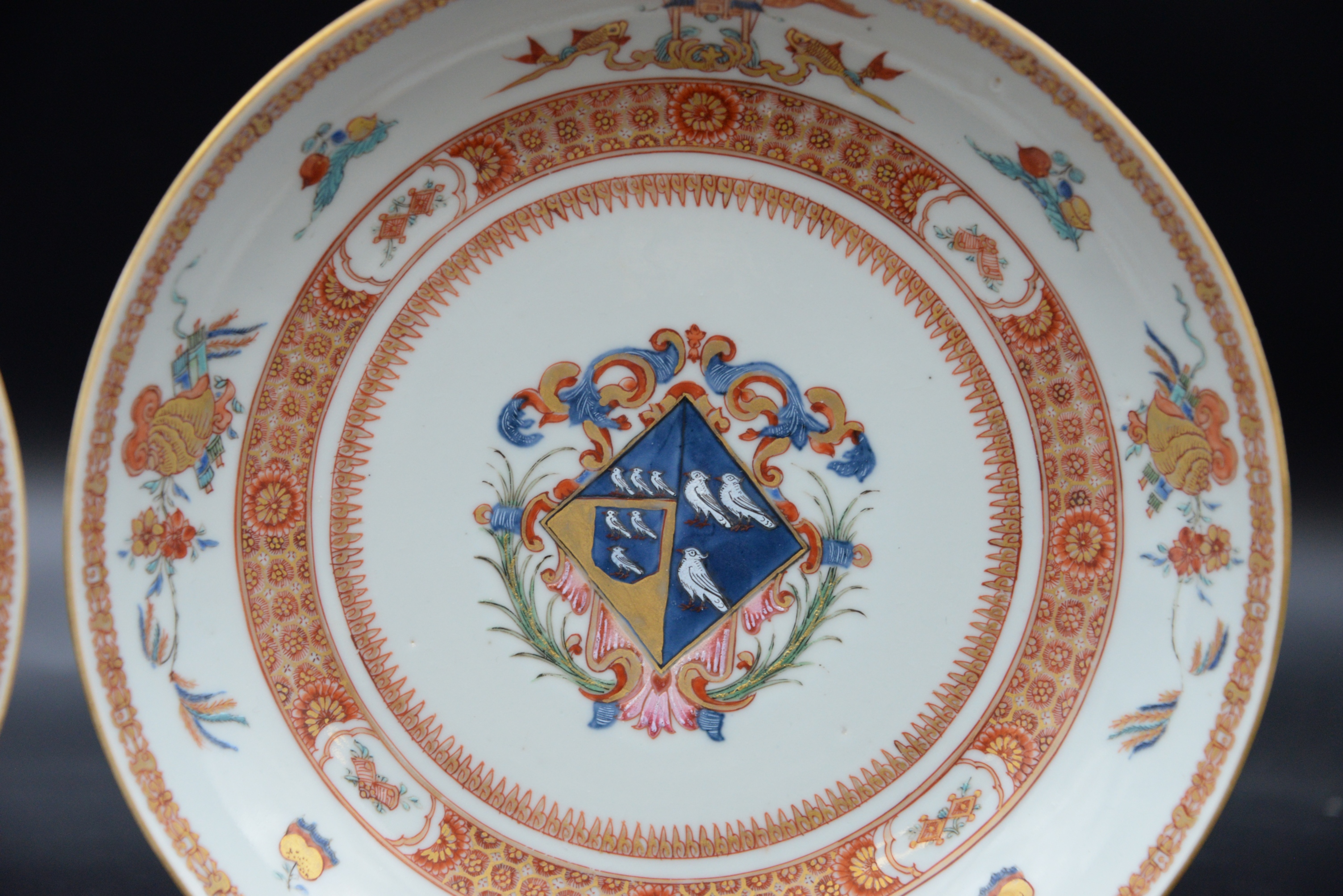 Leonora Pair of Chinese Export Porcelain Armorial Pieces, circa 1720 shallow bowl and a plate having centralized coat of arms with enameled birds, iron red and gilt band border with stylized fruit and flowers, in good condition with minor surface chips on rim, service made circa 1720 for Leonora daughter and heir of Charles Marescoe and widow of Thomas Frederick of Westminster, height 1 1/2 inches, diameter 9 inches; height 1 1/4 inches, diameter 9″,