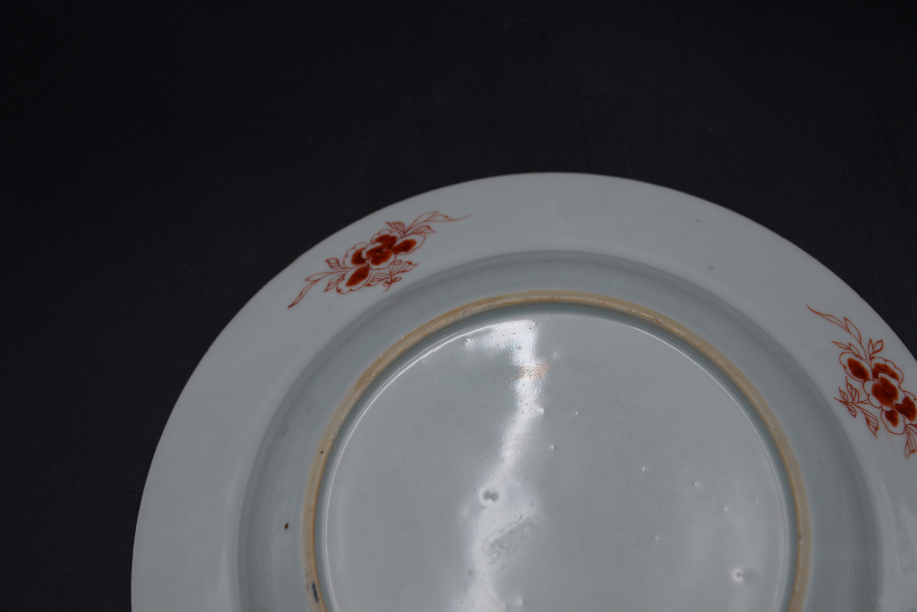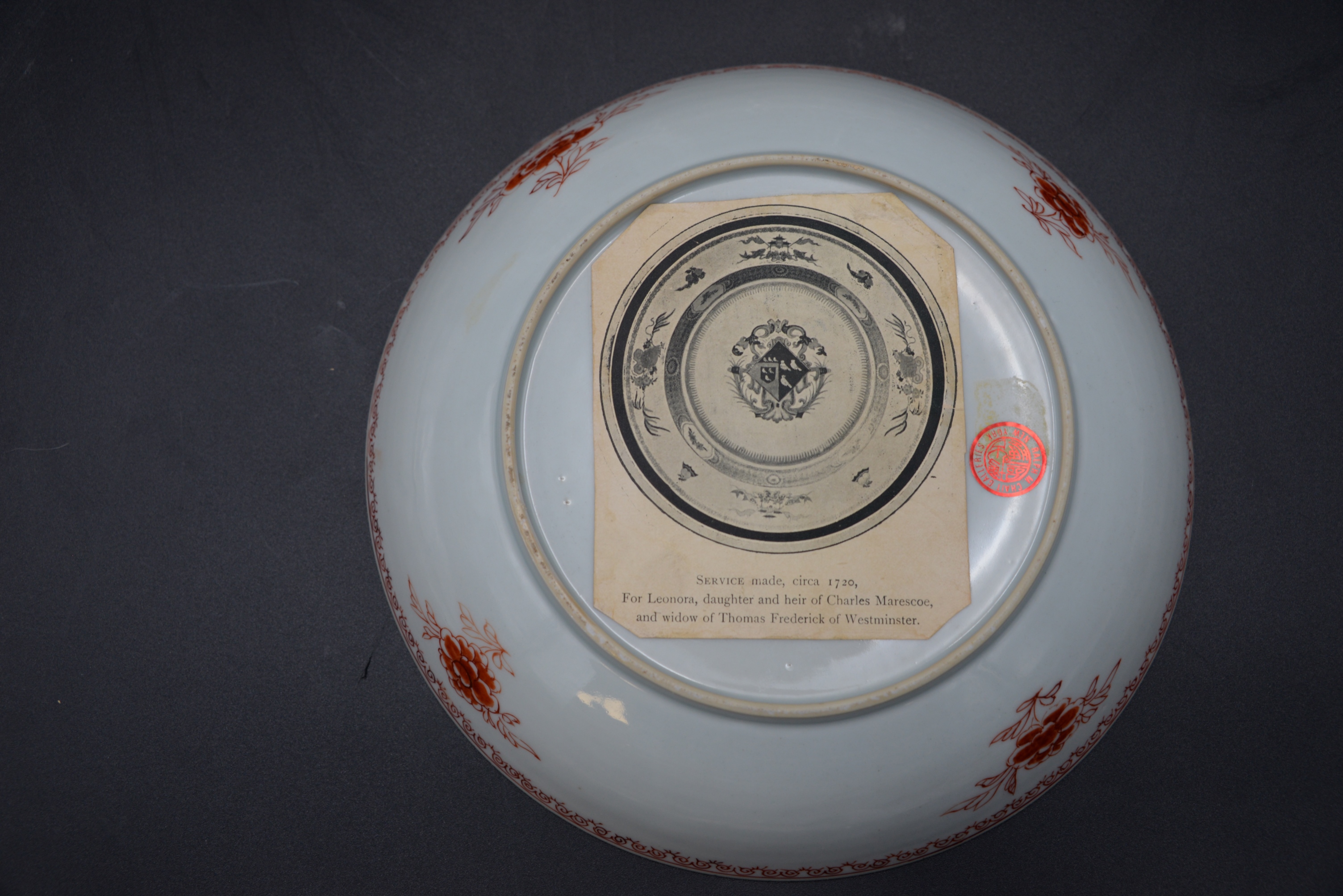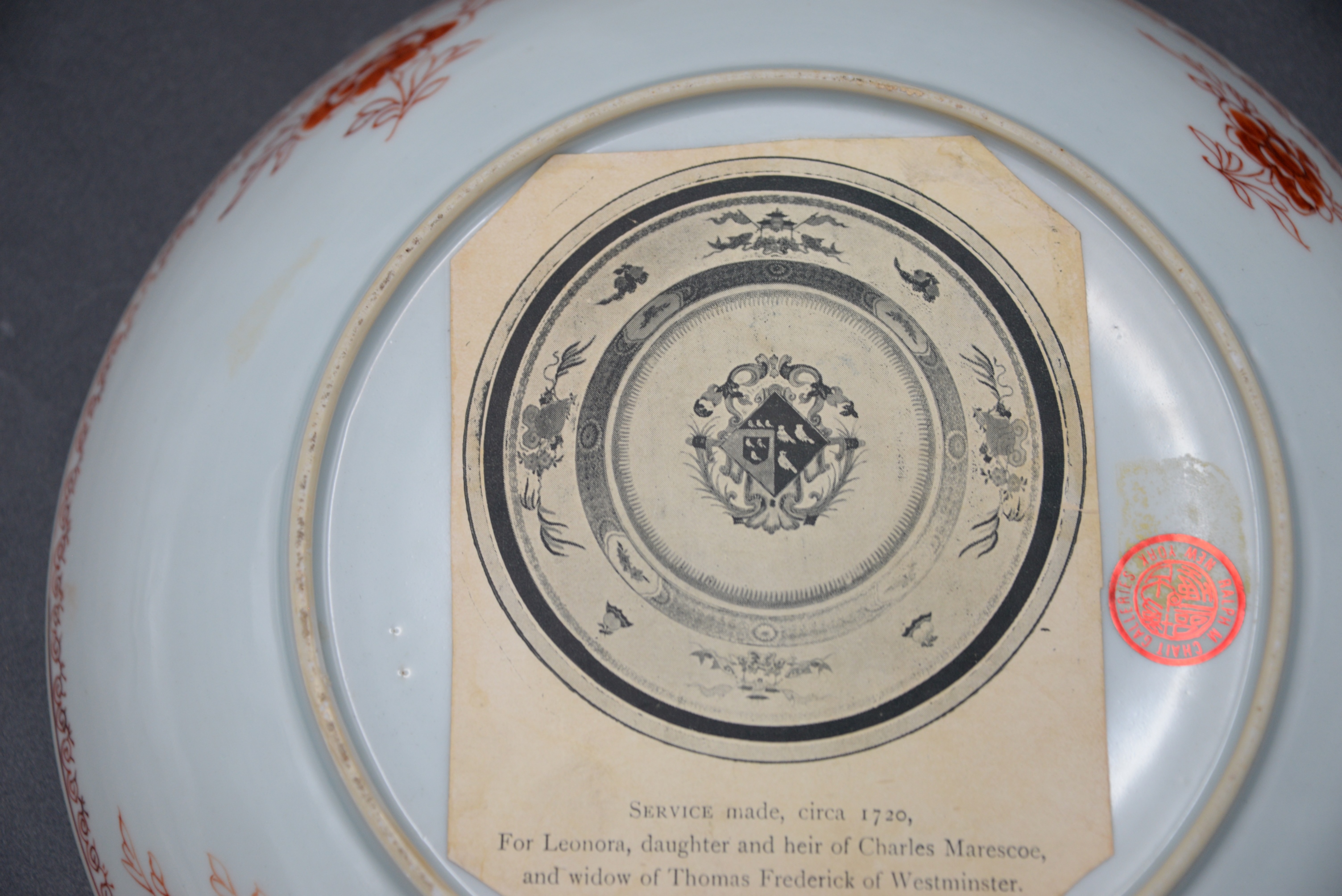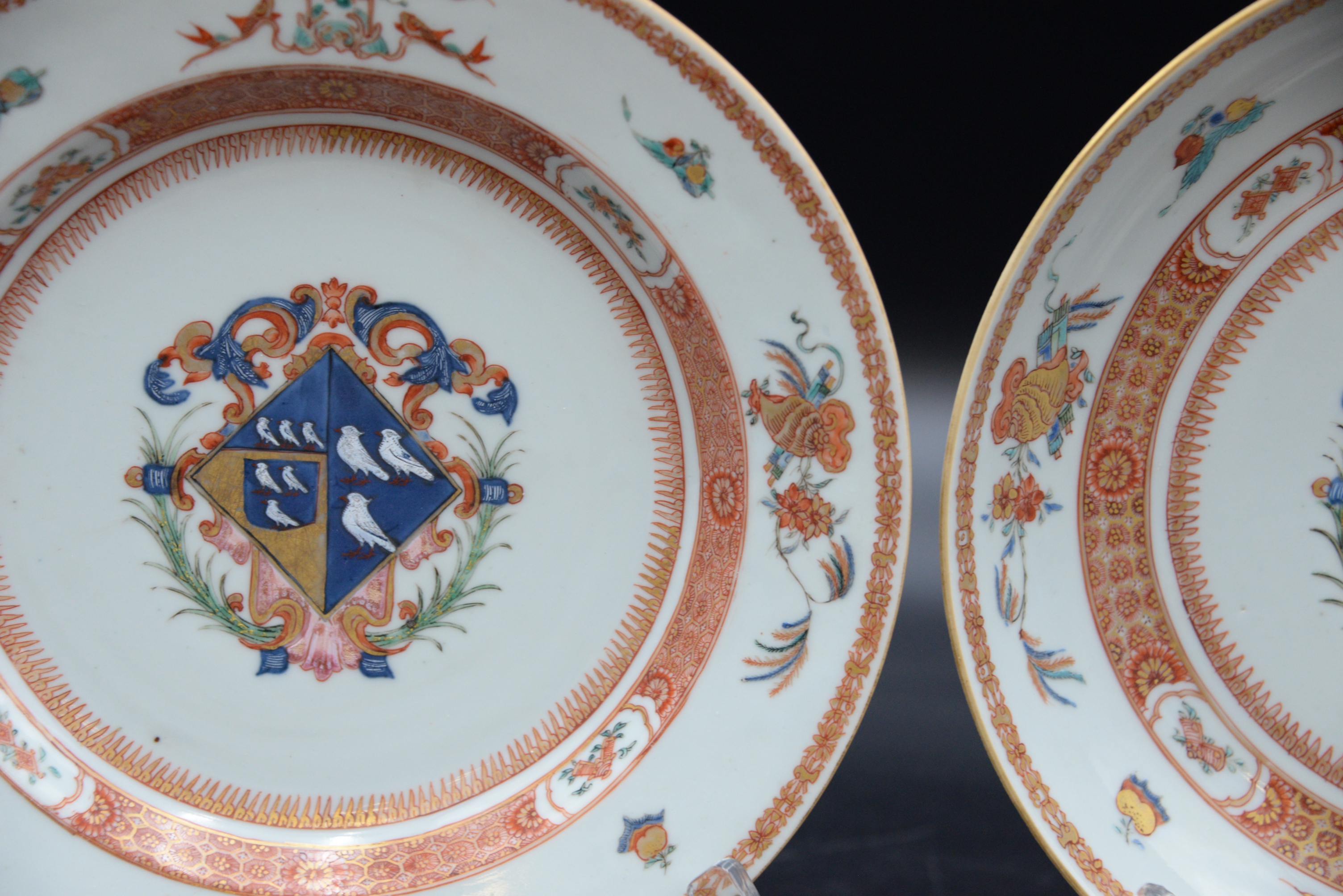 Leonora Pair of Chinese Export Porcelain Armorial Pieces, circa 1720 shallow bowl and a plate having centralized coat of arms with enameled birds, iron red and gilt band border with stylized fruit and flowers, in good condition with minor surface chips on rim, service made circa 1720 for Leonora daughter and heir of Charles Marescoe and widow of Thomas Frederick of Westminster, height 1 1/2 inches, diameter 9 inches; height 1 1/4 inches, diameter 9″,