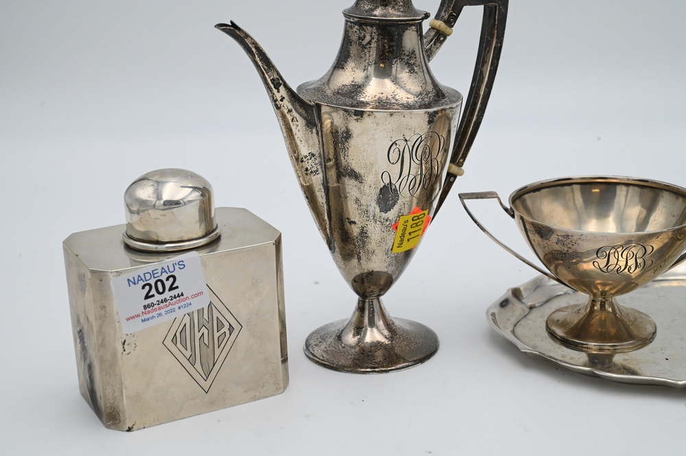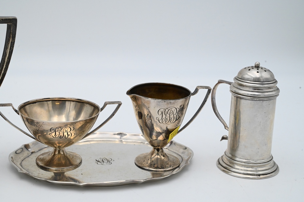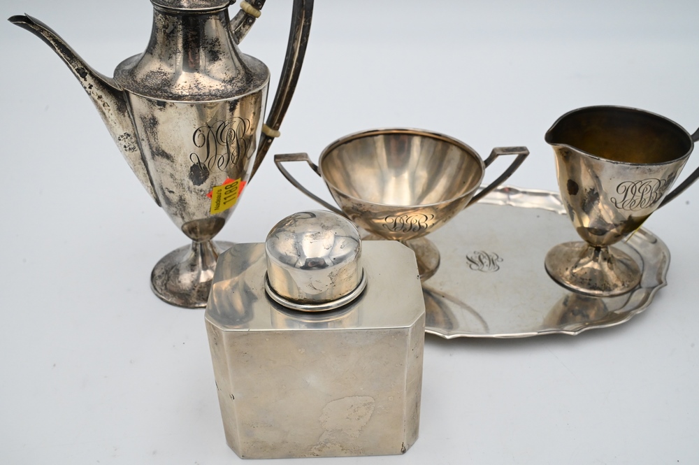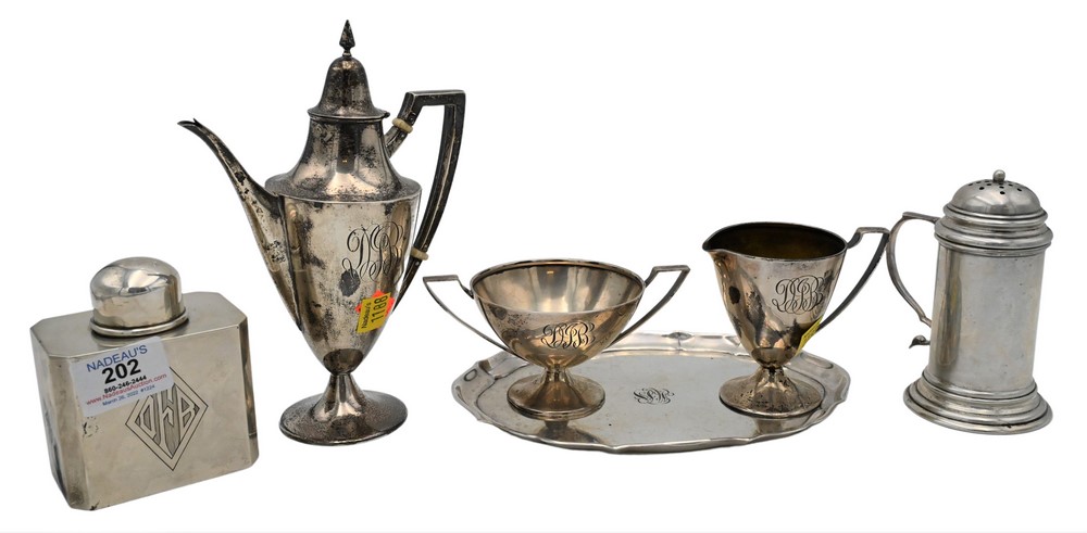 Lot of Six Sterling Silver Pieces, to include a tray, small teapot, creamer, sugar, spice shaker, along with lidded box; tallest 8 inches; 27.94 t.oz.