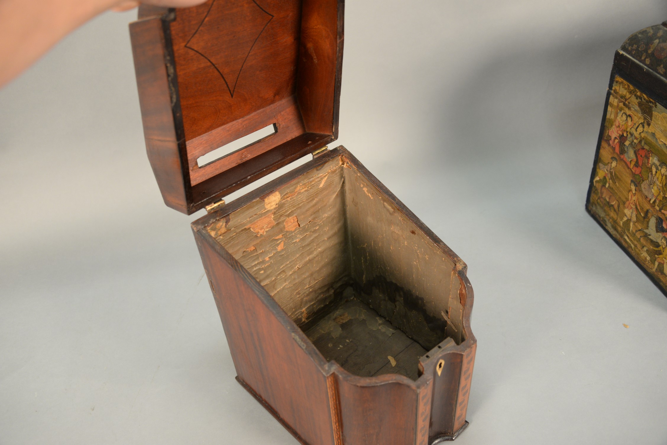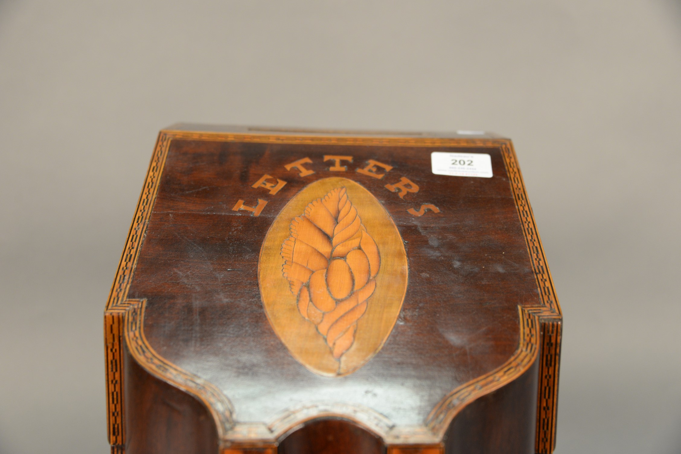 Lot 202: Mahogany inlaid letter box with serpentine front, slant lid and shell inlay. ht. 14 1/2 in. wd. 9 1/2 in. dp. 11 1/2 in. P…