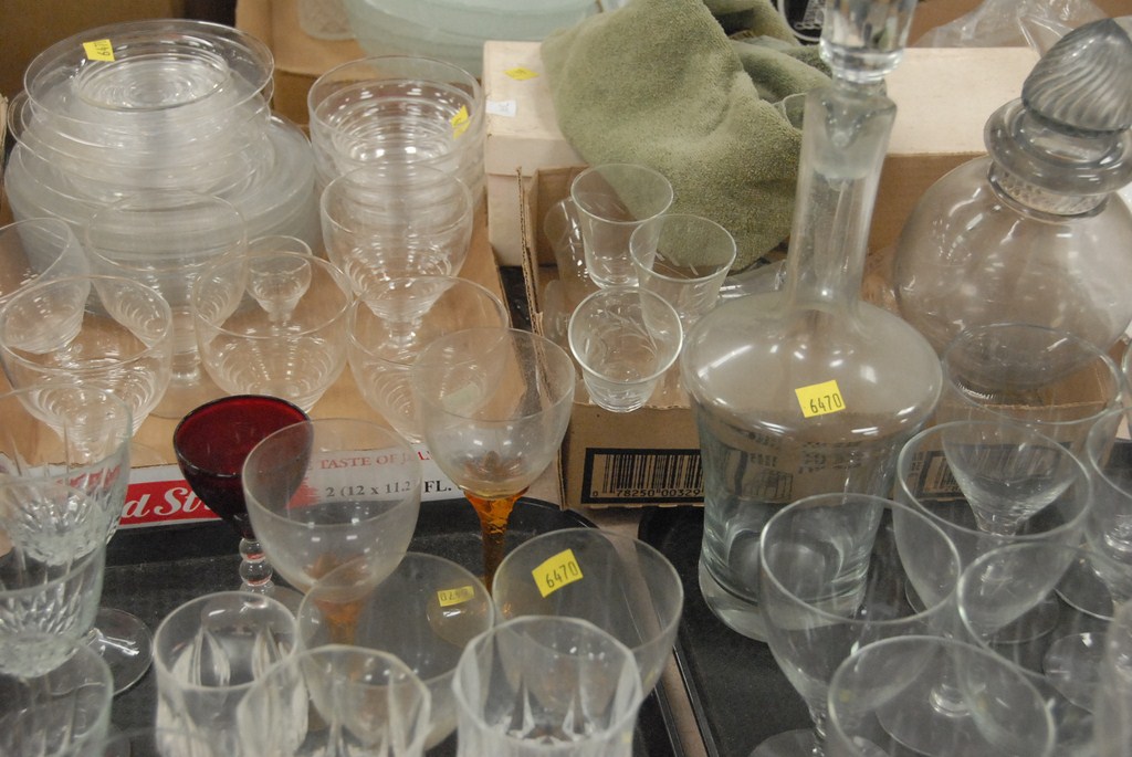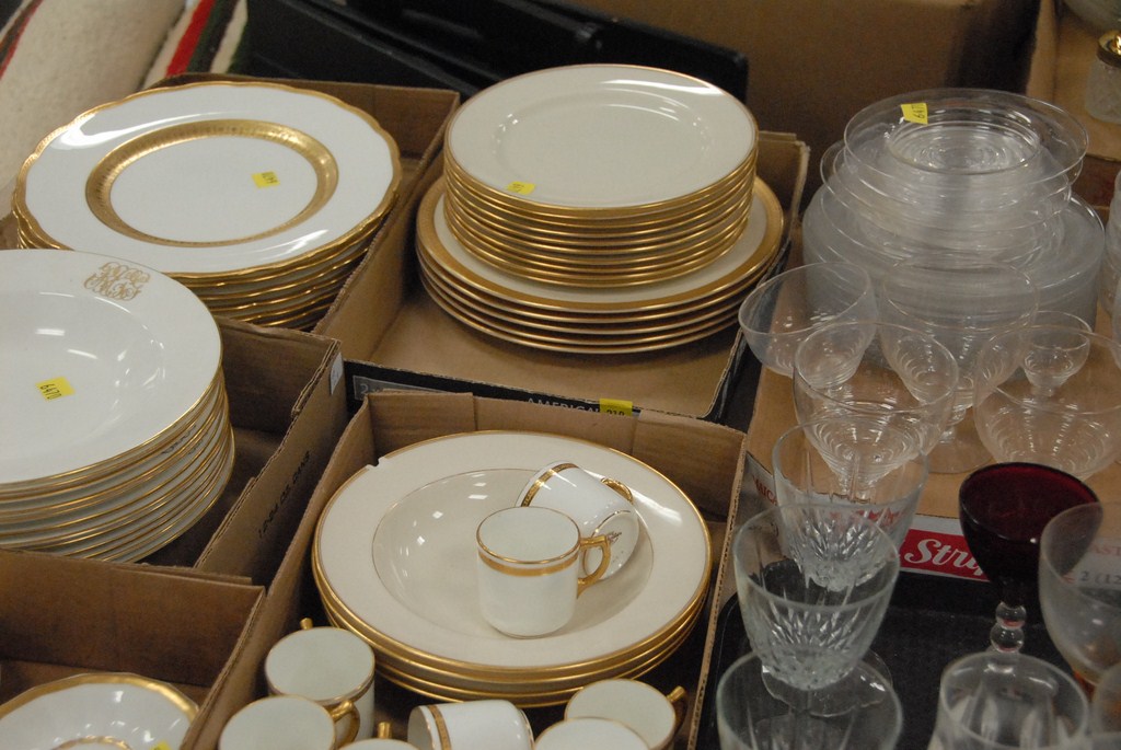 Nine box lots gold rimmed plates, porcelain cups and saucers, bowls, stemware, decanter.