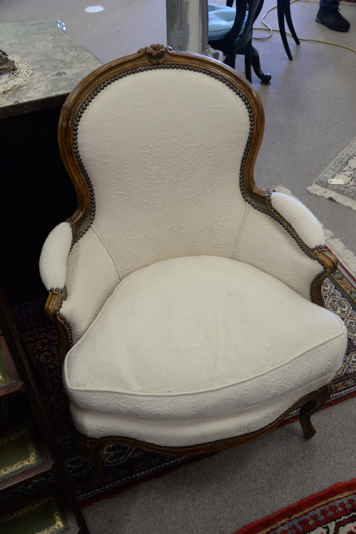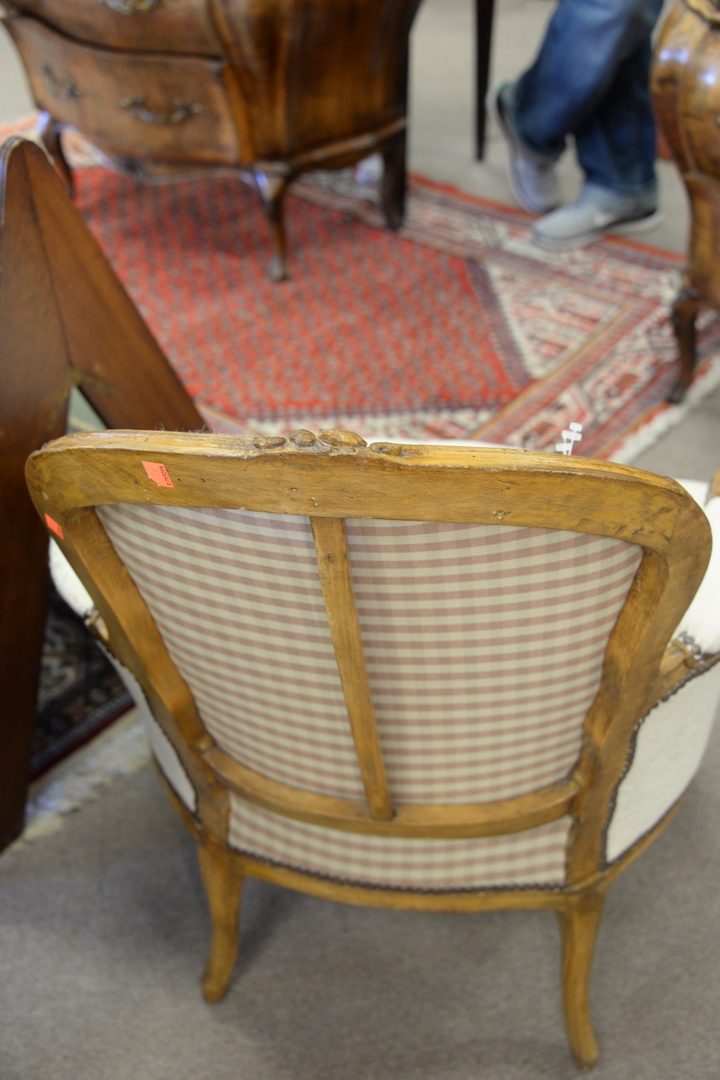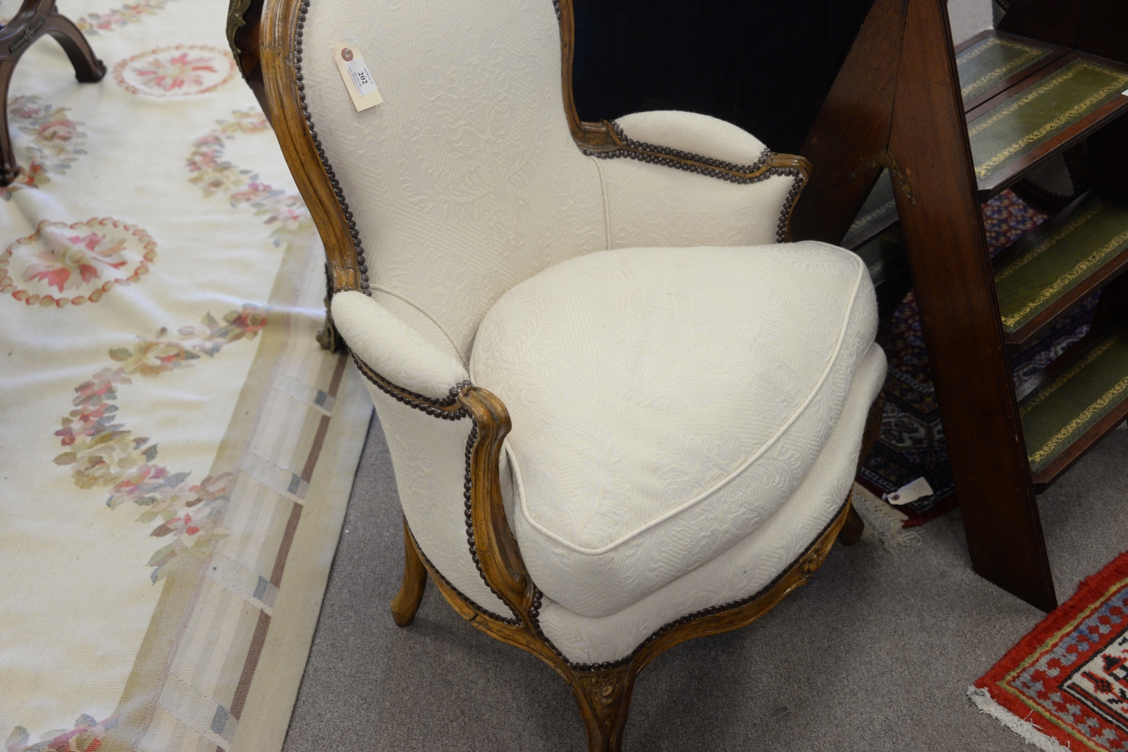 Lot 202: Pair Louis XV Style Bergeres, in custom upholstery, height 36 inches, along with Claremont fabric, Palmadamask, George Spencer pattern.