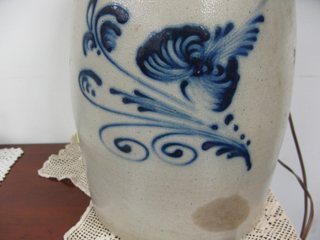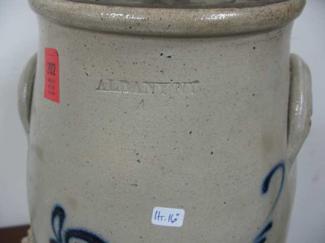 Primitive stoneware four gallon crock with blue decoration marked Albany NY, cracked