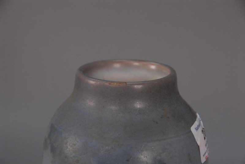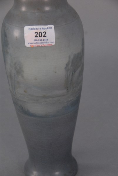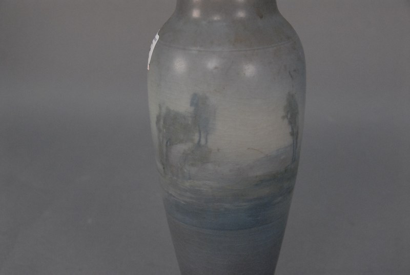 Lot 202: Rookwood scenic vase, vellum finish, Edward Diers 1910, #1667 rim glaze chips – crazing. ht. 10 3/4in.