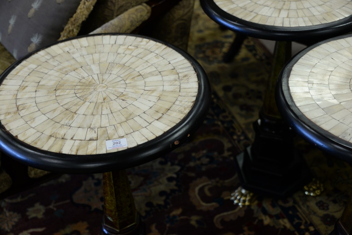 Lot 202: Set of three Contemporary stands having round top on bronze pedestal bases on claw feet, ht. 27in., dia. 18in.