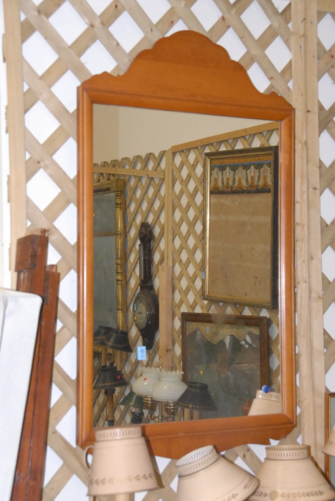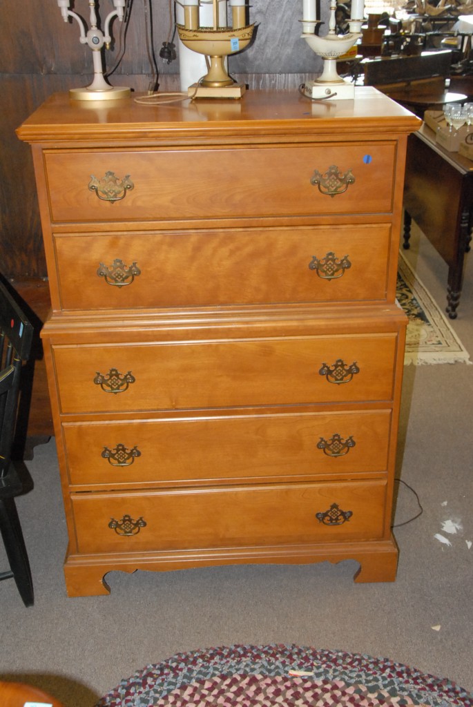 Seven piece maple bedroom set chest on chest, chest and mirror, night stand, two twin beds, and desk.