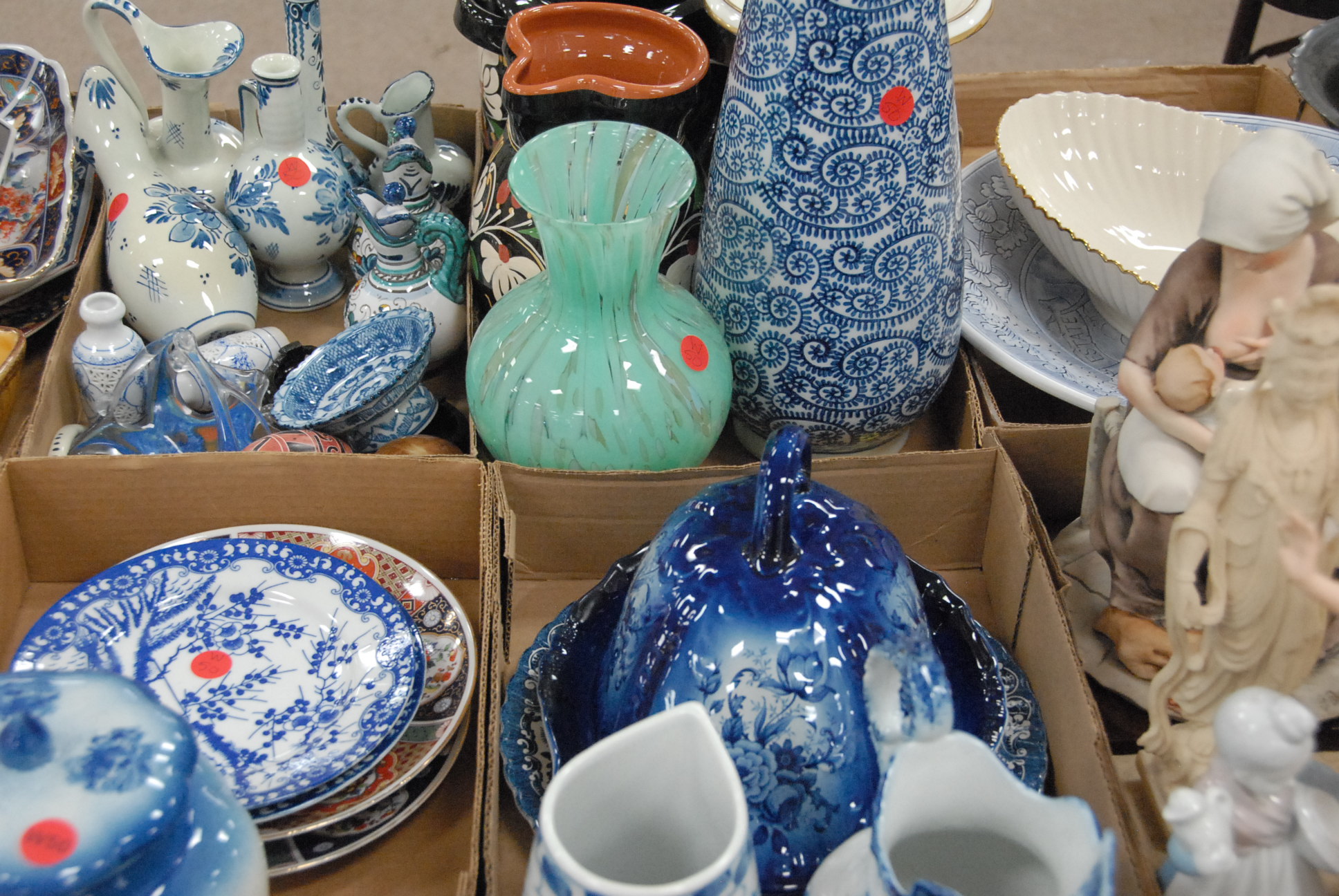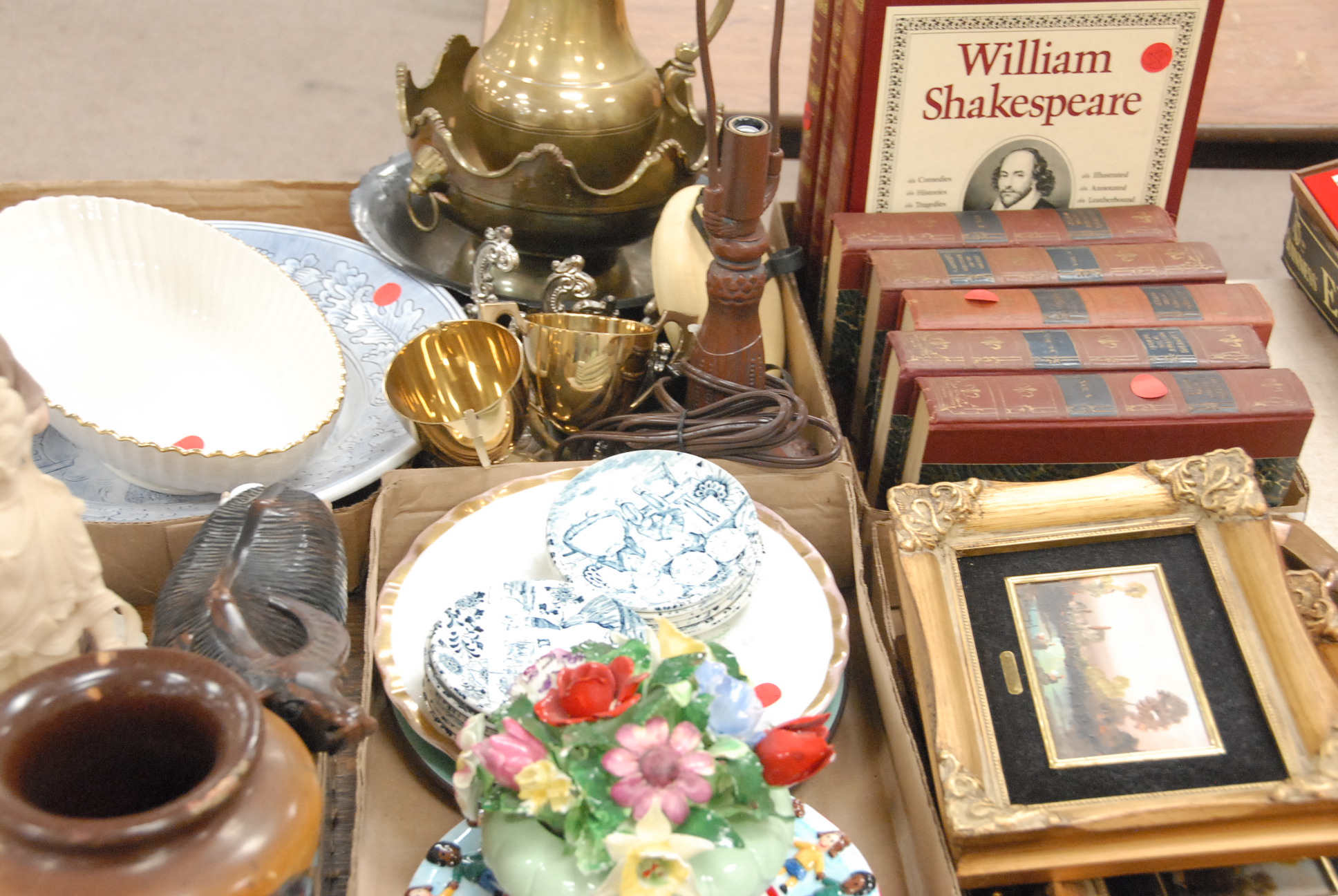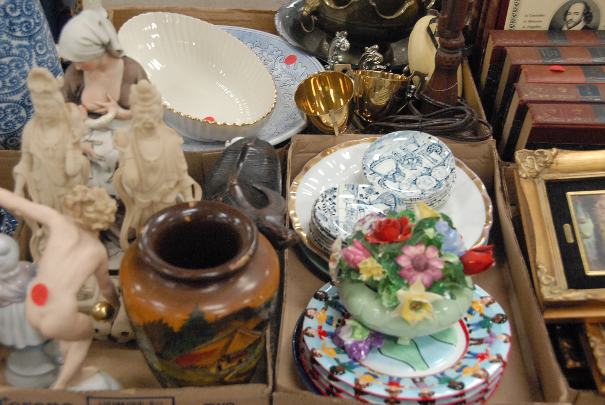 Ten box lots including china, porcelain, vases, urns, brass, German porcelain figure, books, and small pictures.