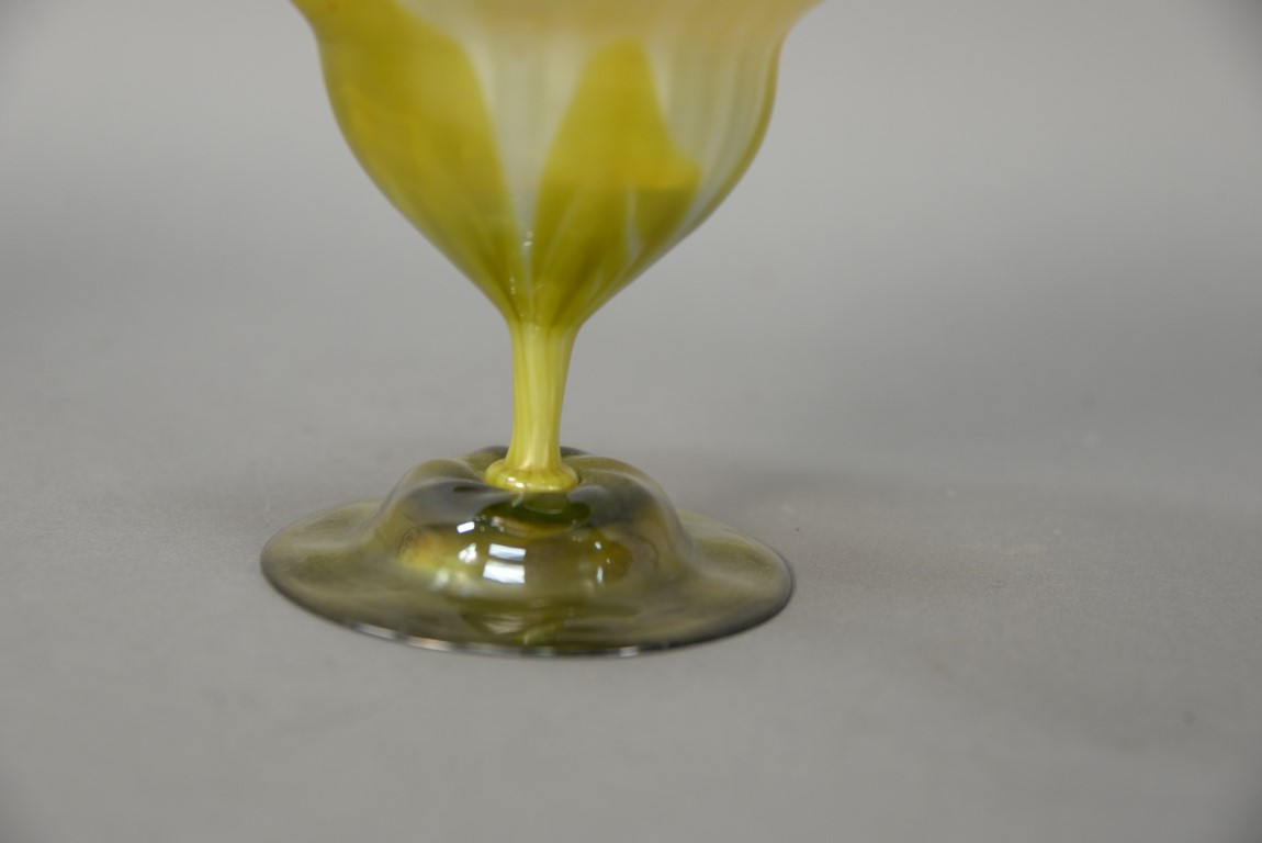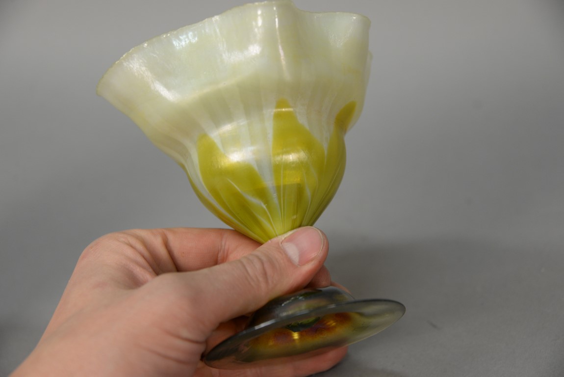 Lot 202: Tiffany Favrile glass floriform cabinet vase, iridescent with pulled feathers, marked L