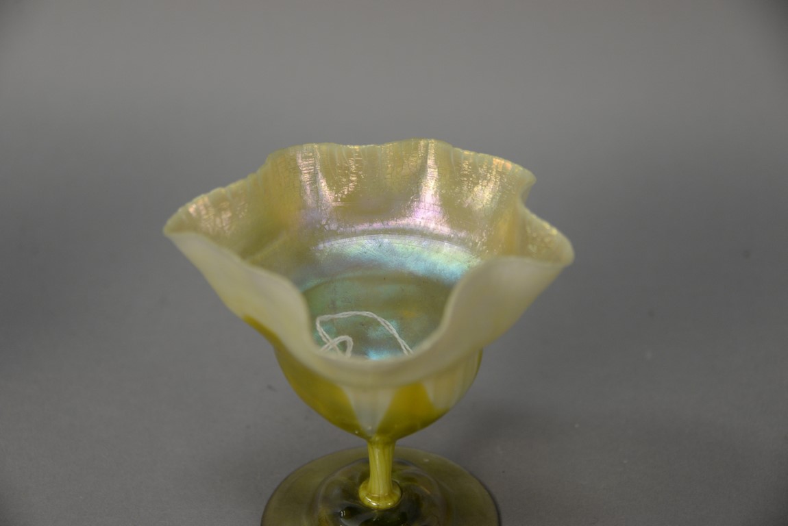 Tiffany Favrile glass floriform cabinet vase, iridescent with pulled feathers, marked L.C.T. T477 having original paper label. ht. 4 1/2in. dia. 5in.