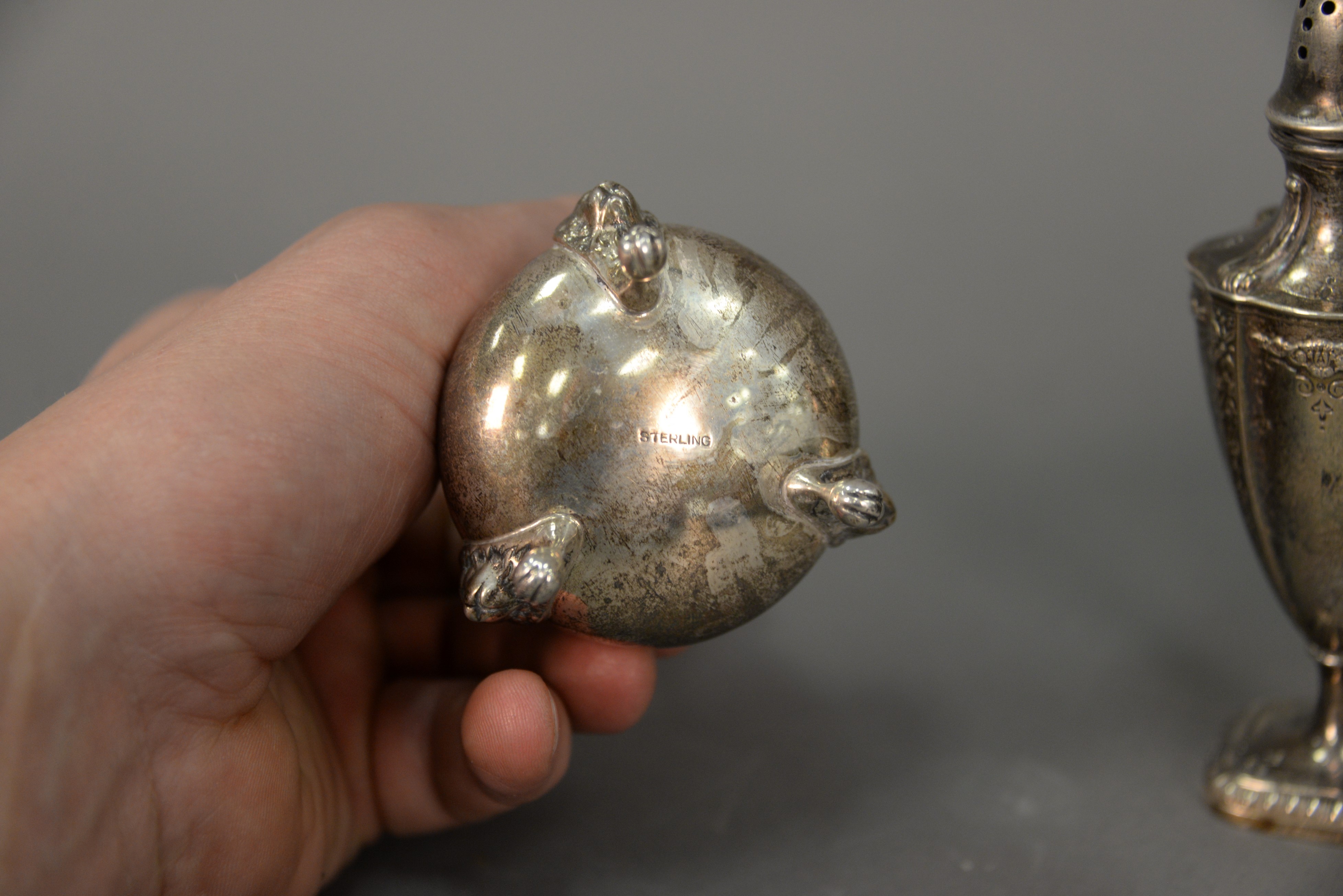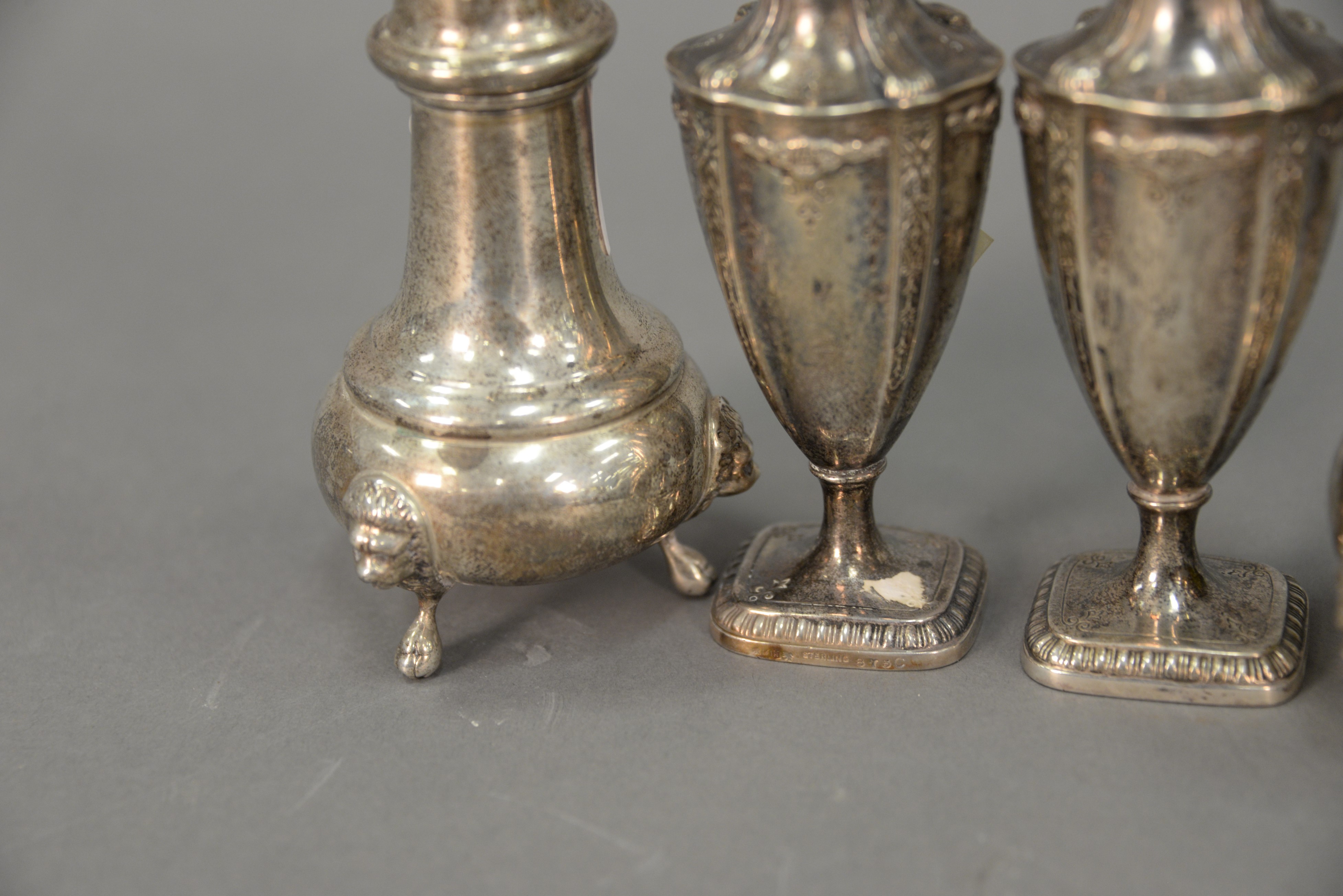 Two pairs of sterling salt and pepper shakers. ht. 5 1/4 in. & 5 1/2 in. 10 t oz.