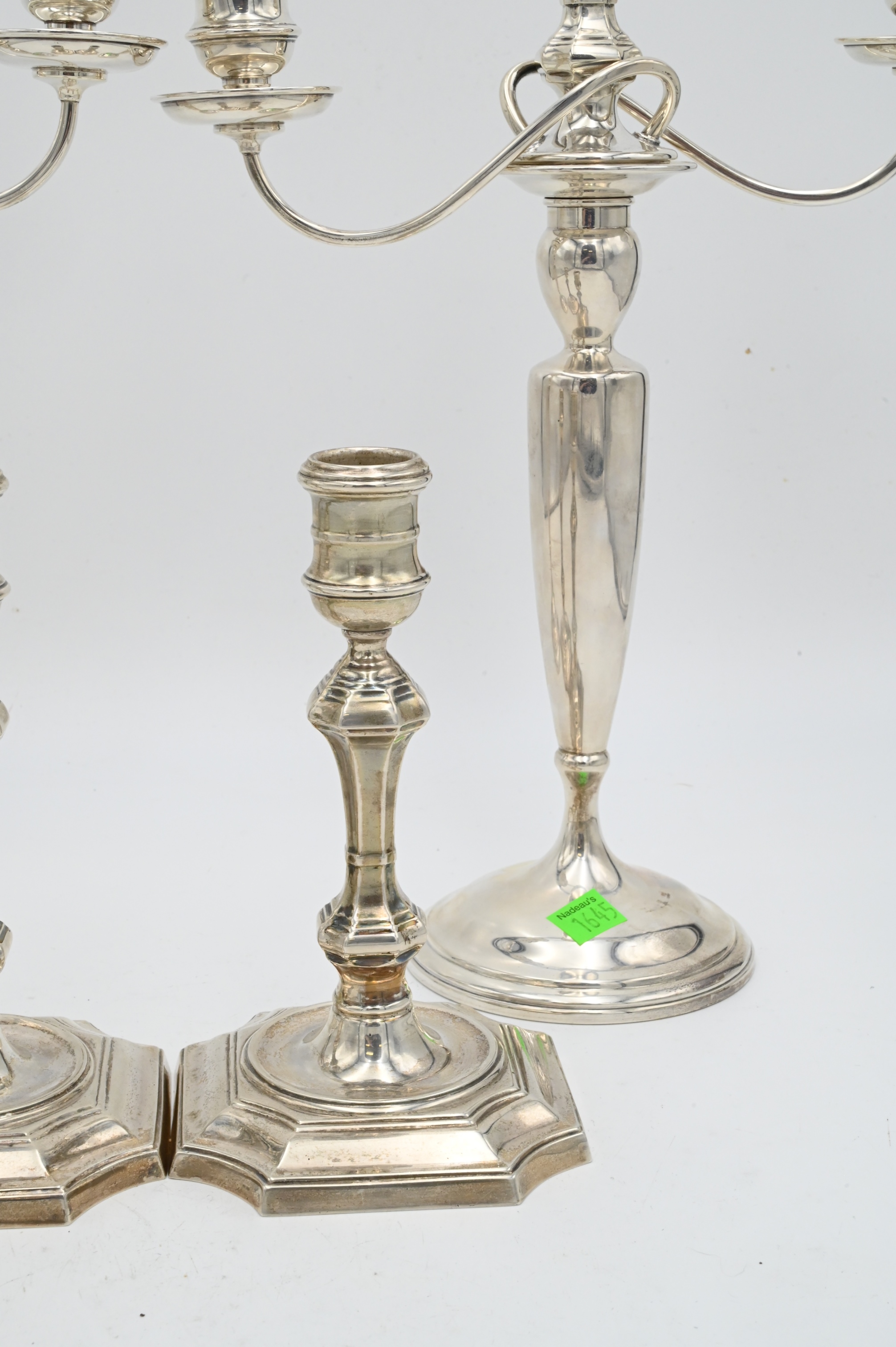 Two Pairs of Sterling Silver Candle Holders, one pair black starr and frost candelabra ( height 7 inches) and pair of Crichton N.Y. candlesticks (height 14 1/2 inches