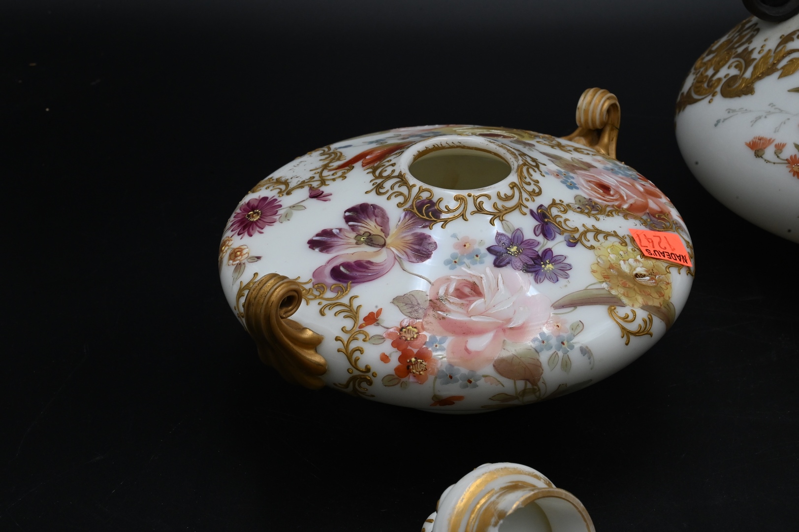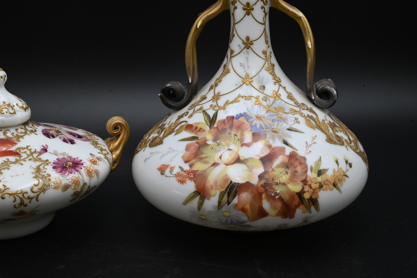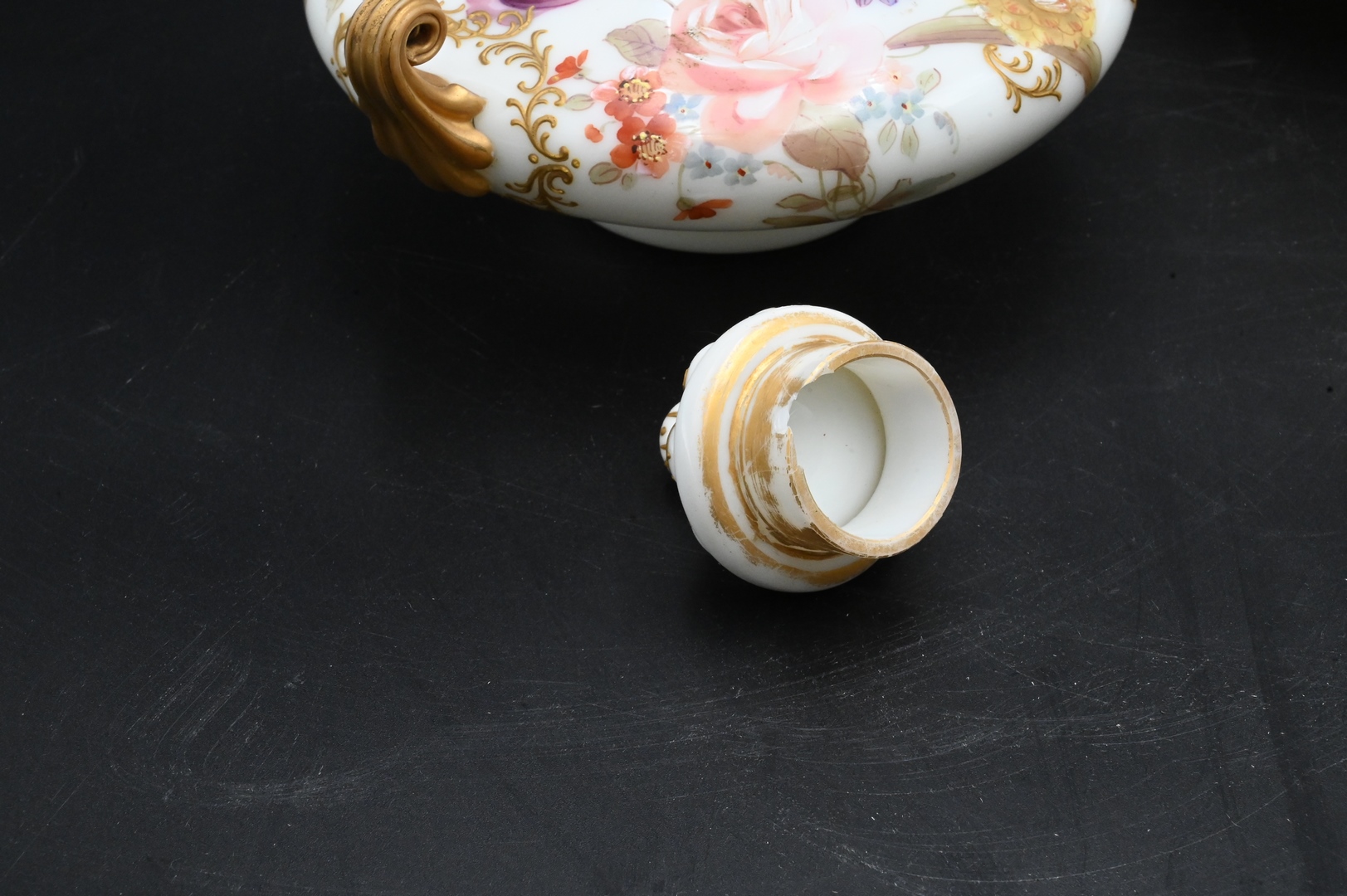 Low vase with cracked and chipped stopper. One handle repaired, tall piece has minor wear to points on handles. Each with minor gilt loss.