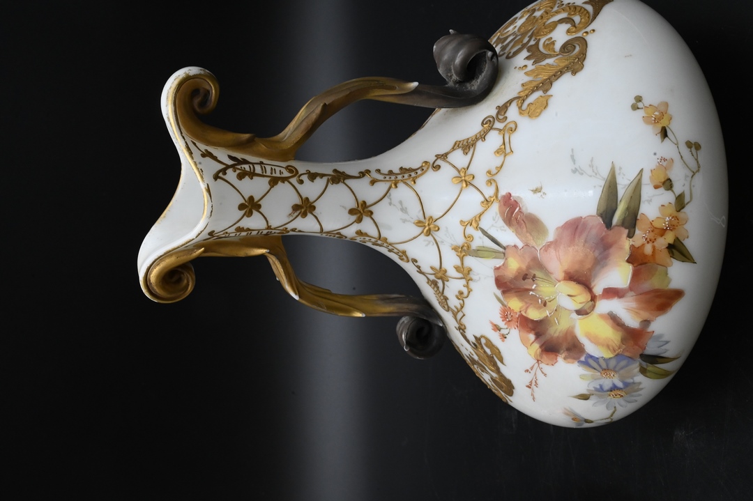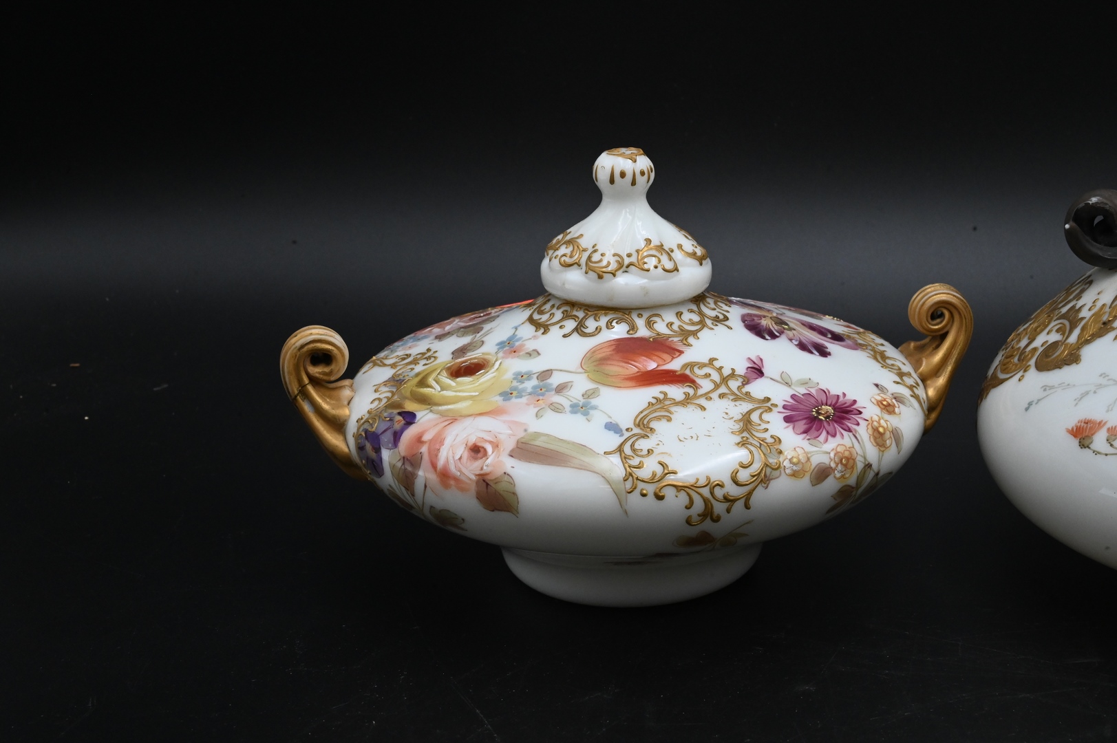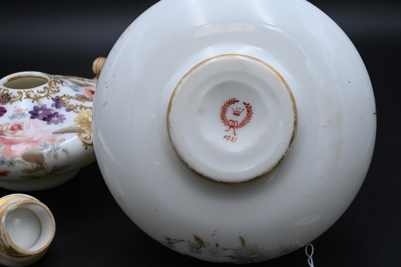 Low vase with cracked and chipped stopper. One handle repaired, tall piece has minor wear to points on handles. Each with minor gilt loss.