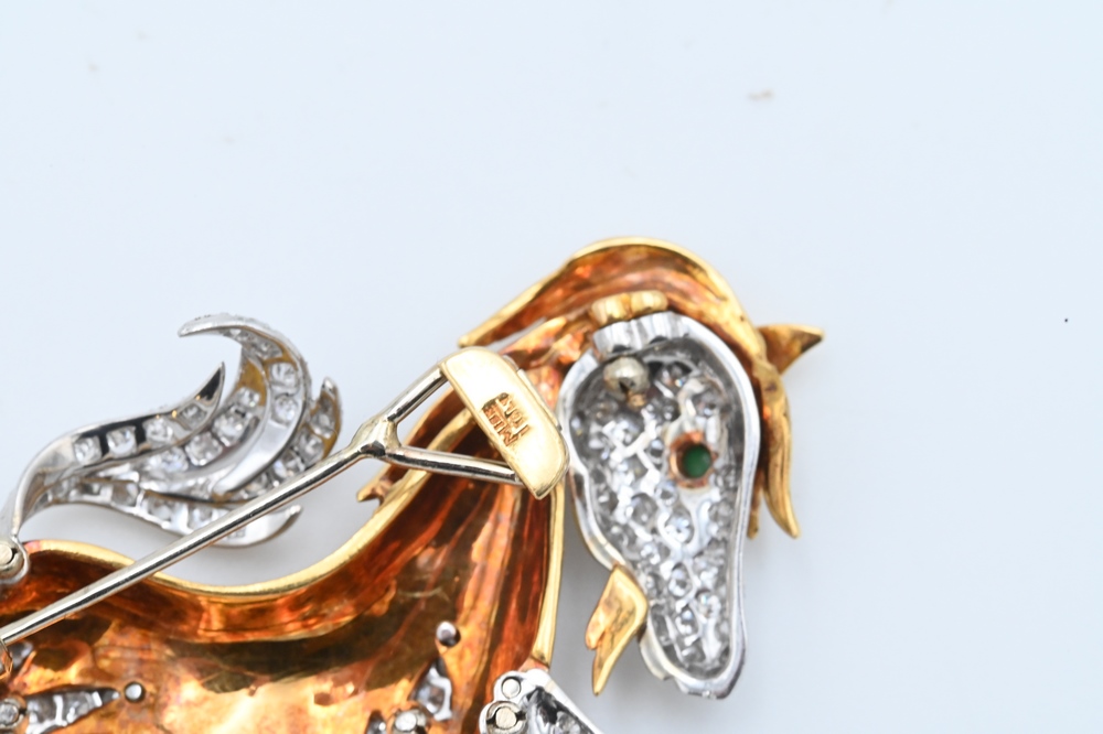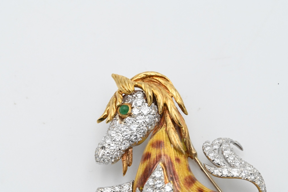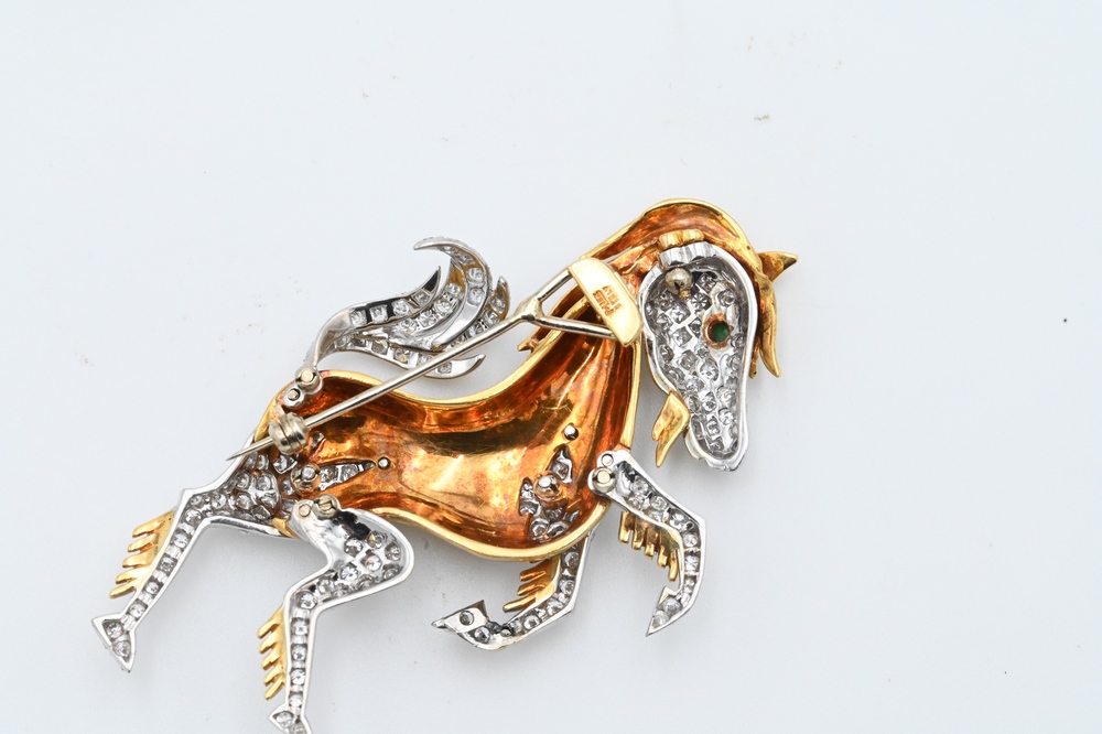 Lot 203: 18 Karat Yellow Gold Horse Brooch, having enameled body and diamond encrusted head, legs and tail, length 2 1/2 inches, 27 grams.