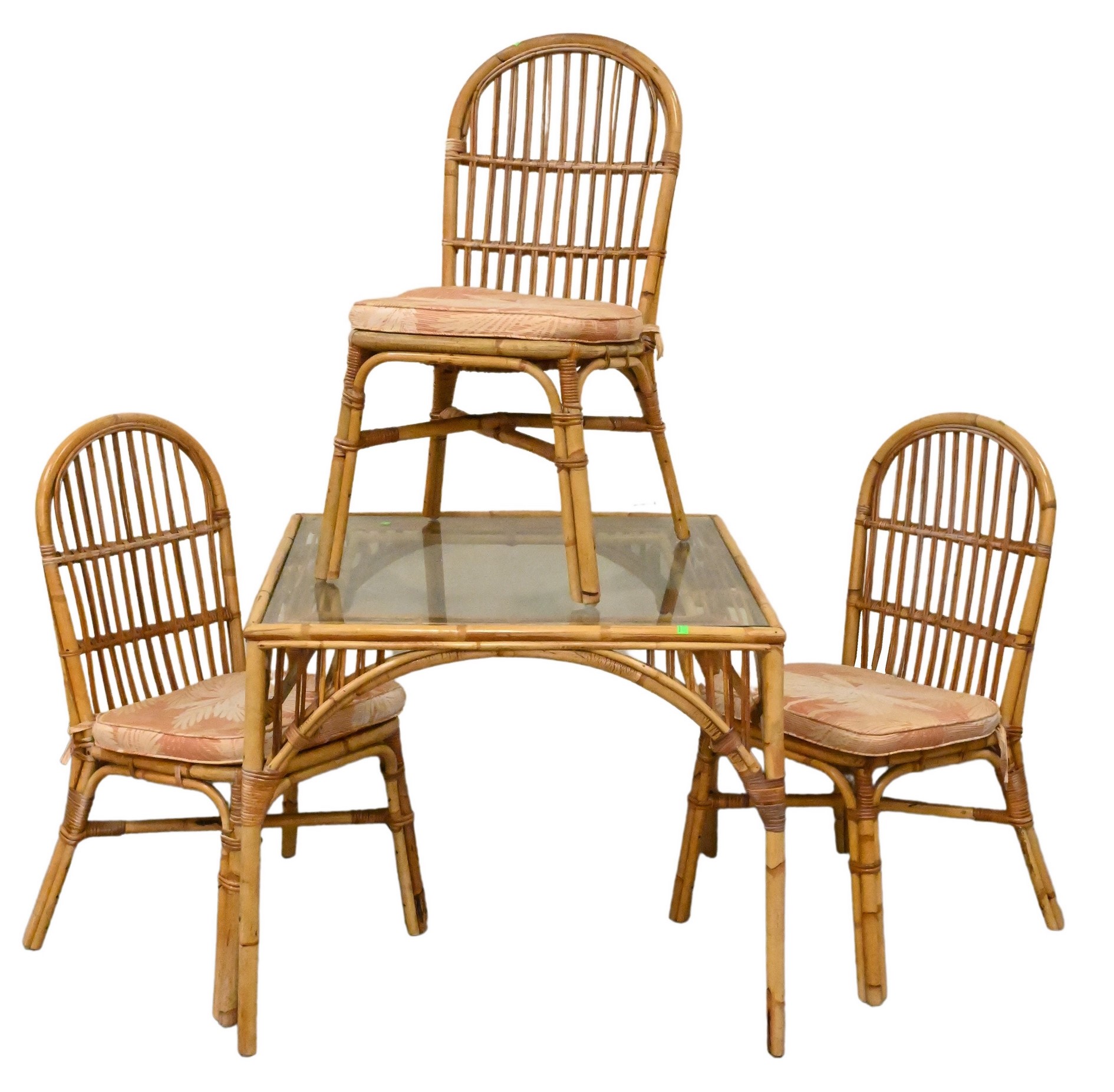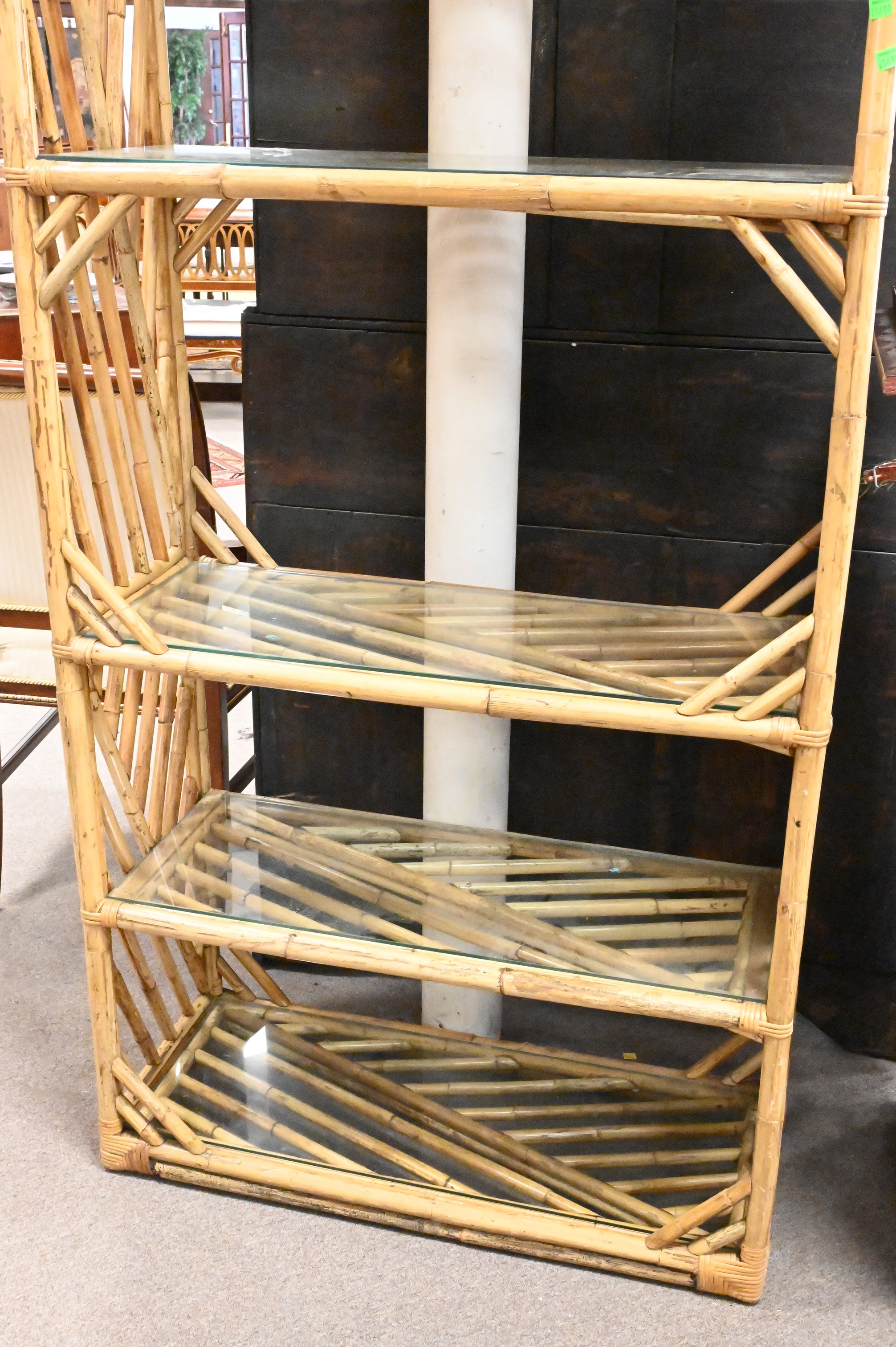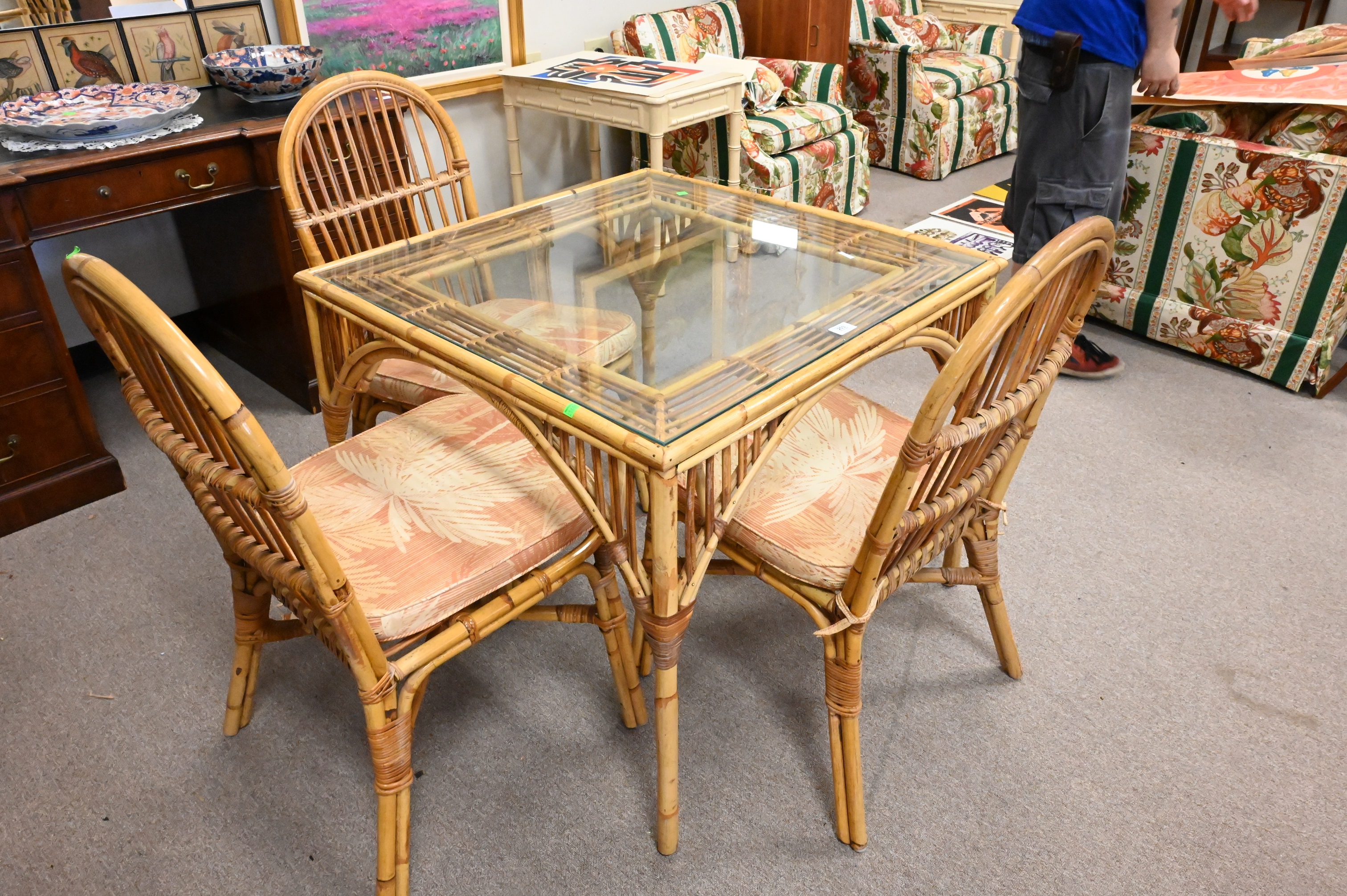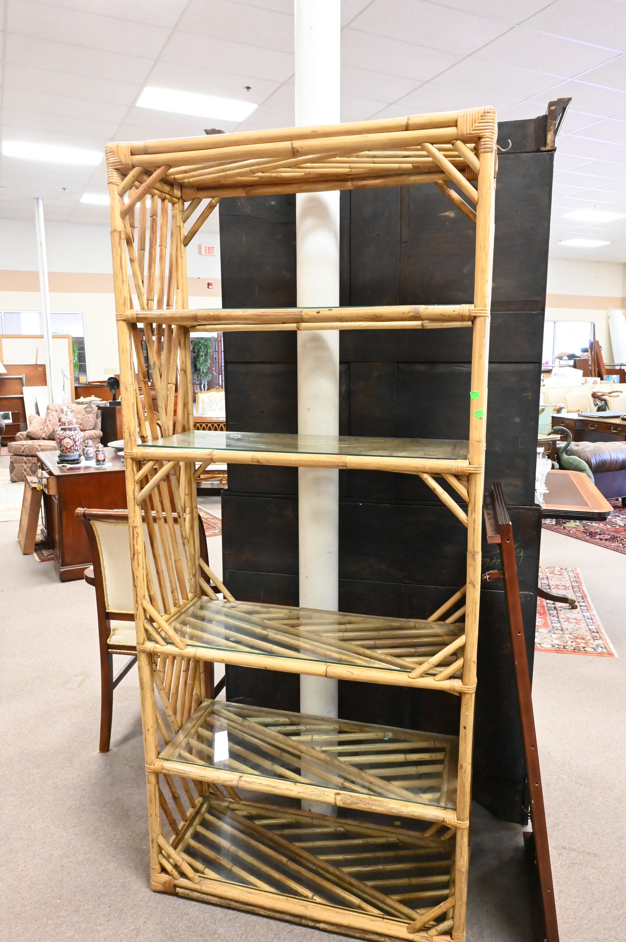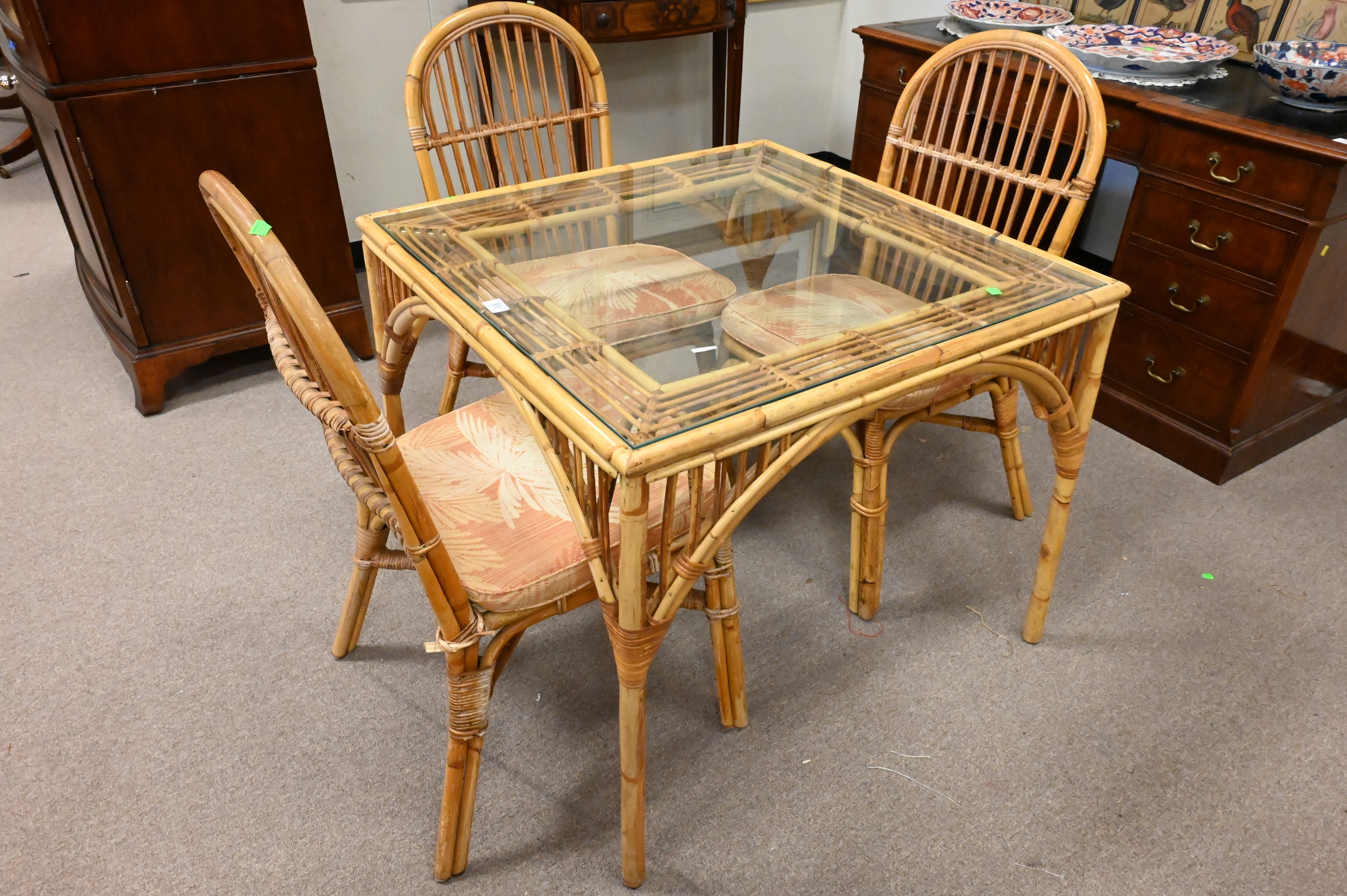 Bamboo Five Piece Lot, to include an etagere, three chairs, along with a glass top table, etagere height 81 inches, width 36 inches, depth 15 inches, chair height 37 inches, width 18 inches, table height 28 inches, top 33 1/2″ x 33 1/2″