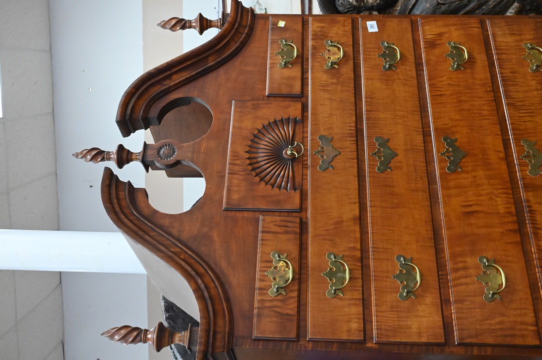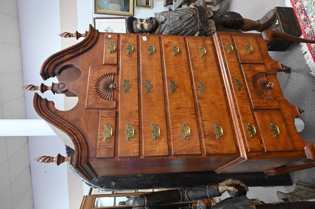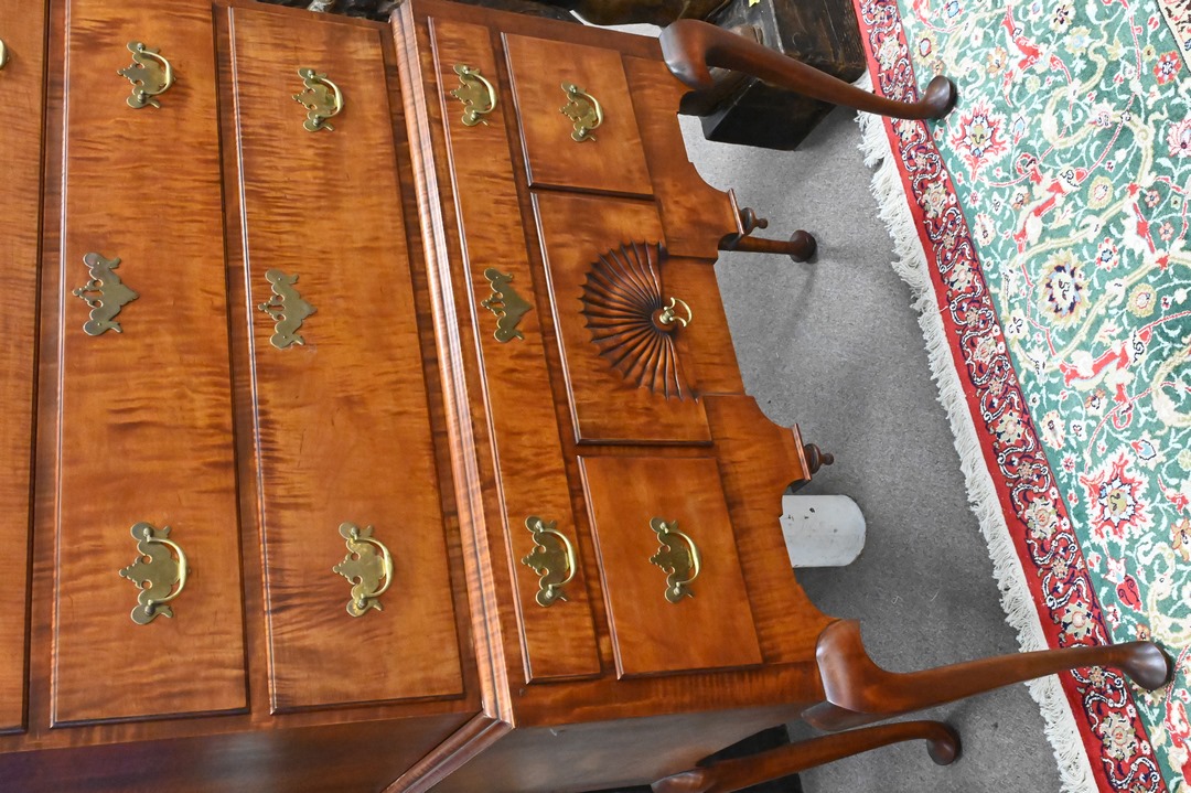 Benchmade Tiger Maple Queen Anne Style Highboy, having bonnet top, in two parts, cedar bottom drawers, height 87 inches, width 38 inches.