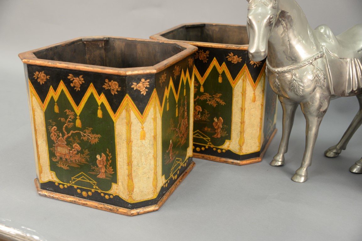 Lot 203: Four Oriental style decorated pieces including pair of Chinoiserie decorated waste cans, small cabinet, and large metal horse.