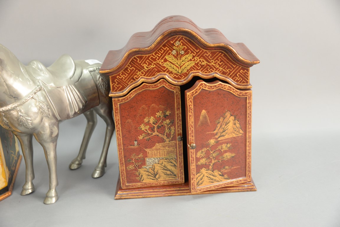 Four Oriental style decorated pieces including pair of Chinoiserie decorated waste cans, small cabinet, and large metal horse.