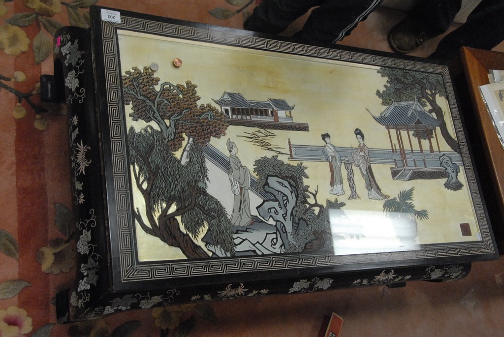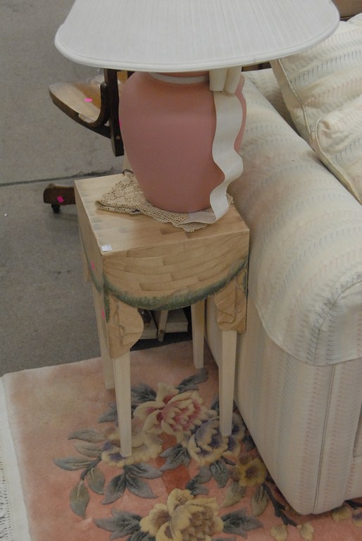 Lot 203: Four piece lot Oriental style coffee table, pink lamp, paint decorated stand, and marble top stand.
