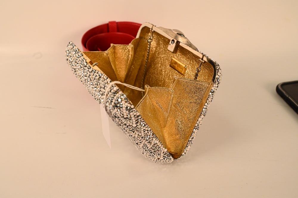 Lot 203: Judith Leiber Jeweled Clutch Purse, having silver and white beads.
