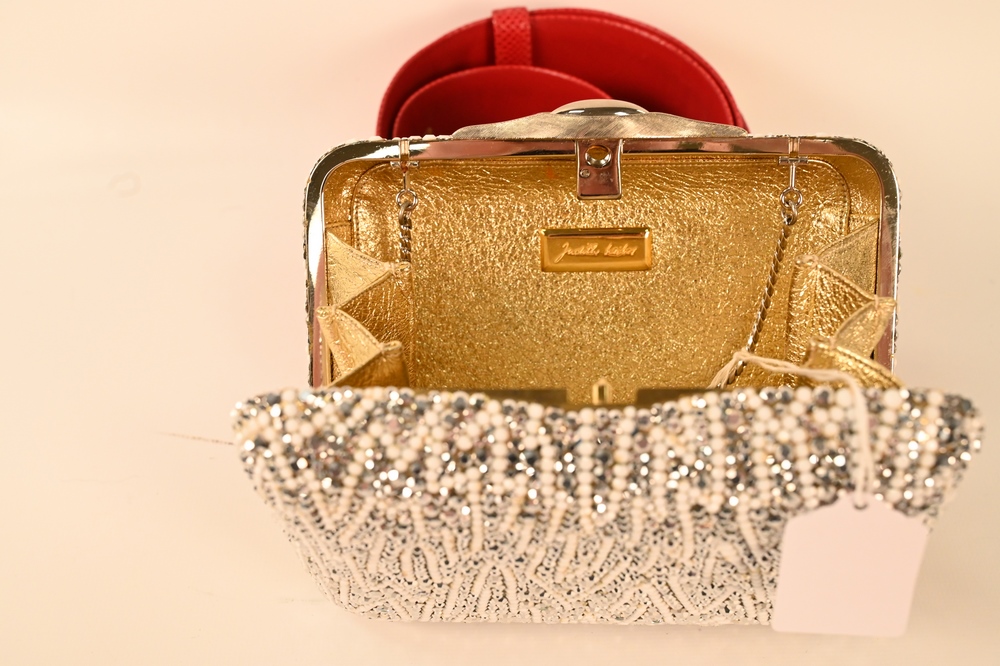 Judith Leiber Jeweled Clutch Purse, having silver and white beads.