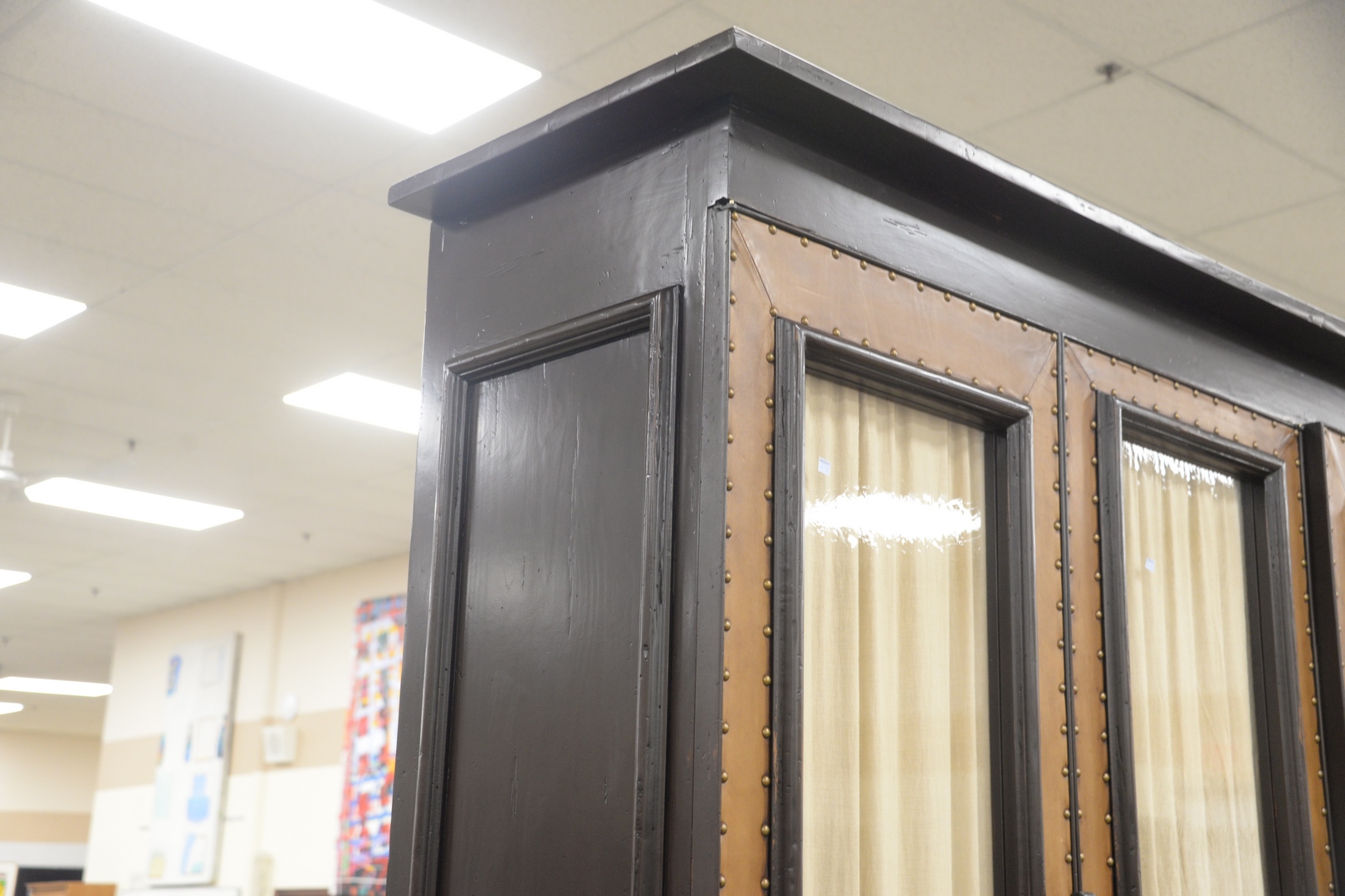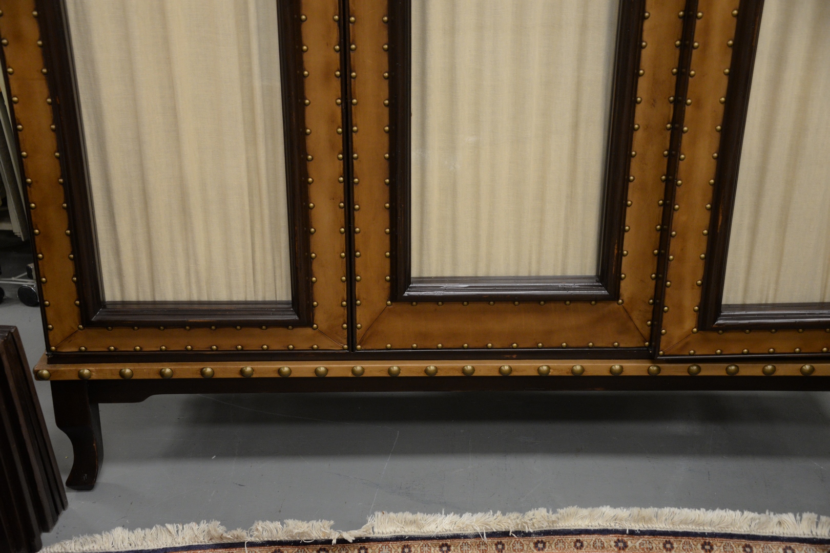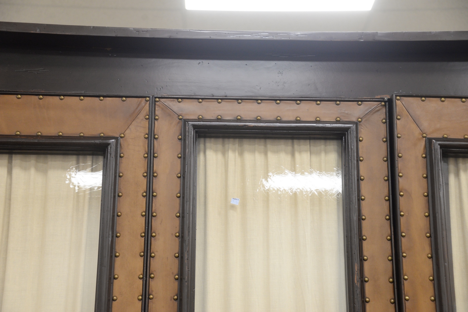 Lot 203: Large Bausman and Company Three-Door Cabinet, having leather and tac, framed glass doors and shelves on interior, height 102 inches, width 78 inches, depth 24 inches.
