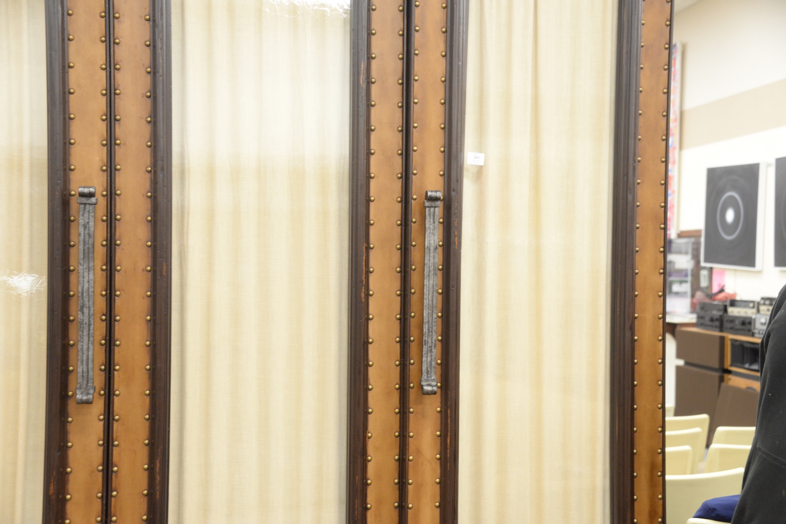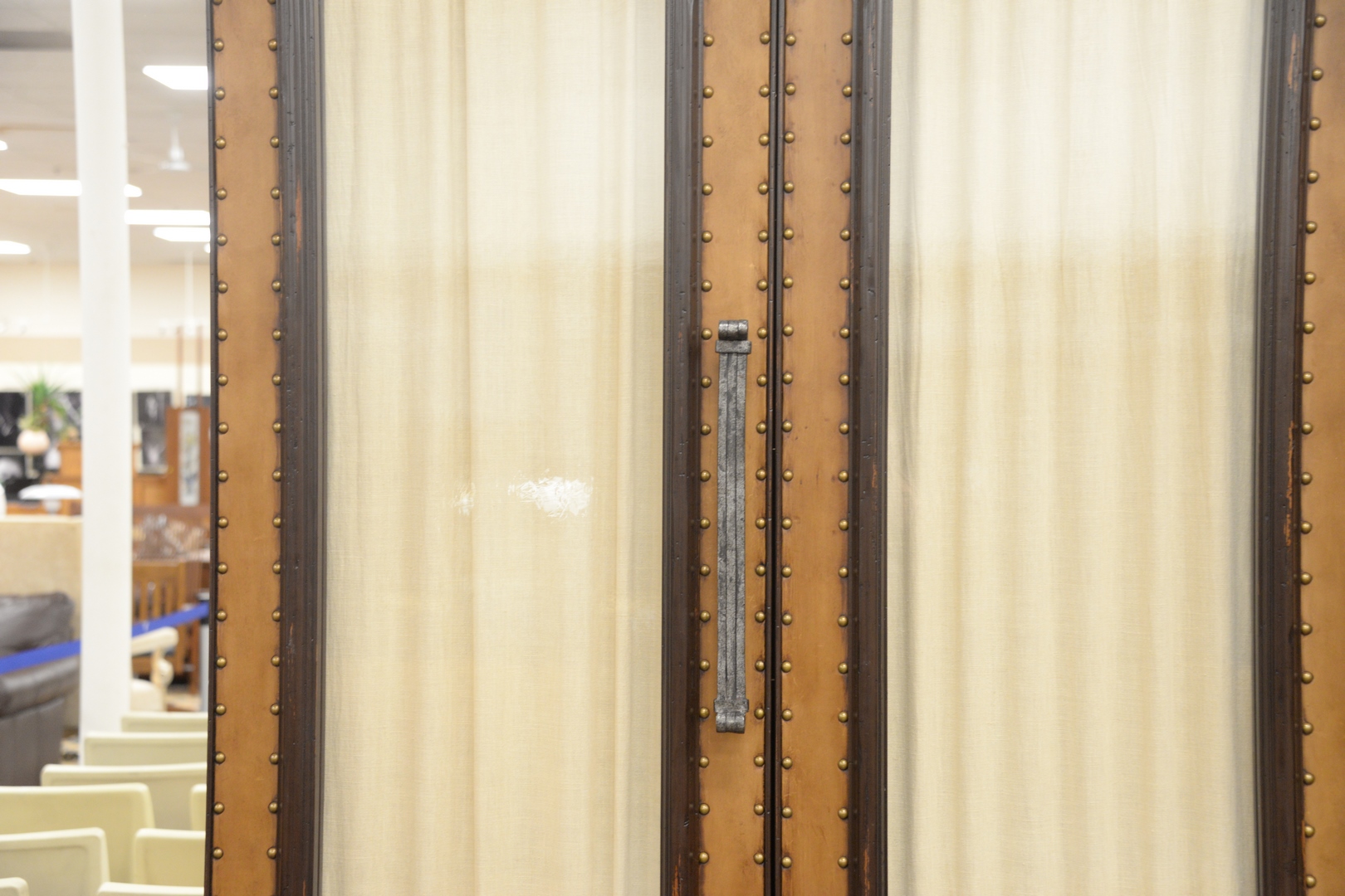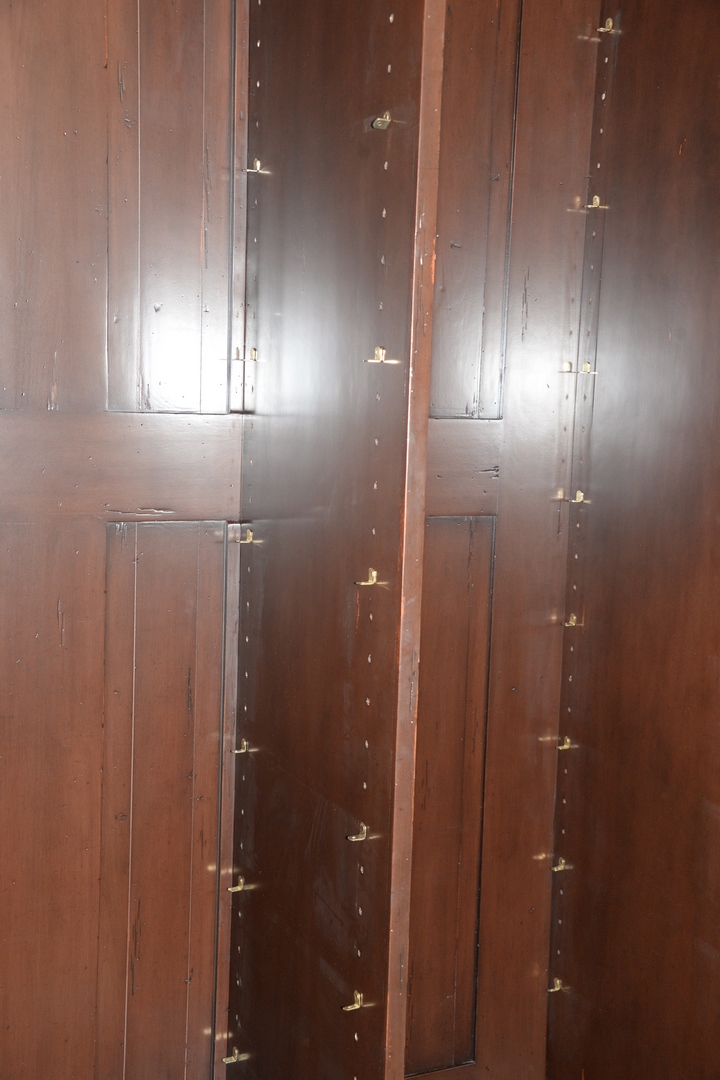 Lot 203: Large Bausman and Company Three-Door Cabinet, having leather and tac, framed glass doors and shelves on interior, height 102 inches, width 78 inches, depth 24 inches.
