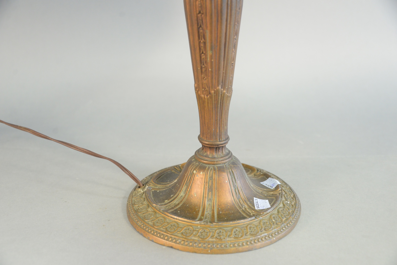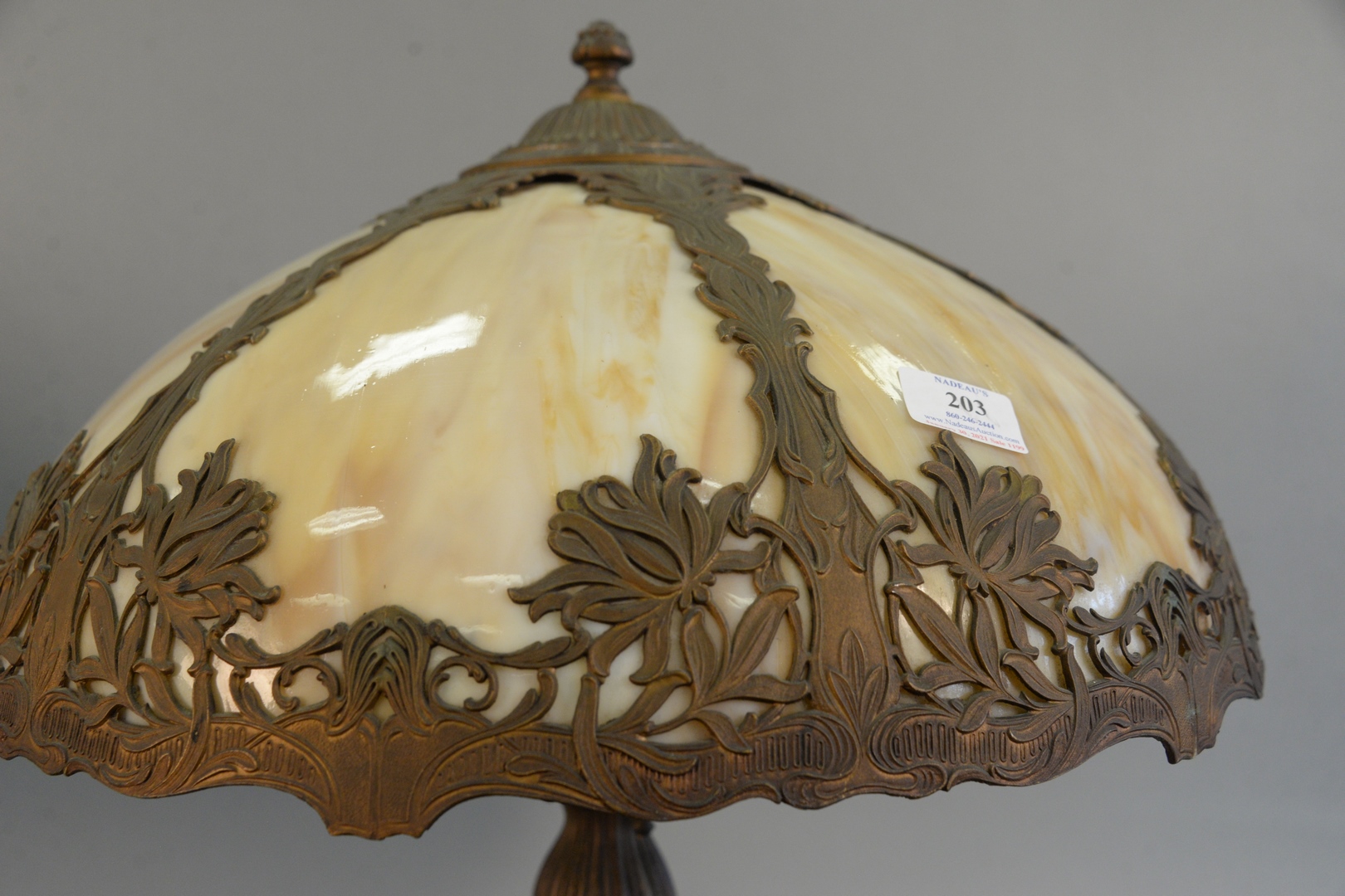 Lot 203: Large Caramel Slag Glass Table Lamp six panels with floral design height 23 inches, diameter 18 1/2 inches Provenance: Thirty-five y…