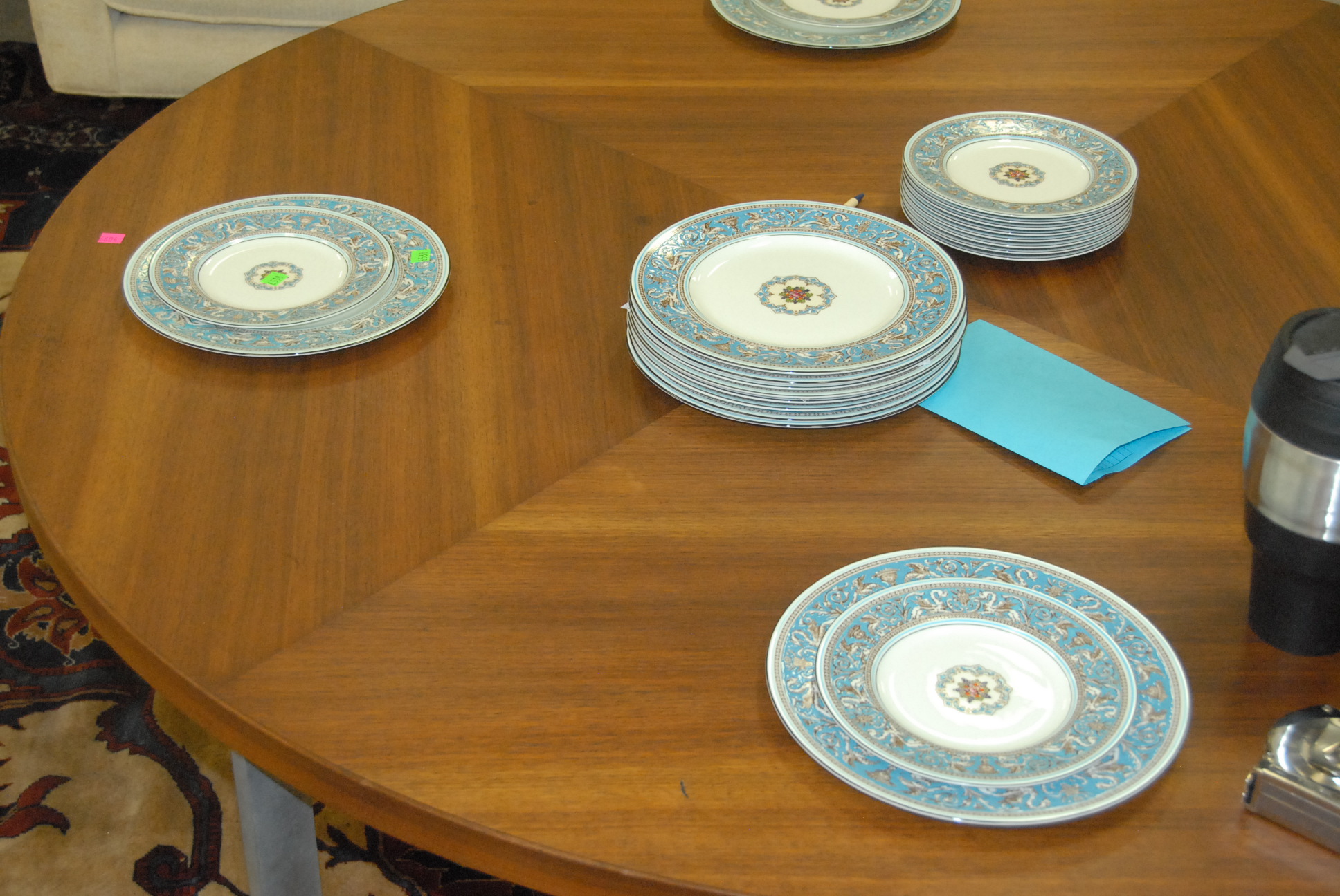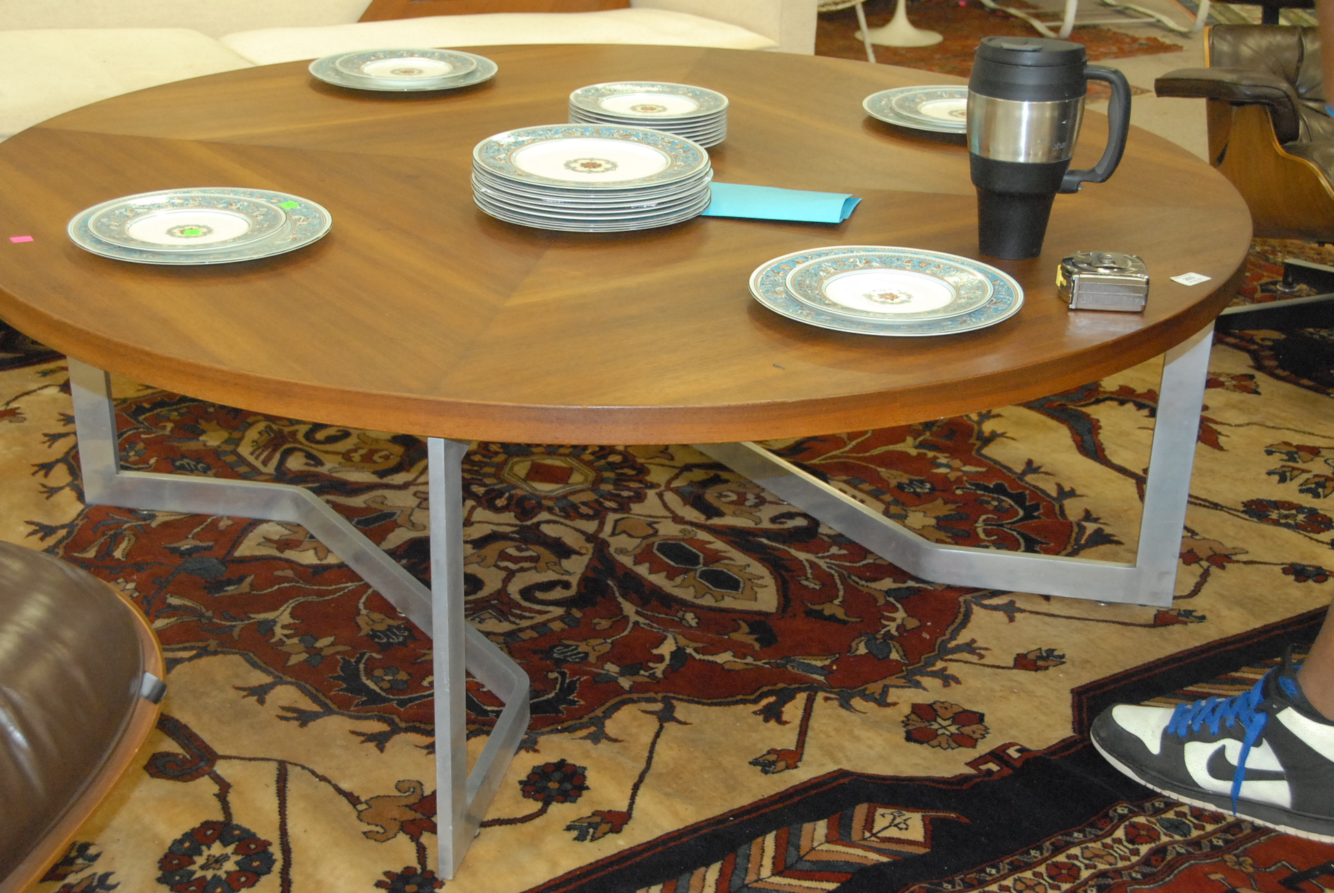 Large modern coffee table in the manner of Ward Bennett for Lehigh having a quartered, book matched walnut top set on two bracket shaped bases of solid aluminum, ht 21, dia. 60.