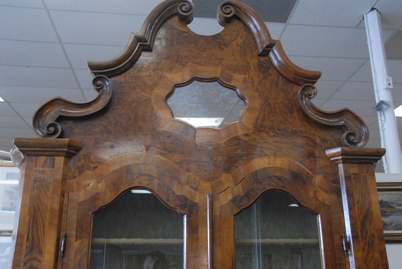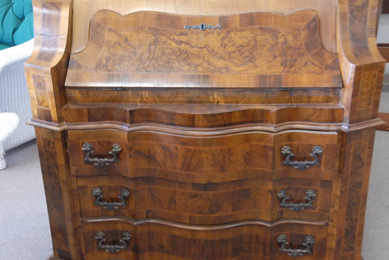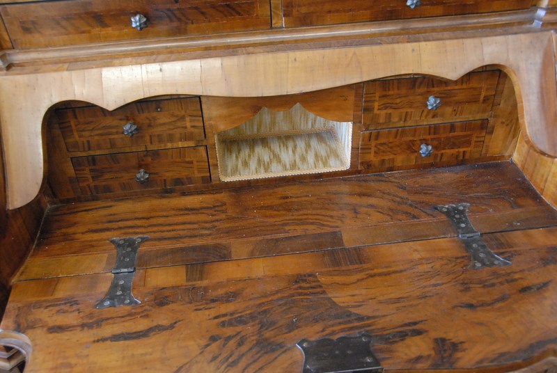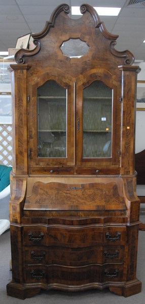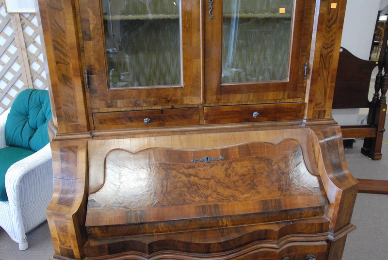 Lot 203: Reproduction inlaid secretary desk in style of North German or Dutch, mid to late 20th century. ht. 8ft.6in. wd. 49 1/4in.