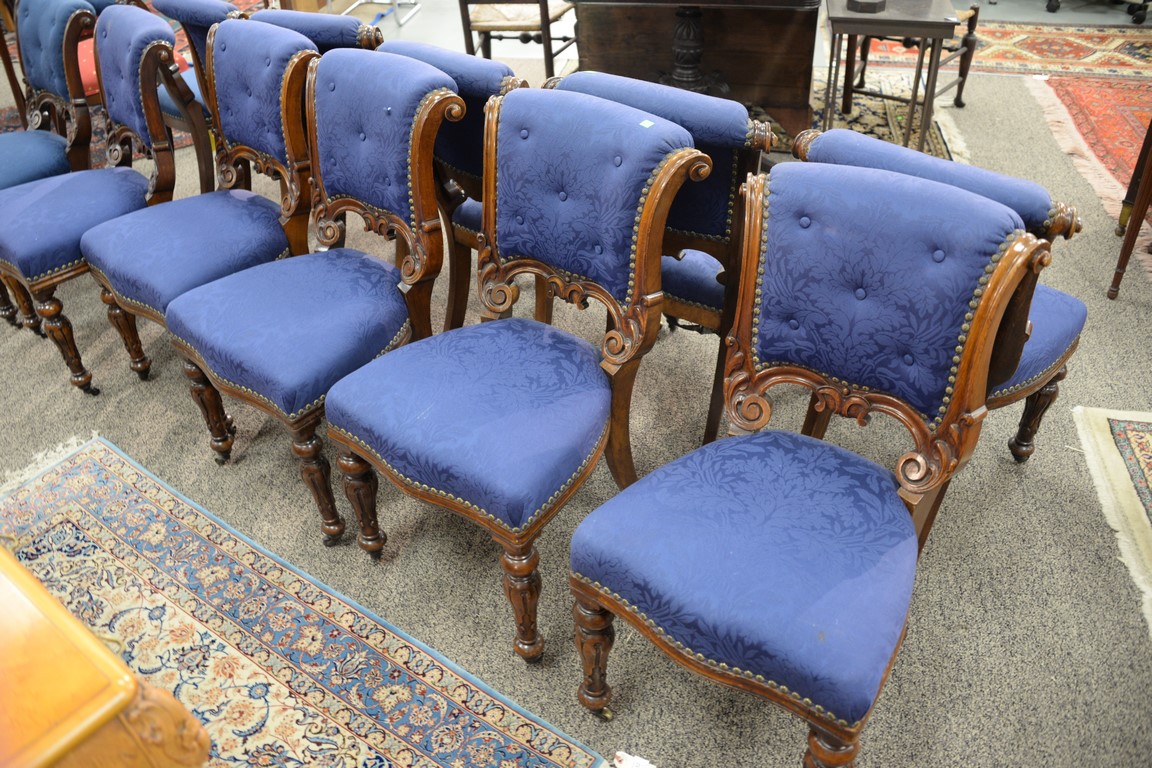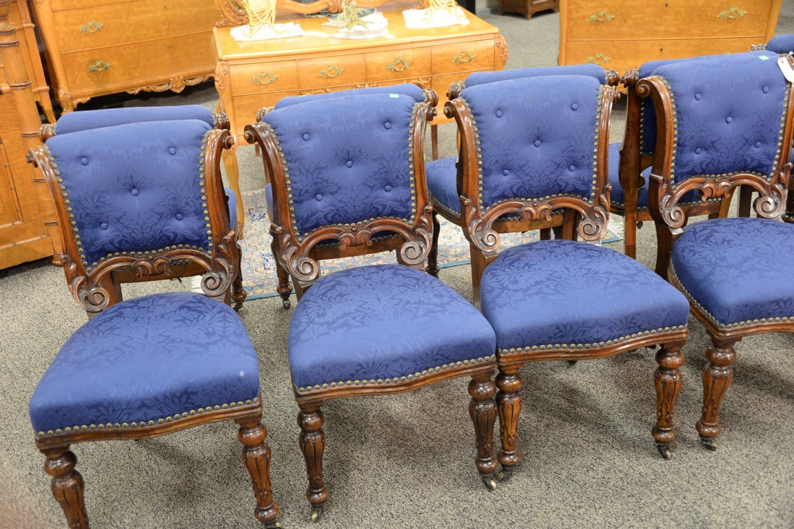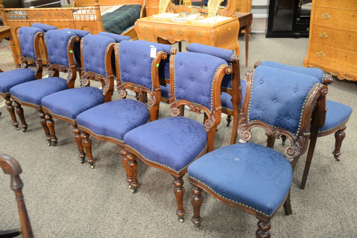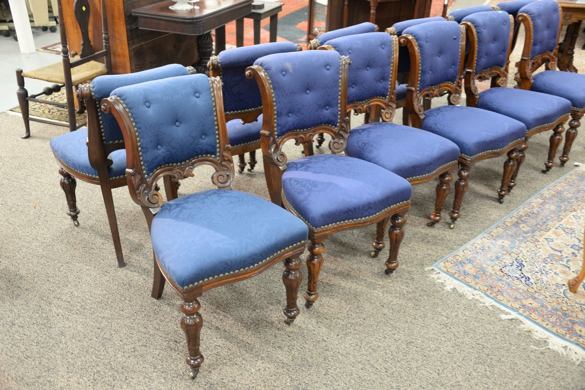 Set of twelve walnut Victorian side chairs having upholstered backs and seats on carved legs.